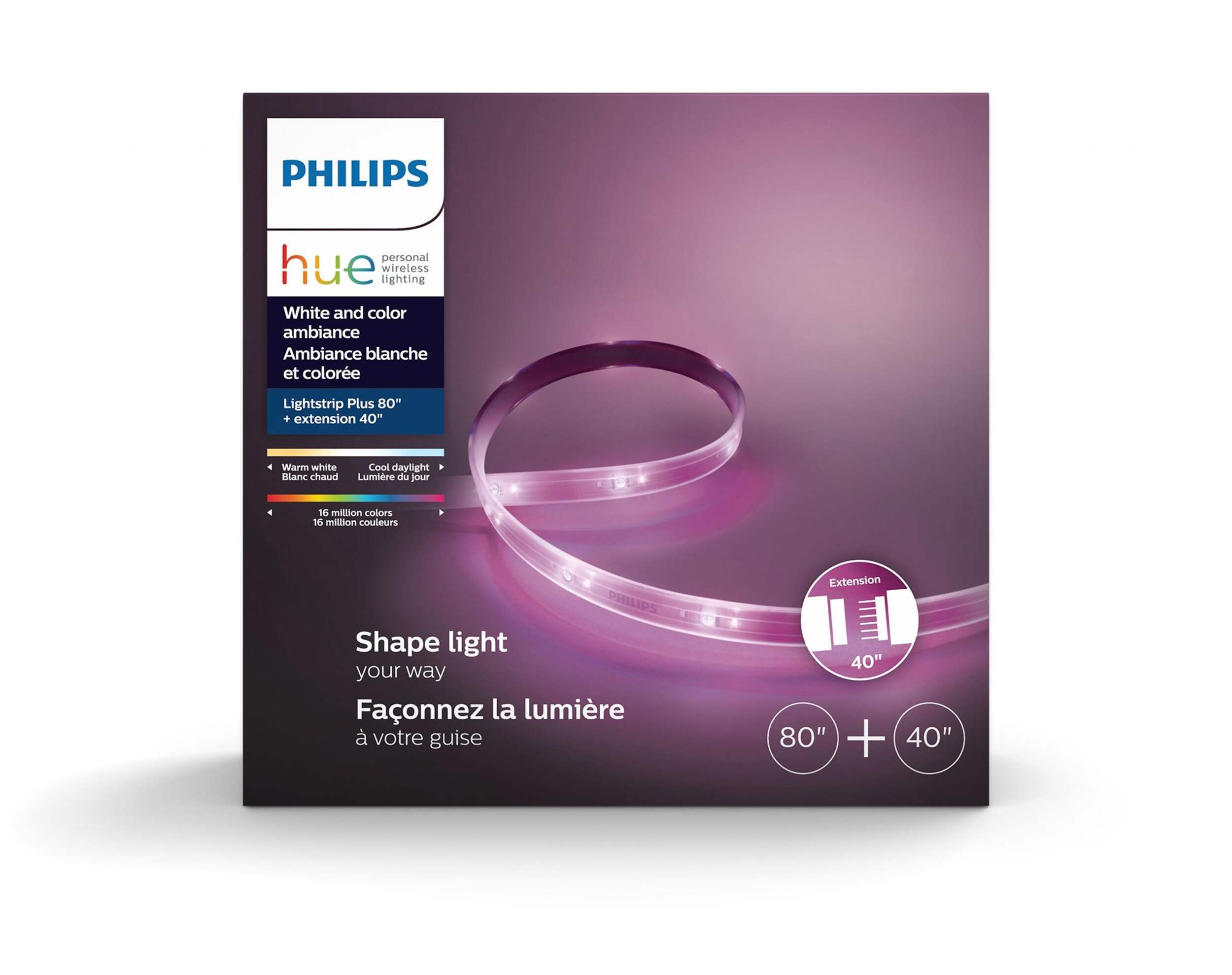Extend your Philips Hue Lightstrip Plus up to 33' (10 m) by adding 40" (101.6 cm) Philips Hue White and Colour Smart LED Lightstrip Plus Extensions (CT#: 052-9758) to cover larger surfaces and enable wider applications
