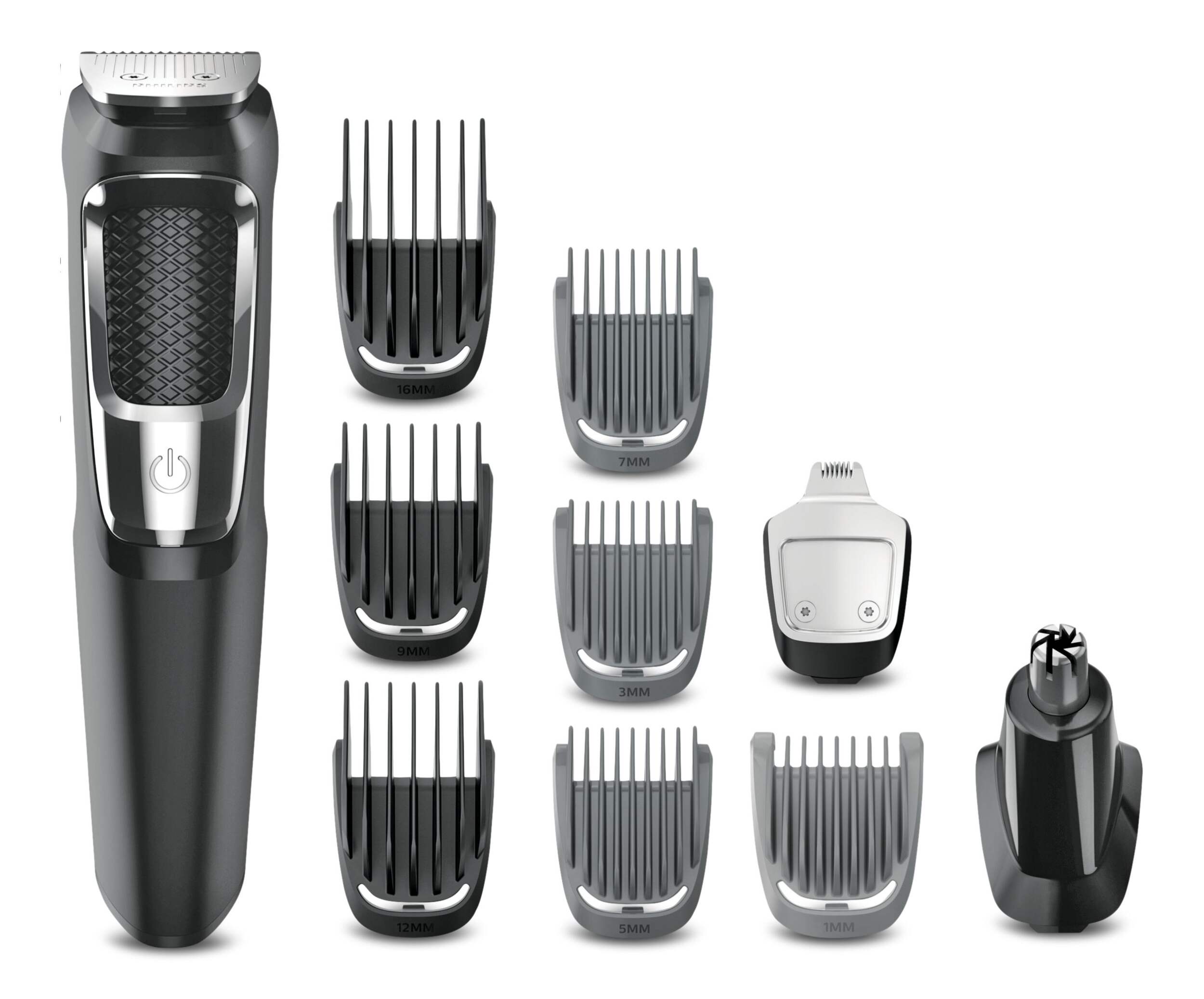 Includes; Full-size steel trimmer, narrow steel detailer, nose and ear trimmer, 3 hair cutting guards, 3 beard trimming guards, stubble trimming guard, accessory storage bag