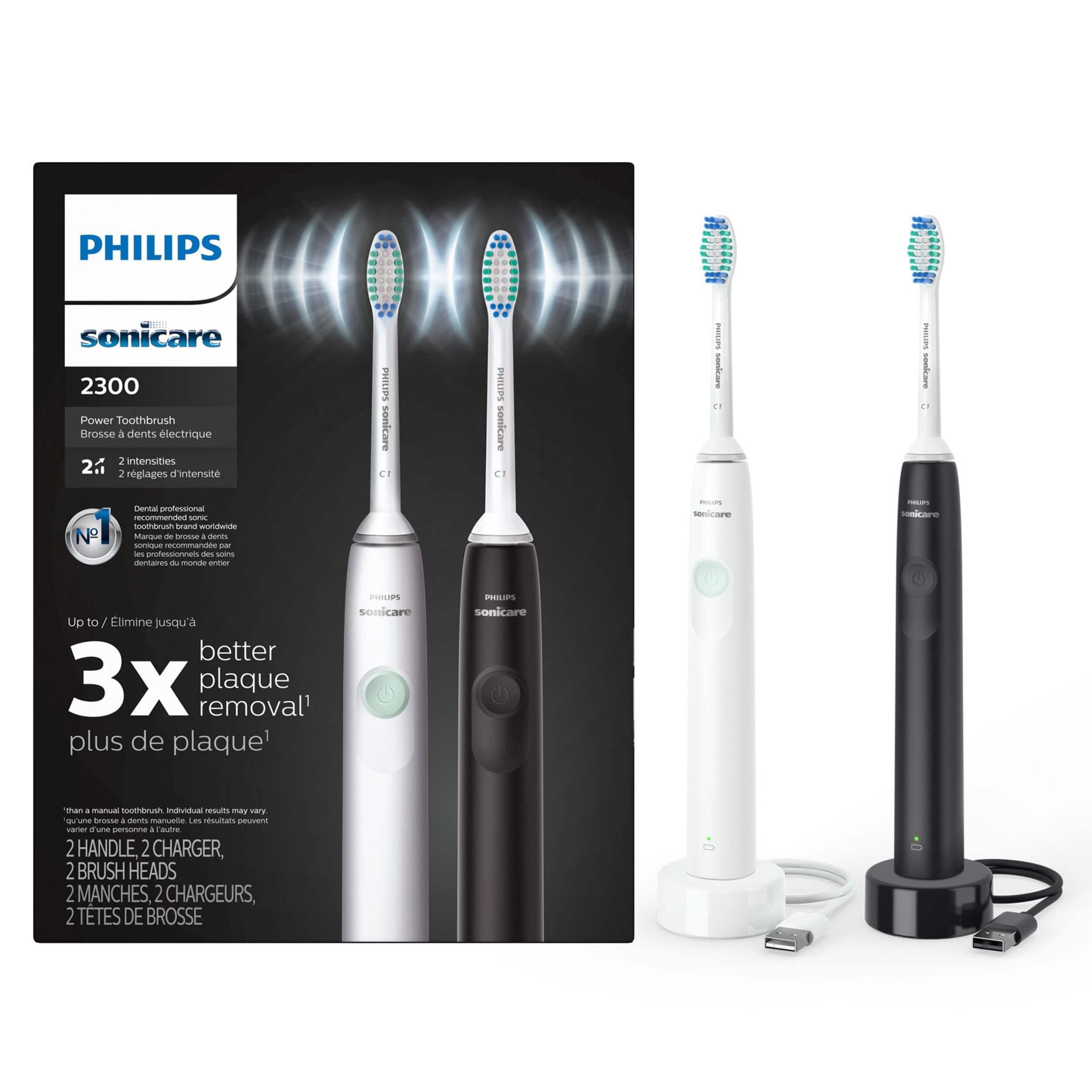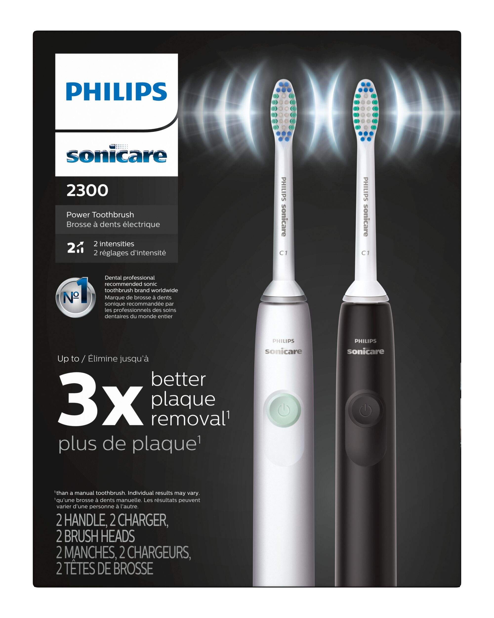 Maintain your dental health with the Philips Sonicare 2300 Rechargeable Electric Power Toothbrush Kit. This dual-pack kit helps you maintain a complete dental care program for your teeth and gums to contribute to overall good health. The powerful electric toothbrushes in this kit remove 3x more plaque than a manual brush and features easy click-on brush heads that should be replaced every three months.