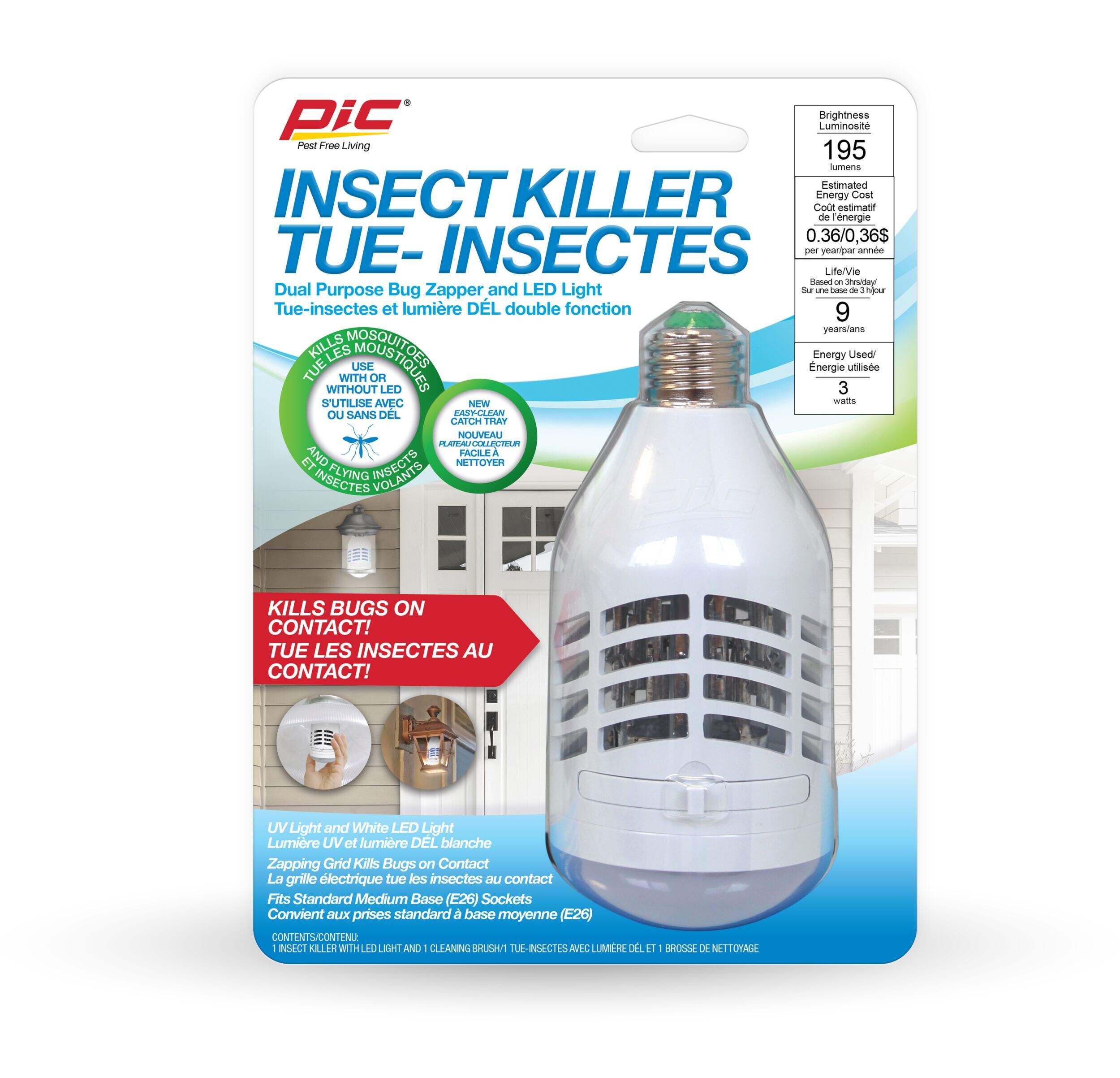 The PIC Insect Killer is a dual-purpose bug zapper and LED light compatible with most standard sockets. The zapper utilizes UV light to draw in flying insects. The electric grid kills bugs on contact, and the bright LED light is suitable for illuminating surrounding areas. The bug zapper/UV works with or without the LED by operating the light switch to your fixture.