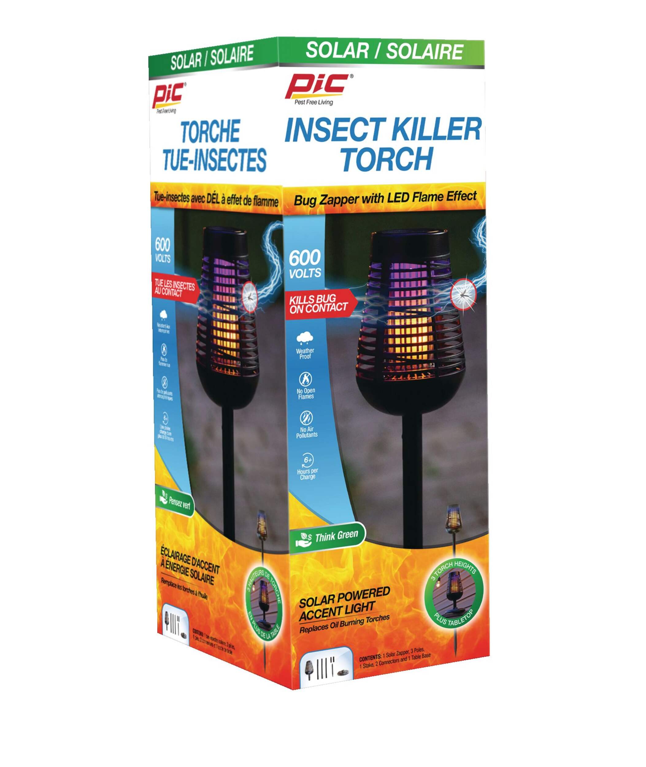 The latest innovation from PIC helps with flying insects using the power of the sun as it works at night for up to 6 hours on a full charge. With a flickering flame LED, the solar insect killer torch looks like an open flame without the hazard of one. The torch can be used as a tabletop unit using the provided base or three different heights with stake and pole segments.