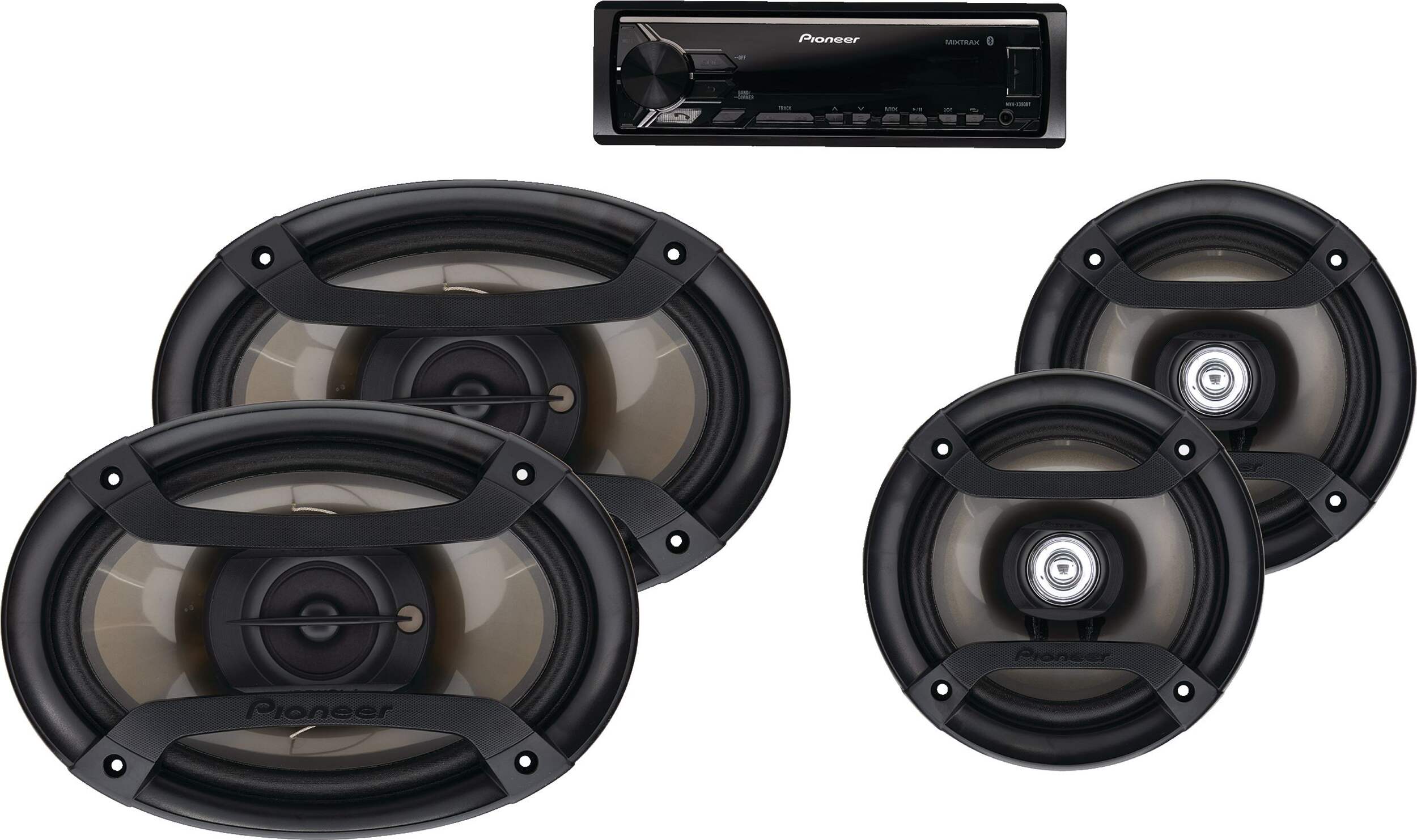 The Pioneer Bluetooth Car Audio Bundle Package offers a stereo receiver paired with four speakers. The receiver features built-in Bluetooth for hands-free calling and audio streaming. It's compatible with Pioneer's ARC app, iPod/iPhone, Android smartphones, Spotify, and Pandora. It also includes a front USB input, AUX audio input, and wired remote input. Two 6.5-in 2-way speakers (200W max power handling) and two 6x9-in 3-way speakers (220W max power handling) are included, and the system can be expanded with two sets of RCA outputs. The receiver also offers subwoofer control and volume output adjustment. The depth of the 6.5-in speaker is 1 3/4-in and the 6x9-in speaker is 2 3/4-in.