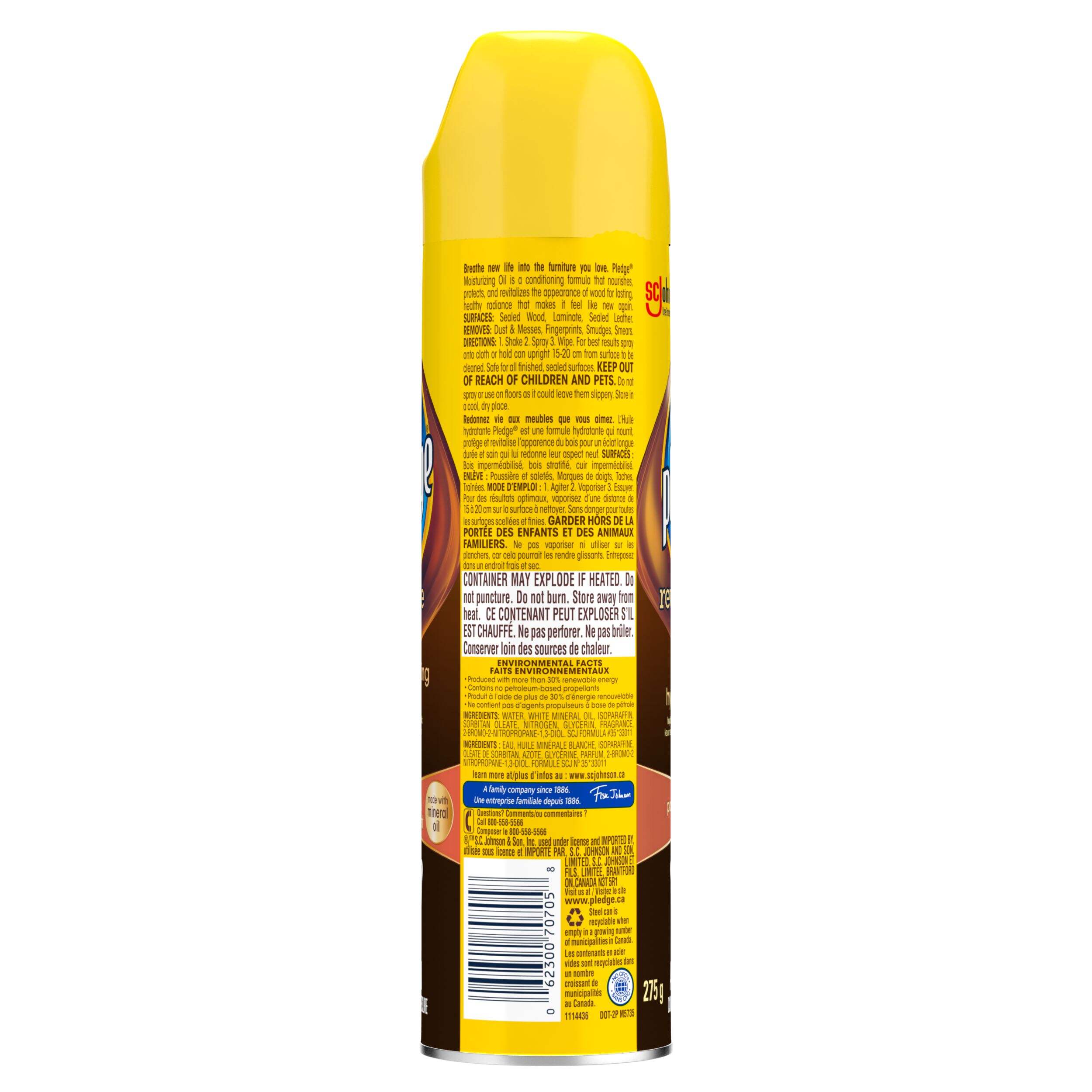 Pledge Expert Care Moisturizing Oil Spray brings your favorite pieces back to life. Formulated with mineral oils and conditioners, this furniture spray nourishes, protects, and revitalizes the appearance of furniture, leaving behind a healthy radiance that makes your pieces look like new again. Use Pledge Moisturizing Oil to revive sealed hard surfaces, including wood kitchen cabinets, windowsills, decorative trim, tables, chairs and more.