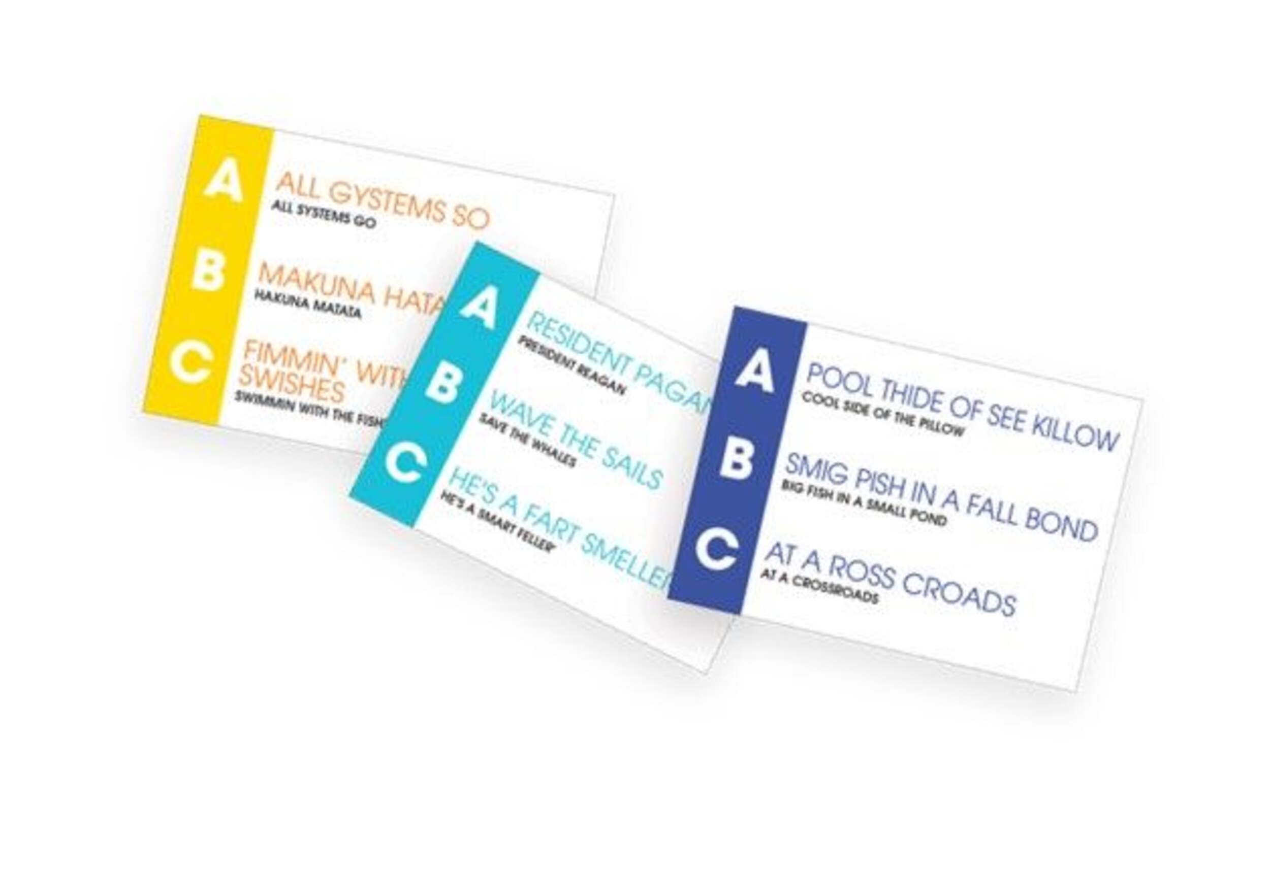 For example, if the phrase is ‘A NOSY LITTLE COOK,’ the first player to say ‘A COZY LITTLE NOOK’ collects the card for points