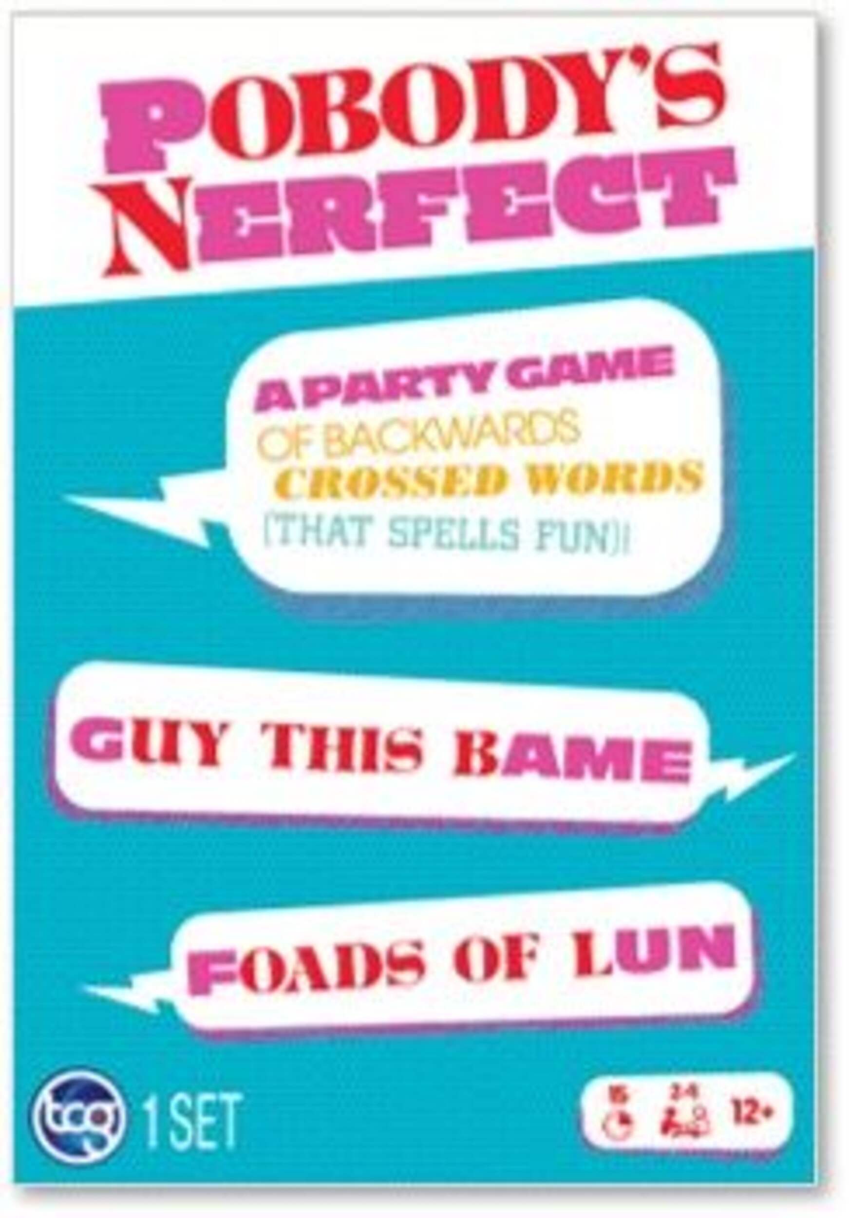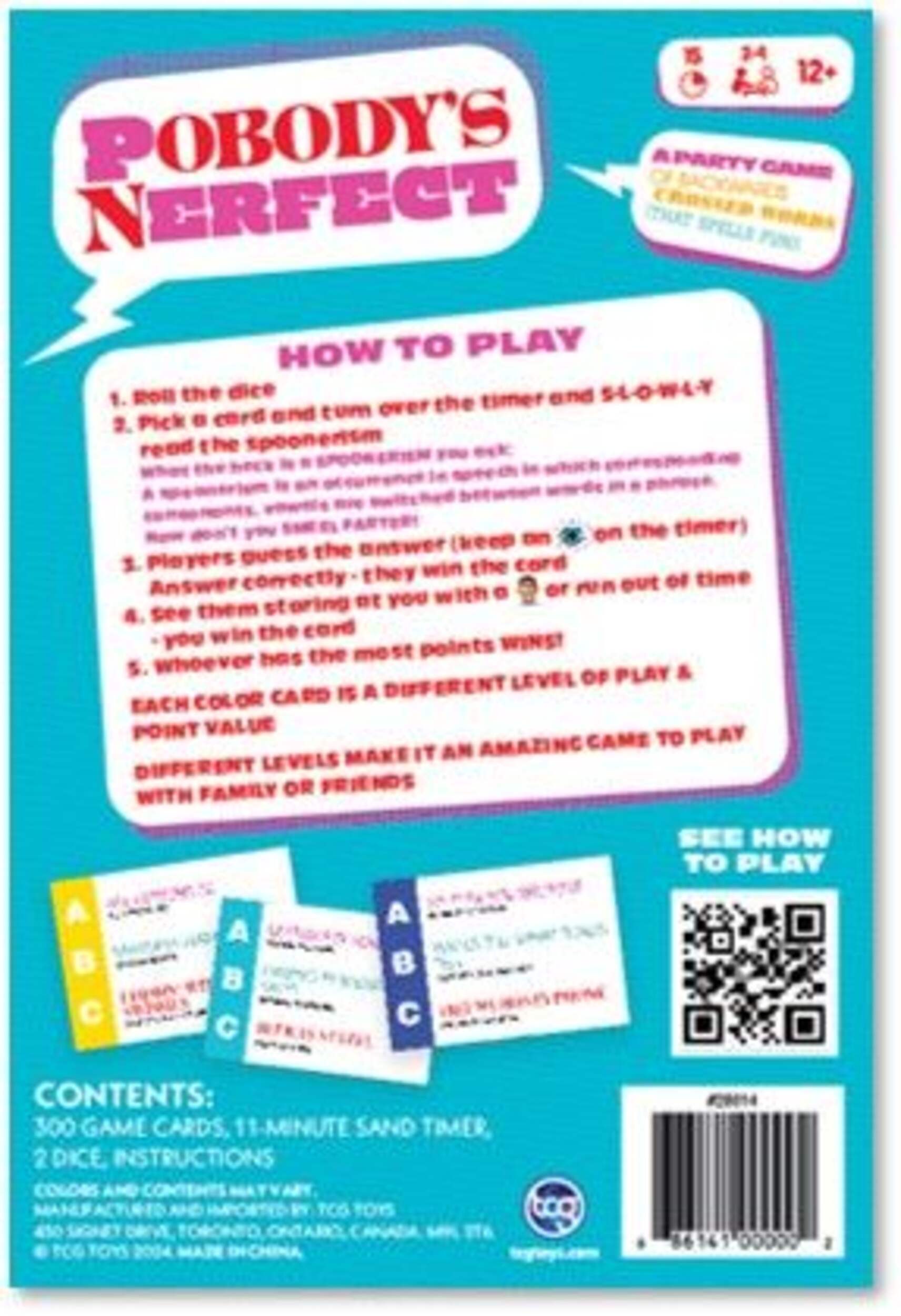 PoBody's Nerfect is a hilarious party game for ages 8 and up where players decode jumbled words and phrases—known as PoNos (short for "Spoonerisms"). These are intentionally scrambled phrases that sound amusing when spoken aloud. The objective is to correctly identify the original phrase before the timer runs out and earn the most points! PoBody's Nerfect combines wordplay, quick thinking, and loads of laughs. It's a perfect game for family game nights or gatherings with friends. Simple enough for kids but challenging for adults, PoBody's Nerfect has players of all ages giggling as they race to decipher the PoNos.