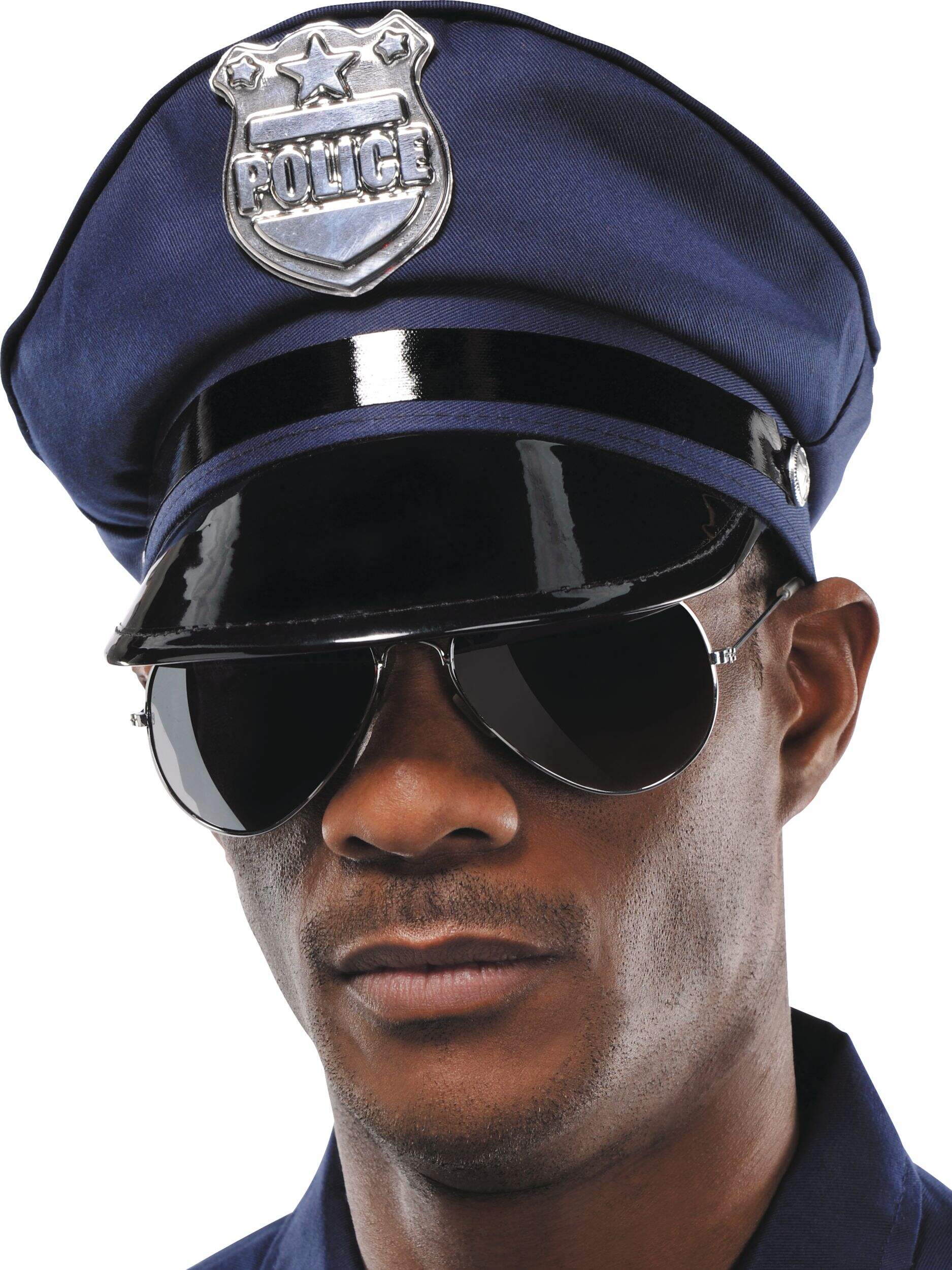 Realistic-looking navy blue police hat has a silver police badge on the front of the crown