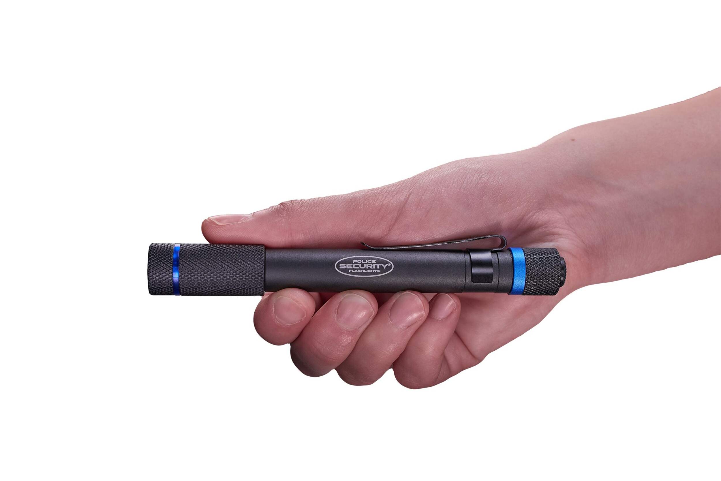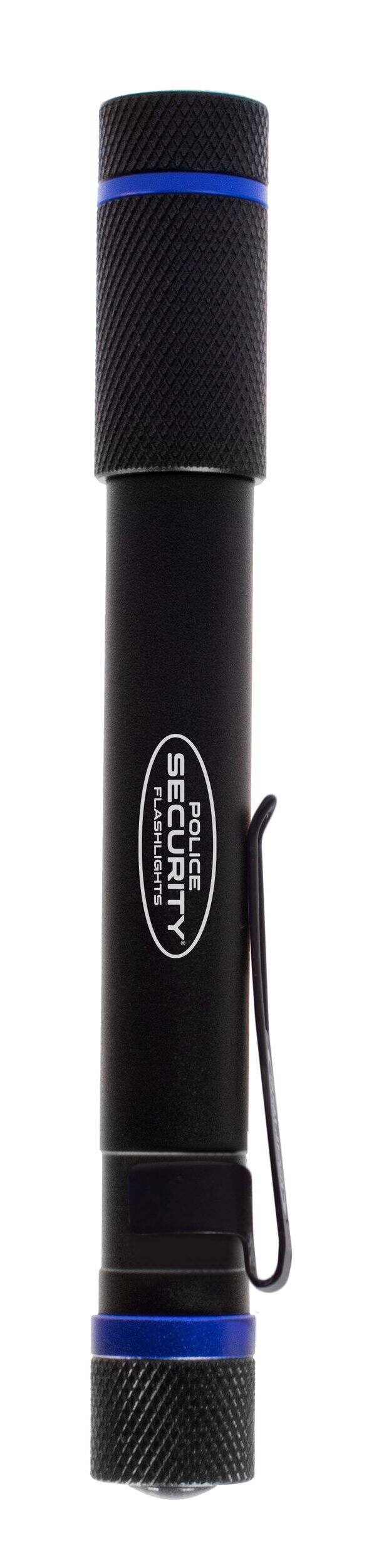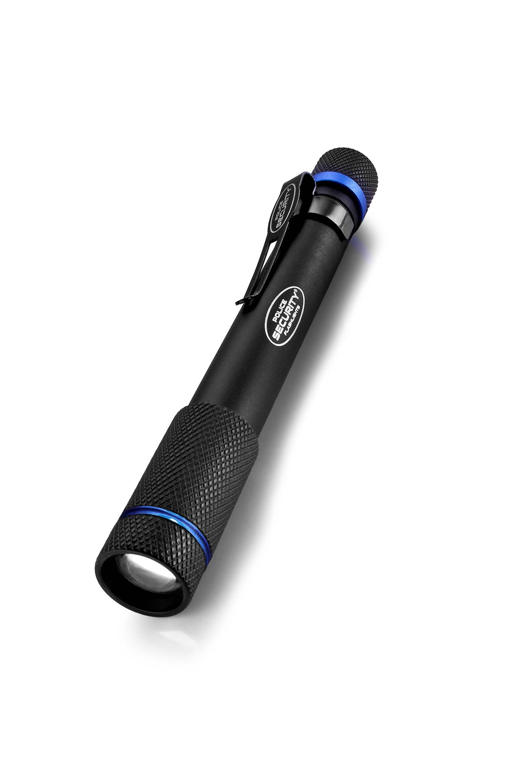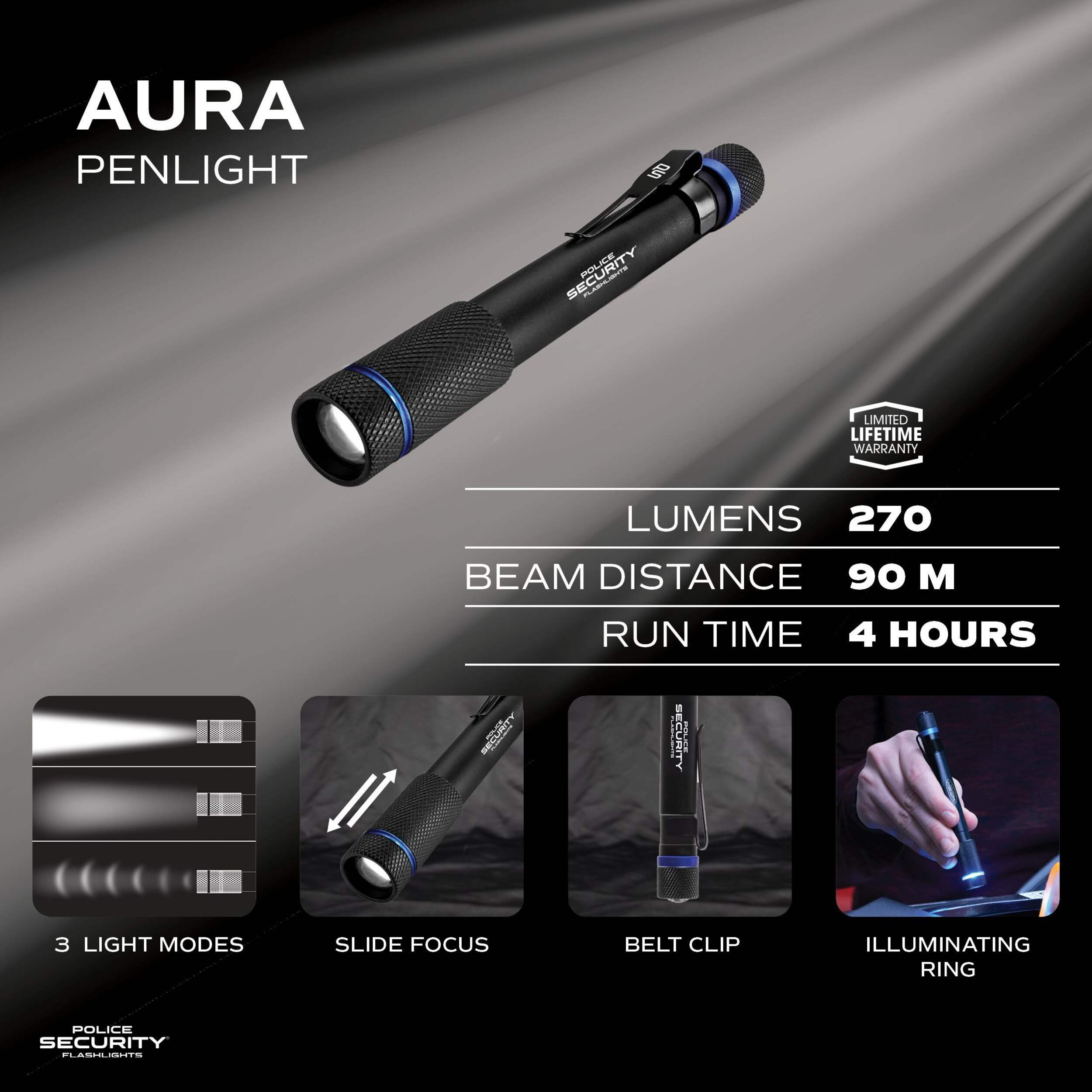Police Security’s Aura is an innovative, slide focus penlight. With its sleek design and light up bezel when focused, this flashlight fits easily in a pocket or purse. Powered by 2 AAA Police Security batteries (included), this ultra-bright 270 lumen flashlight features three settings and a 2-hour run time on high.