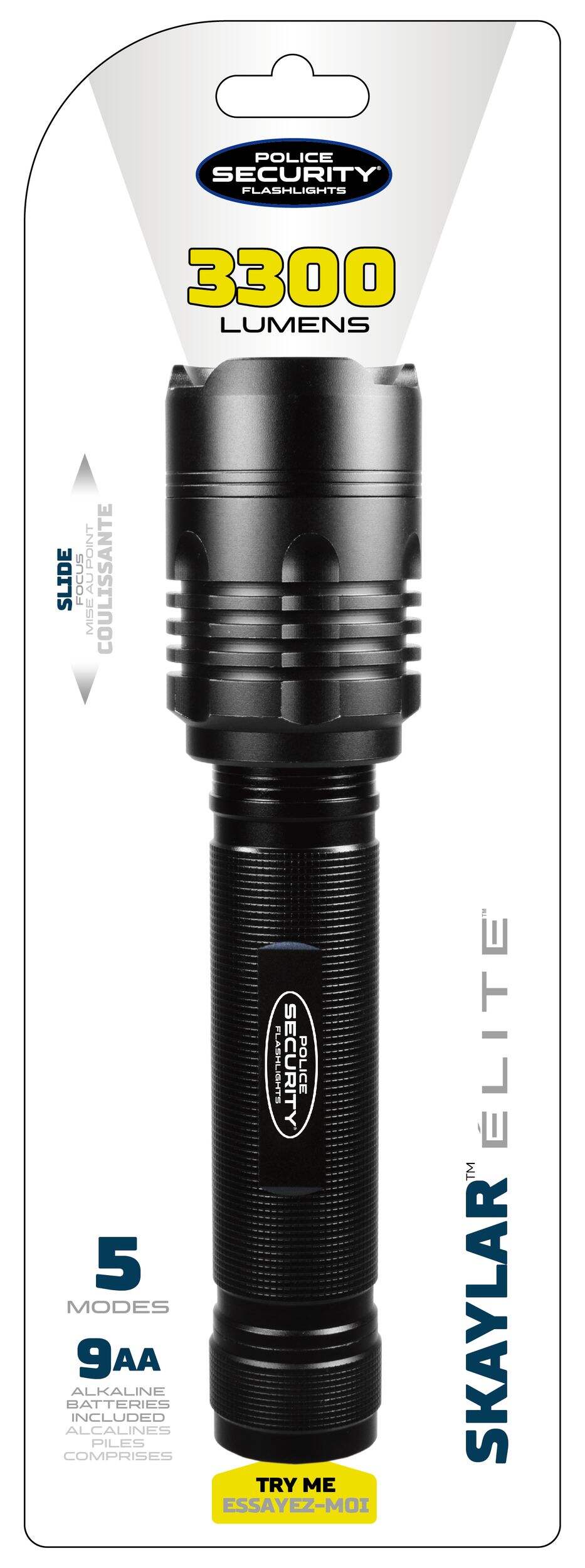 The Police Security Skylar 9AA LED Flashlight offers powerful 3300 lumens of brightness, providing intense illumination for any situation. Its durable, water resistant construction ensures reliable performance in harsh environments, making it ideal for outdoor adventures, professional use, or emergency situations. Equipped with multiple light modes, this high-performance flashlight allows you to adjust brightness as needed.
