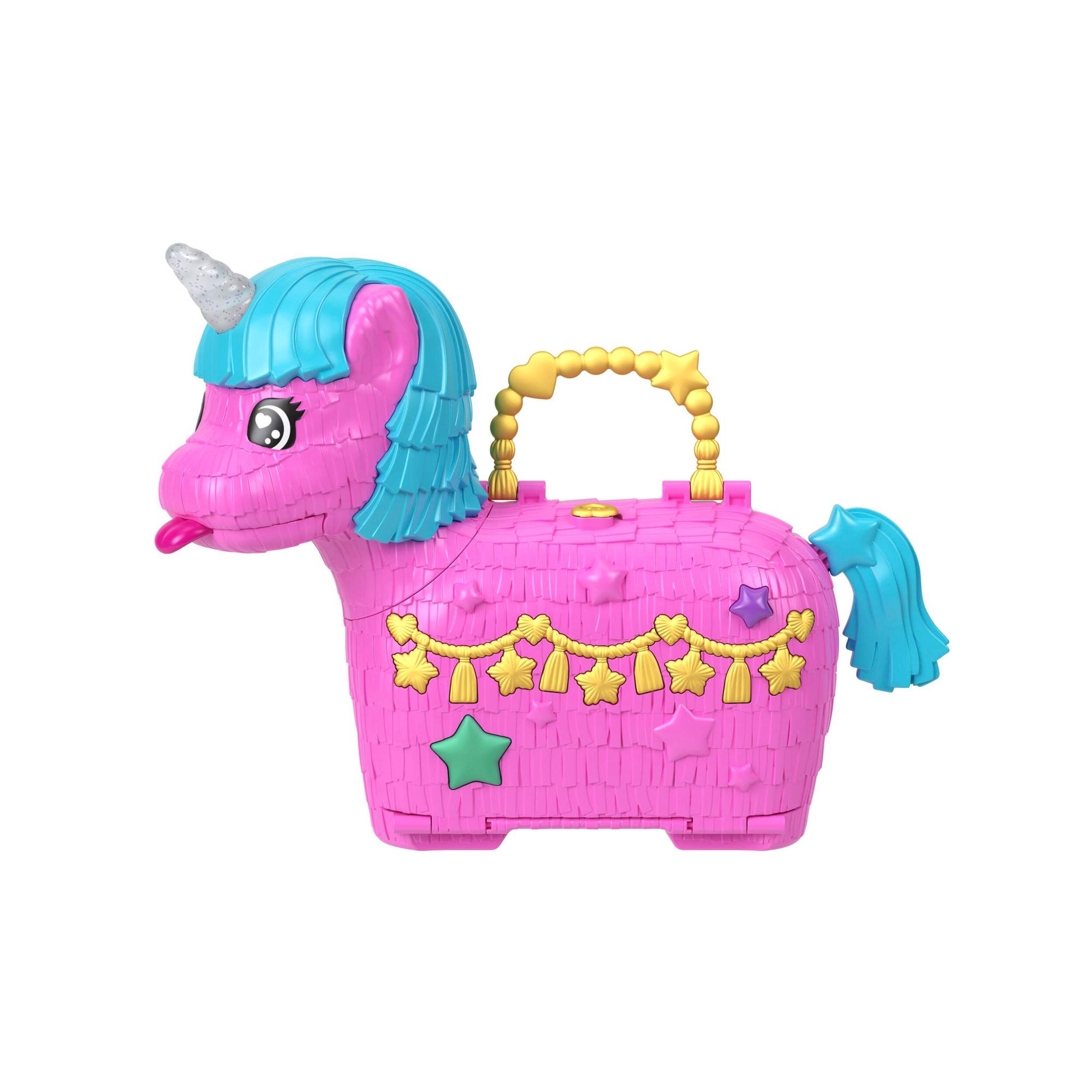 Polly's back and ready to party - it's her 35th anniversary! This Unicorn Partyland playset has an adorable unicorn pinata exterior that opens into a whimsical celebration scene. Two micro dolls and their unicorn pals can go for a hot air balloon ride, swing through the park, or share a sweet treat. But the real fun is the surprises: Pull the tail for hidden accessories, or watch rainbow 'puke' bags tumble from the unicorn's mouth filled with 25+ treasures to unbox. Kids ages 4+ will squeal with delight, especially unicorn lovers and surprise unboxers. Reload the surprises to make the magic last, close it up and take the party on the road. Polly Pocket's 35th has never looked so sparkly! Colours and decorations may vary.