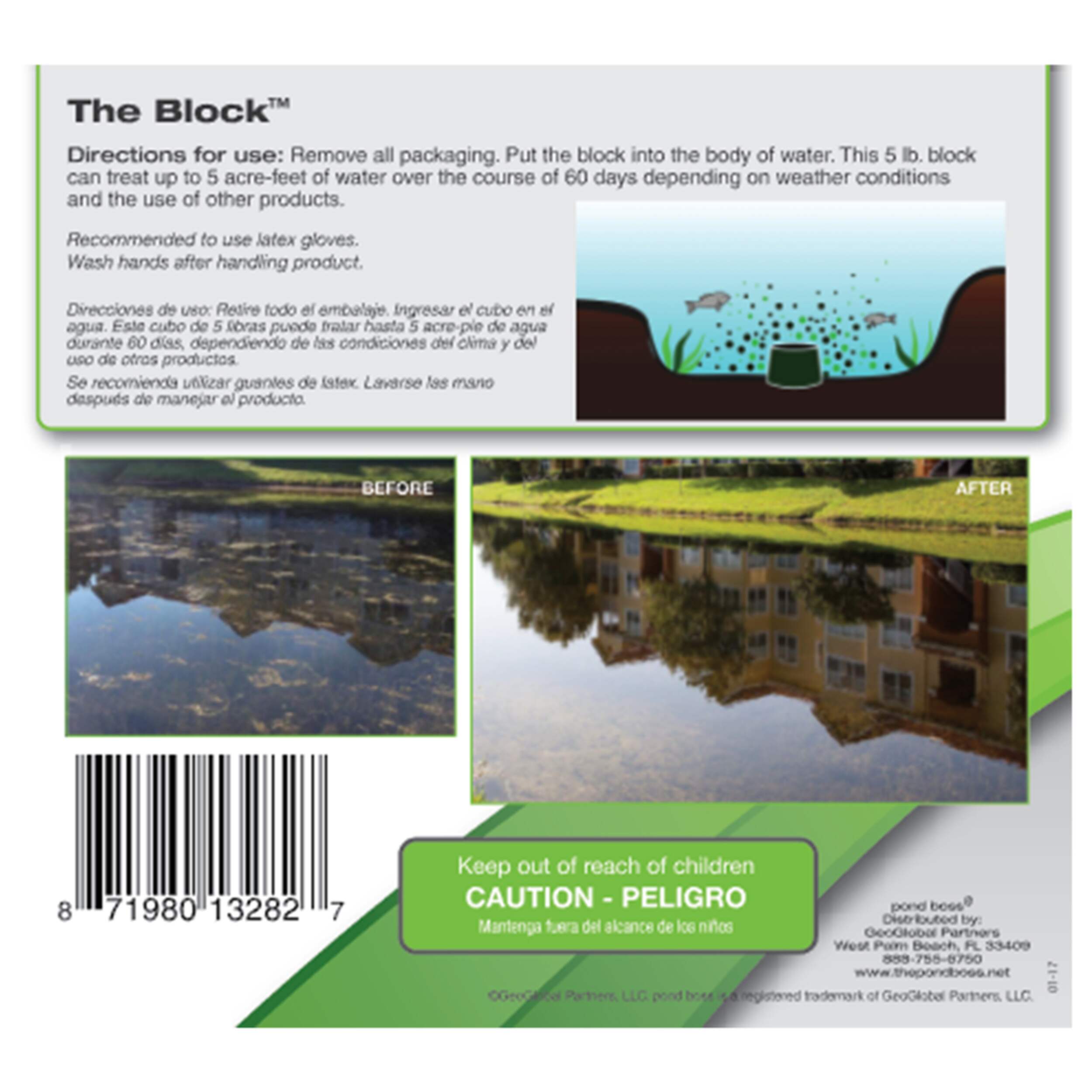 Pond Boss PRO The Block helps keep your pond clear by reducing excess nutrients. Decaying plant material and organic debris build up on the pond bottom as sludge, often causing odours and low oxygen. This time-released block contains live bacteria and enzymes that break down organic waste accumulation. Over 60 days, this 5 pound block can treat up to 1.6 million gallons of water, improving quality while clearing the water column. Results may vary depending on conditions and other products used.