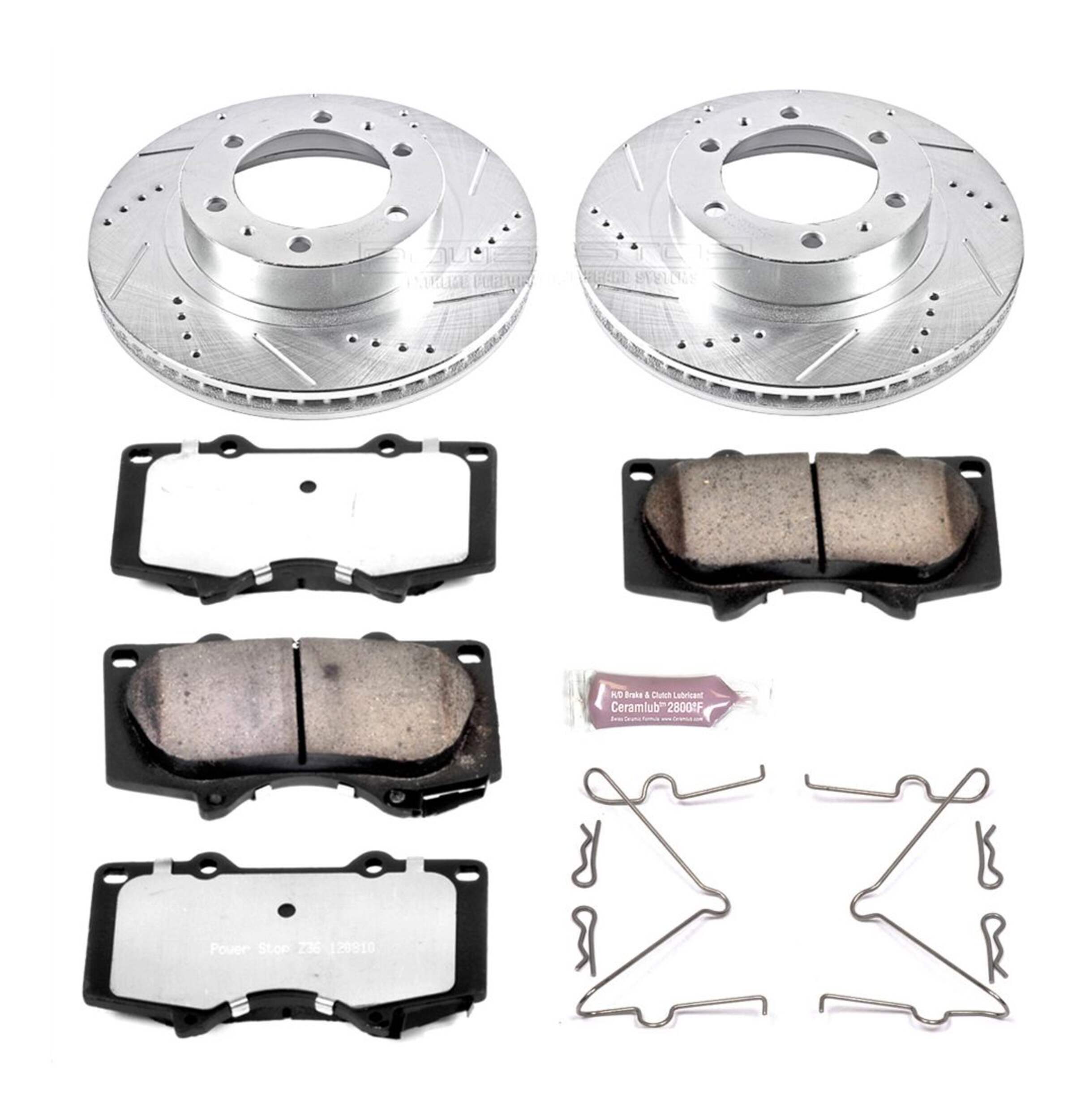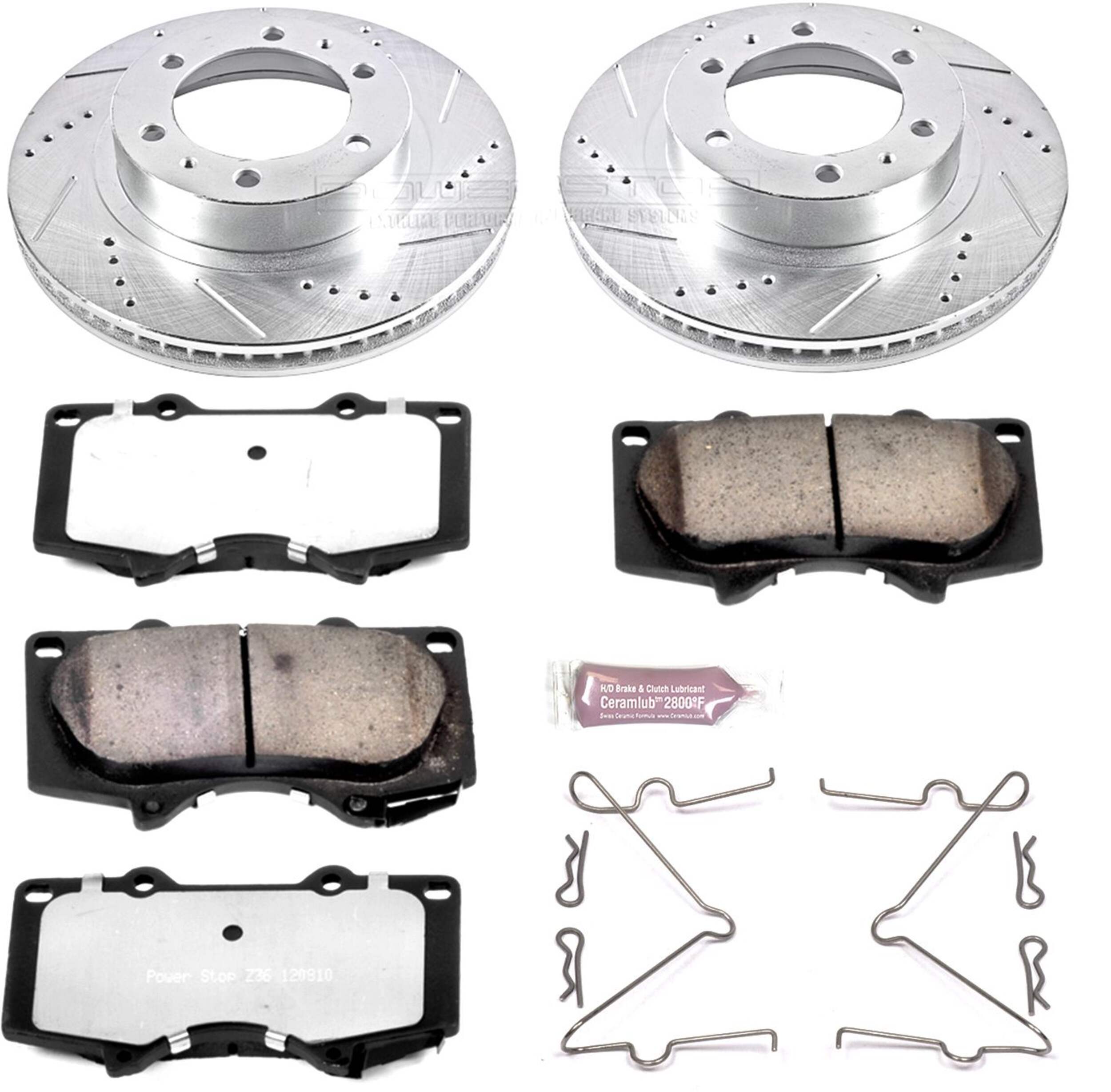 The Power Stop Z36 Truck & Tow Brake Kit provides extreme braking performance, specifically designed for trucks or 4x4s. The Z36 Carbon-Fiber Ceramic formula ensures dust-free braking, while premium stainless steel shims allow superior heat dissipation and virtually noise-free braking. The kit includes drilled and slotted performance rotors for optimal cooling, plated in zinc (excluding hub assemblies) for maximum rust protection. A ceramic brake lubricant and a premium stainless steel hardware kit are also included for your convenience.