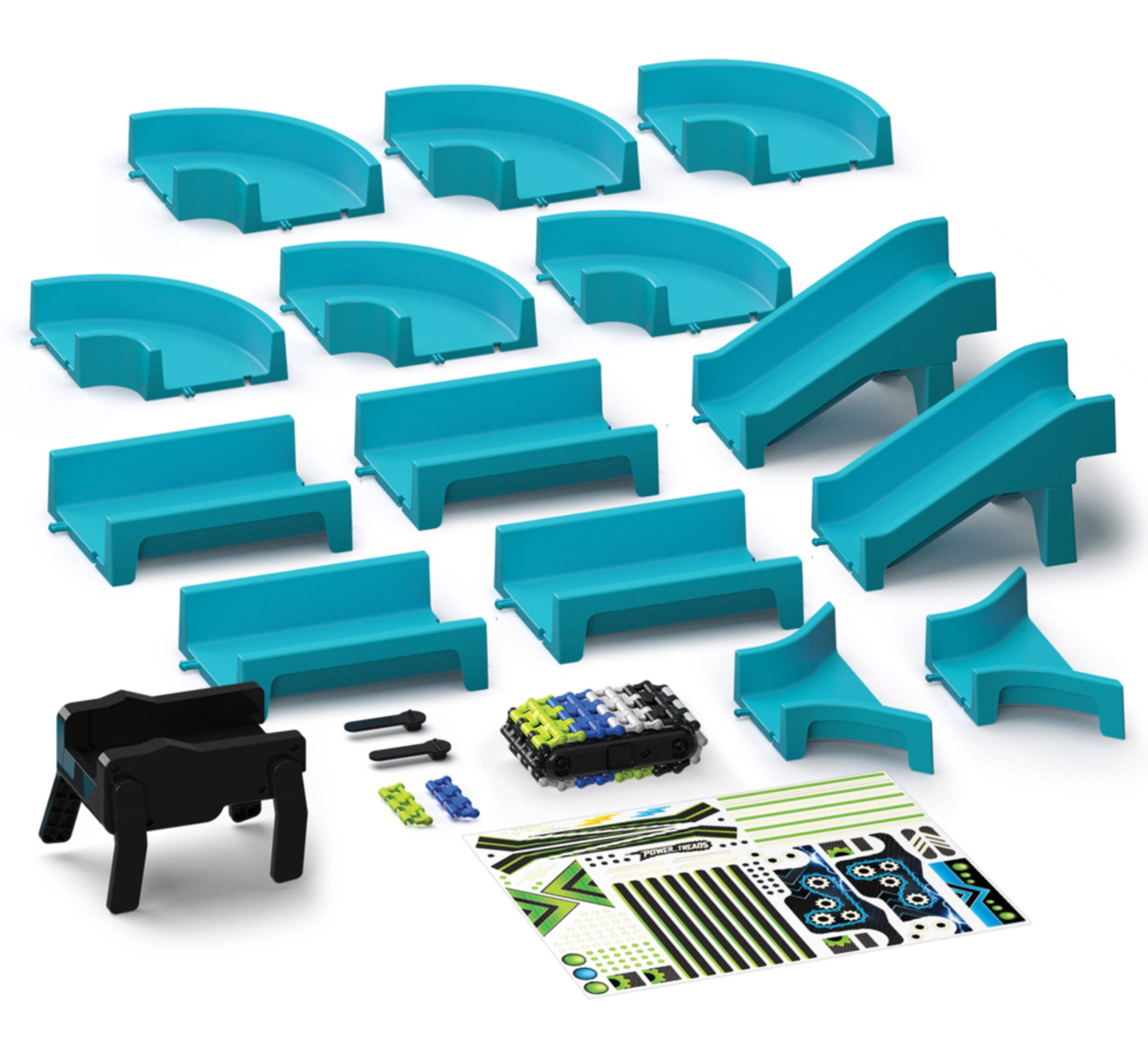 Includes: 1 x power treads ASV, 1 x power trekker, 30 + pieces including 14 piece modular track set, treads, performance boosters, glow in the dark sticker sheet