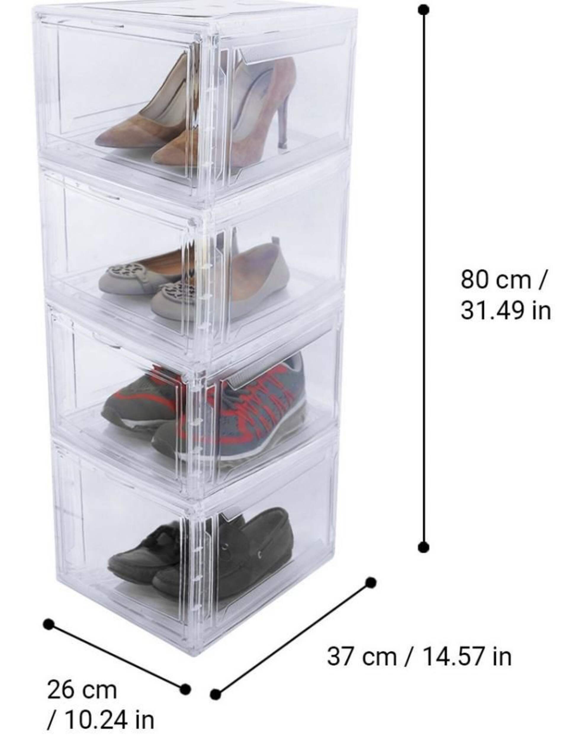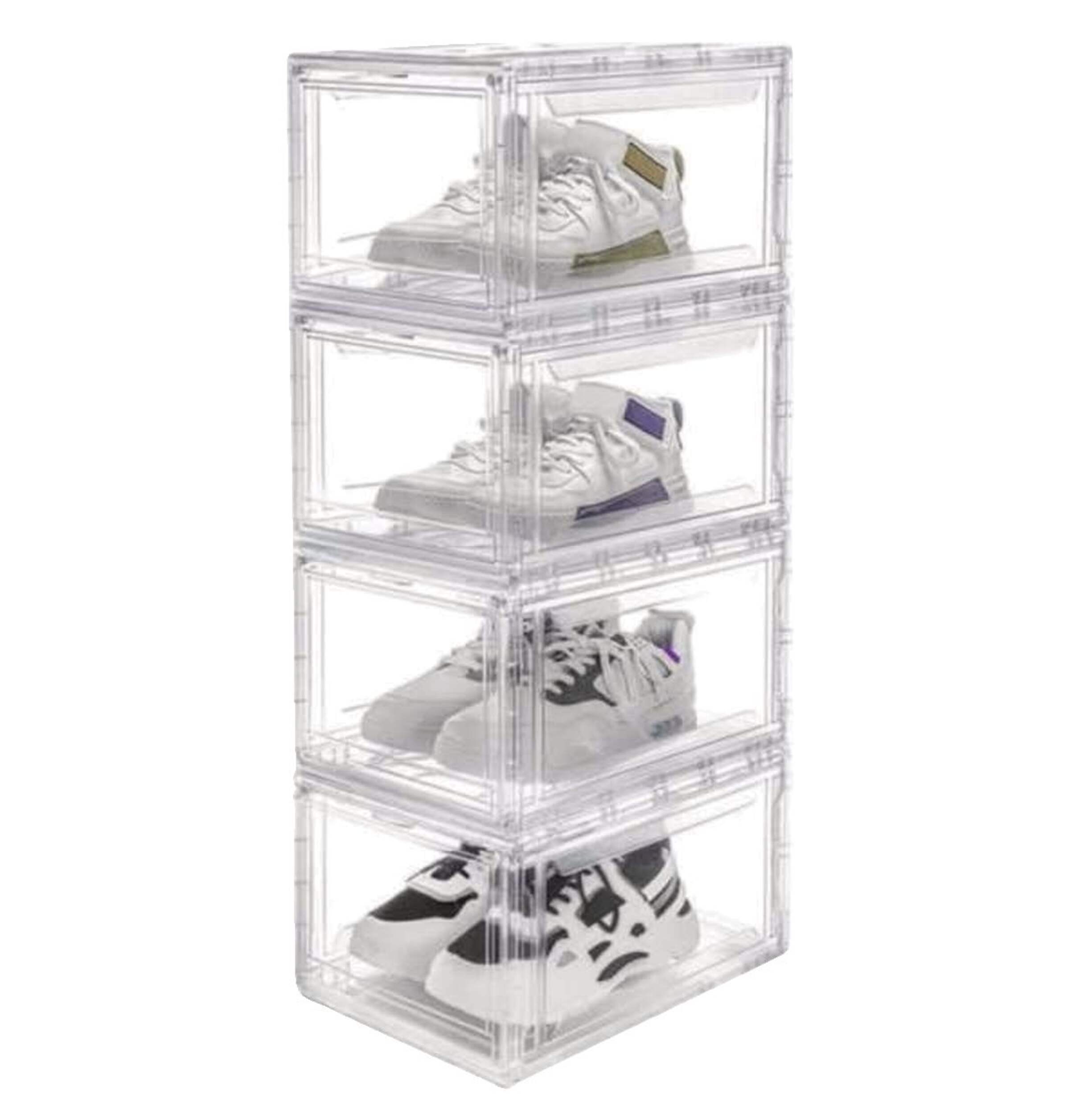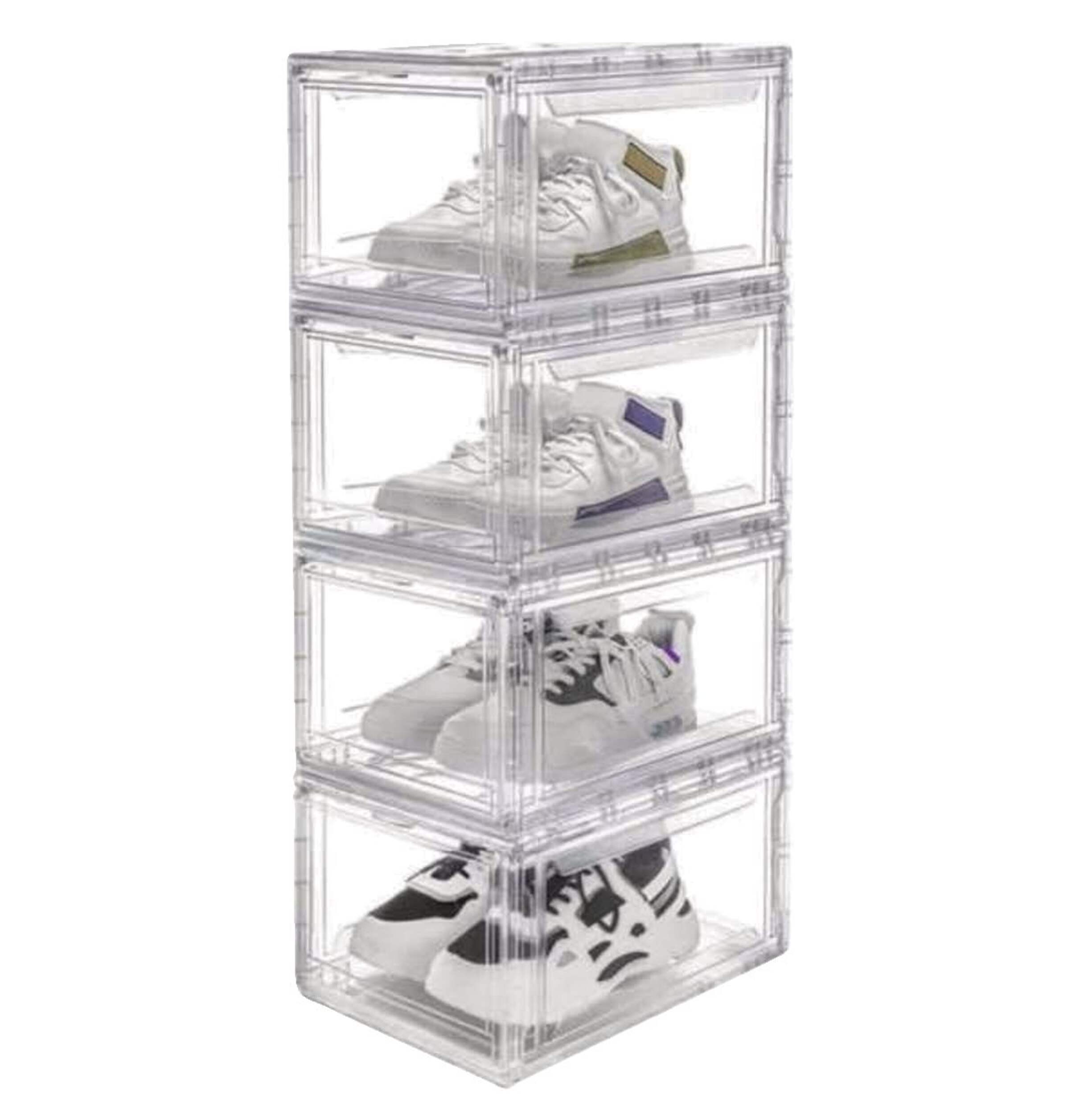 This set of 4 premium stackable shoe boxes keeps your footwear organized in style. Made with quality materials, each of the included clear boxes neatly stores your shoes and allows you to view them with ease. Thanks to a built-in magnetic closure, these sturdy boxes keep shoes protected from environmental factors.