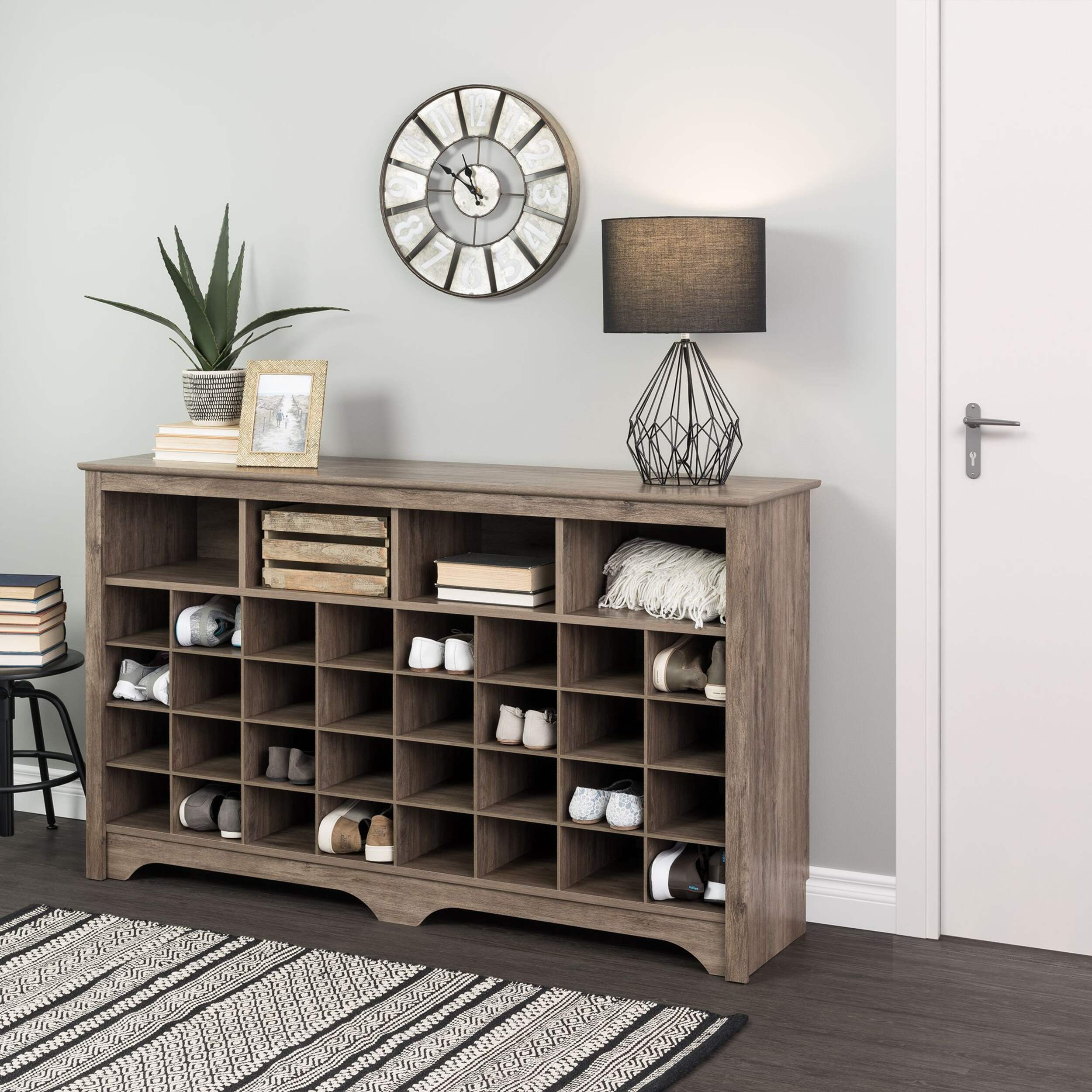 The 60” Shoe Cubby Console is a great option for organizing an entryway, mudroom or family room. There are 32 shoe cubbies to keep shoes from cluttering your floors and four large top compartments to stow books, bags and catch-all baskets. Not just for shoes, the cubbies can also be used for scarves, gloves and other items. This versatile console could also be repurposed to hold yarn, fabric and craft supplies. At 35” high, the large top surface is at an optimal height for setting down keys and other “on the go” items, or as a spot for your favorite lamp and decorative items.
