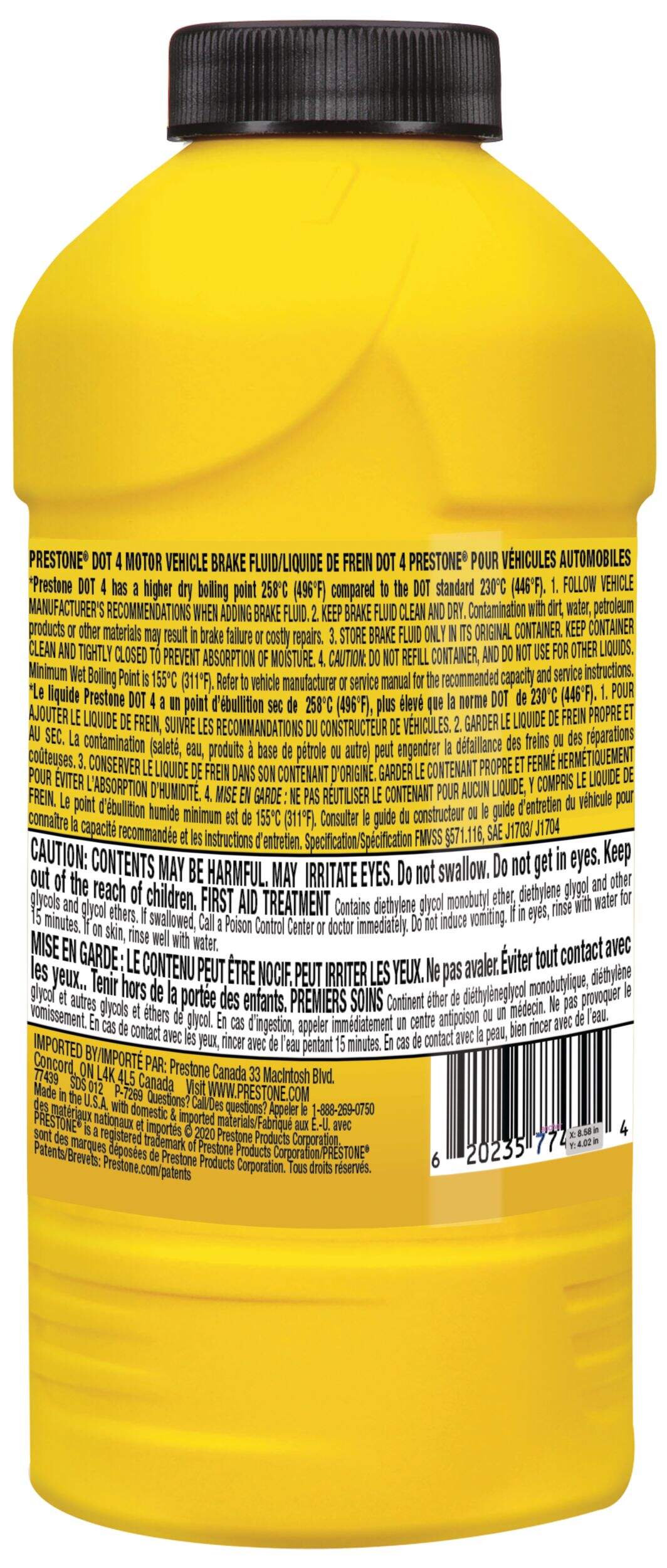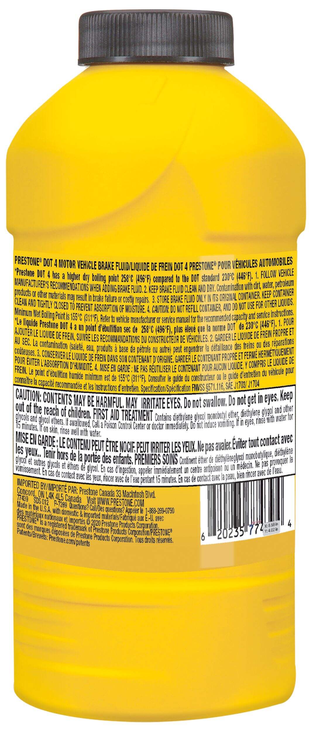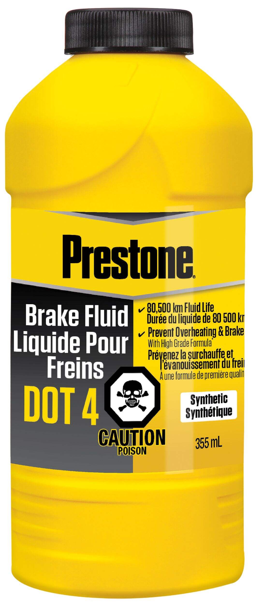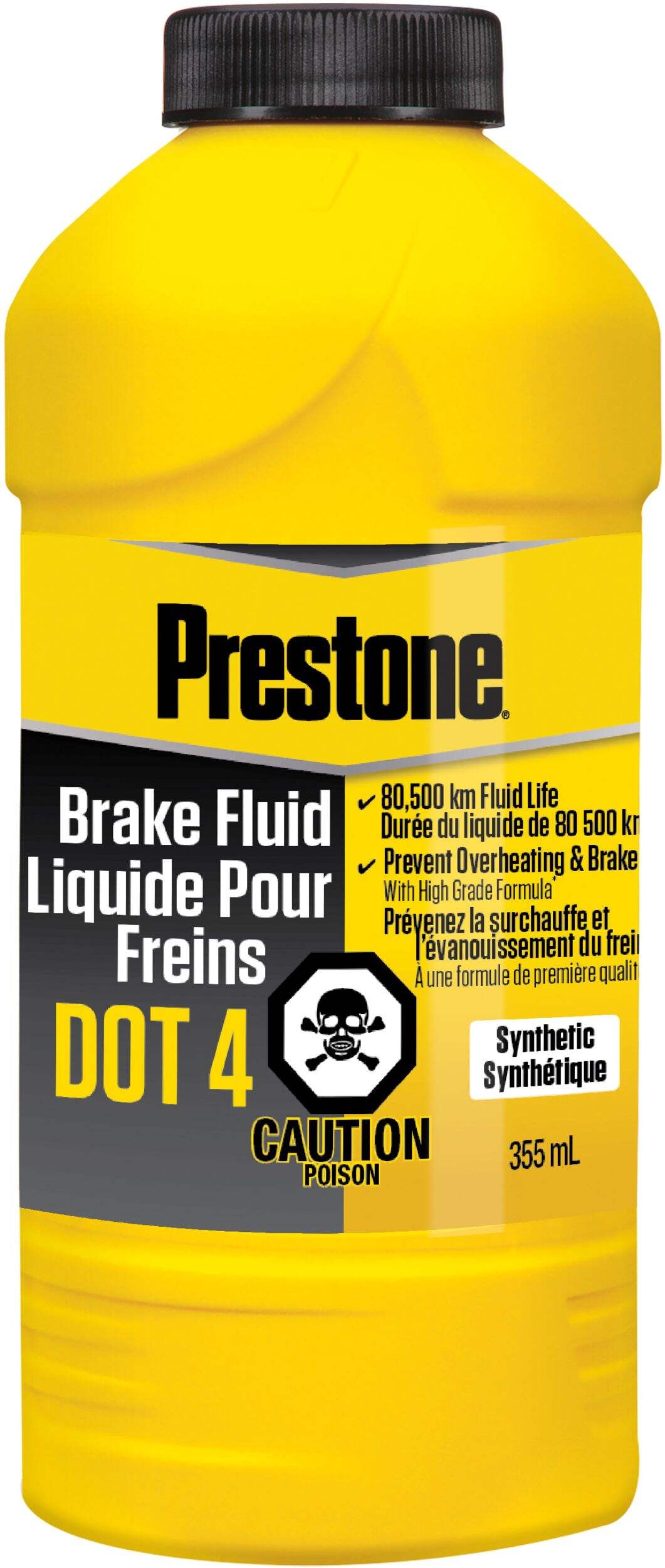 Prestone® DOT 4 Motor Vehicle Brake Fluid delivers enhanced performance vs. DOT standards, benefitting all vehicles calling for DOT 4. This synthetic fluid starts with a higher dry boiling point than the DOT minimum standard to protect against overheating, brake fade and performance decline due to water absorption. This extended life (50,000 mile) fluid is also formulated to prevent corrosion of all metals within the braking system. This formula is safe to use in all DOT 4 braking systems (ABS, disc or drum) and can mix with any DOT 4 fluid. It is recommended to only use the DOT fluid specified for your car, as using a different DOT product can affect the boiling point or replacement interval if the wrong fluid is used.