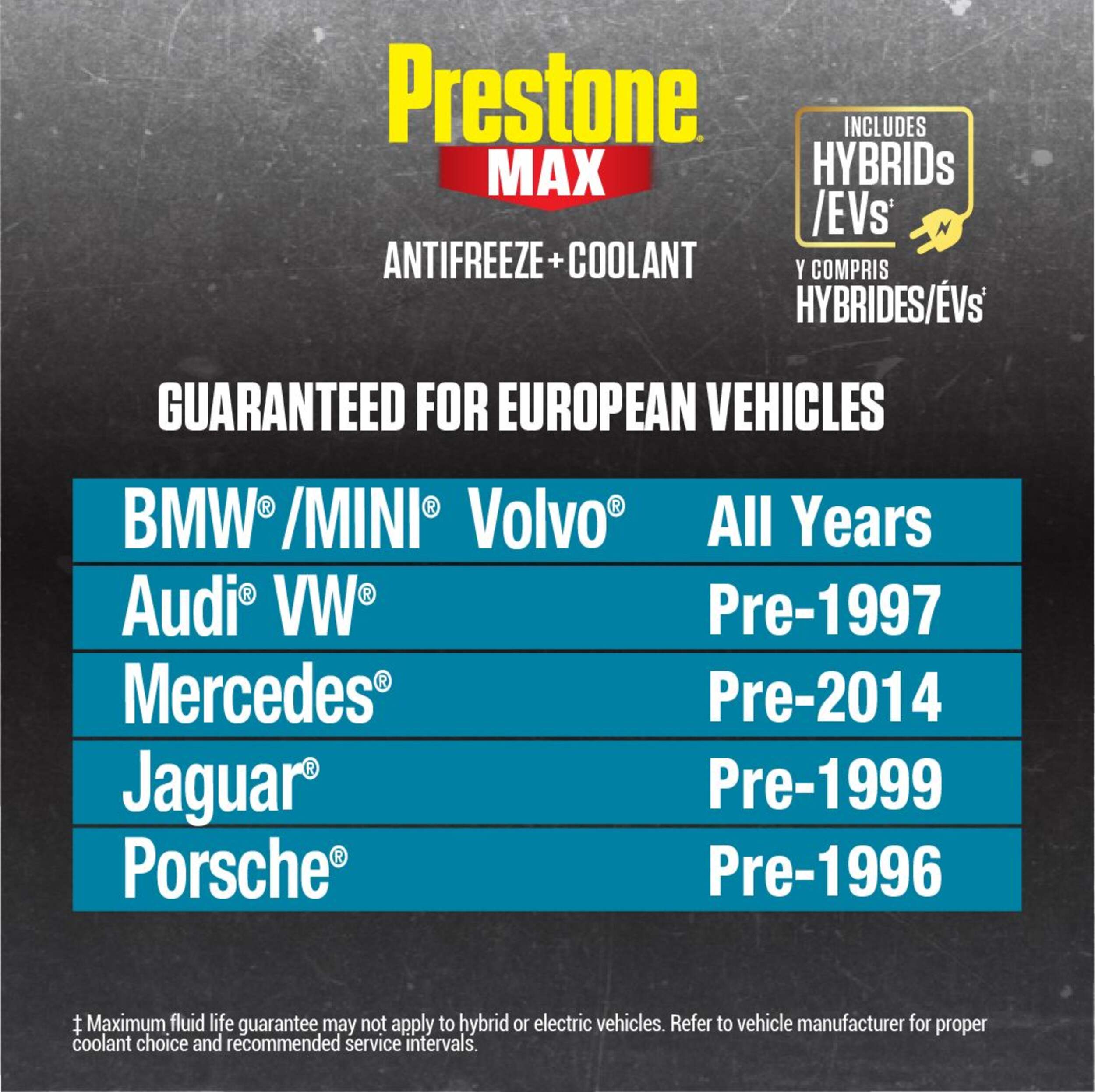 Prestone® MAX Antifreeze + Coolant makes use of advanced OE technology to provide engine protection for vehicles produced in Europe. Prestone's advanced formula allows it to deliver high-performance temperature resistance, industry-leading protection from damaging rust and corrosion, and long-lasting overall protection for your vehicle.