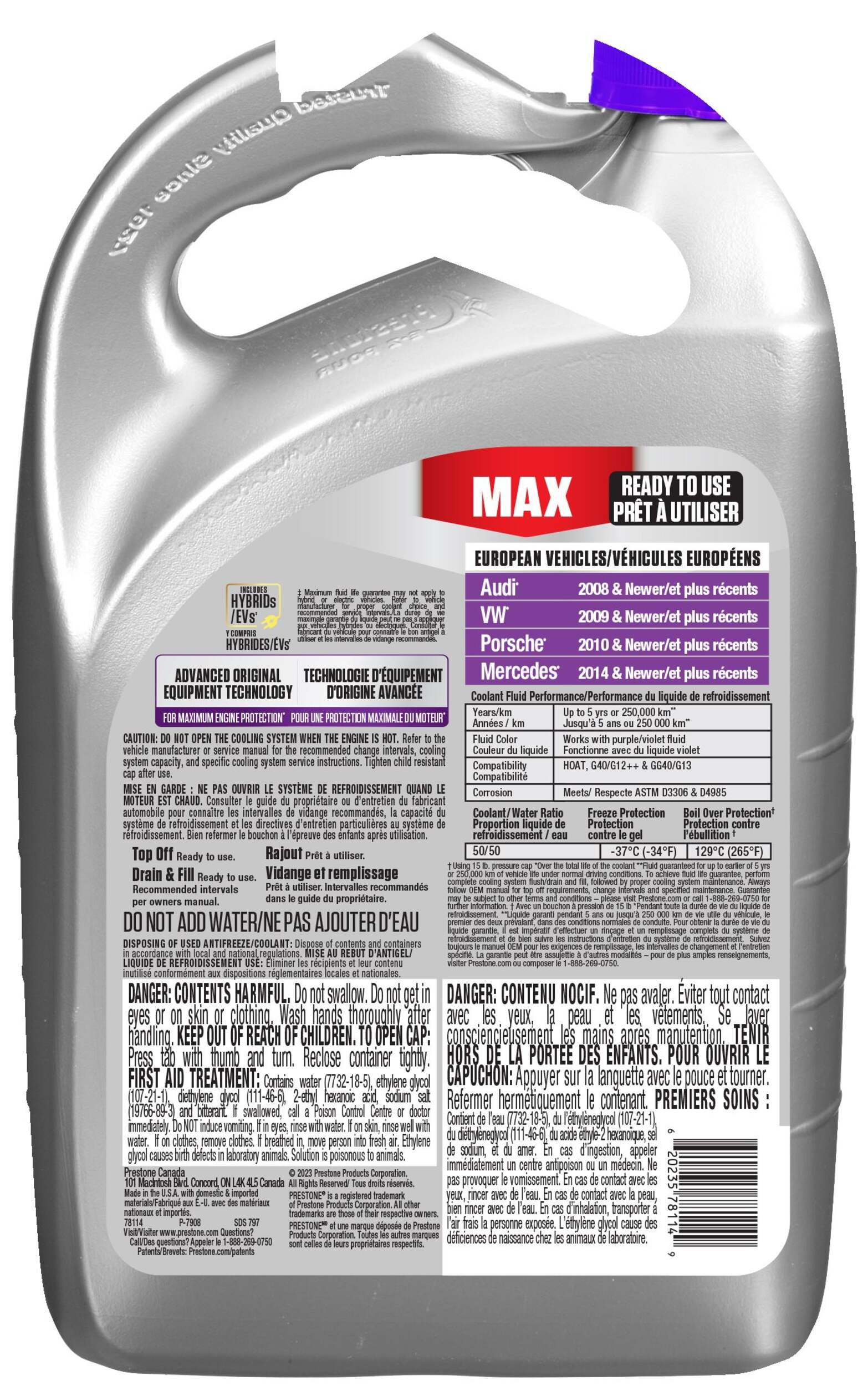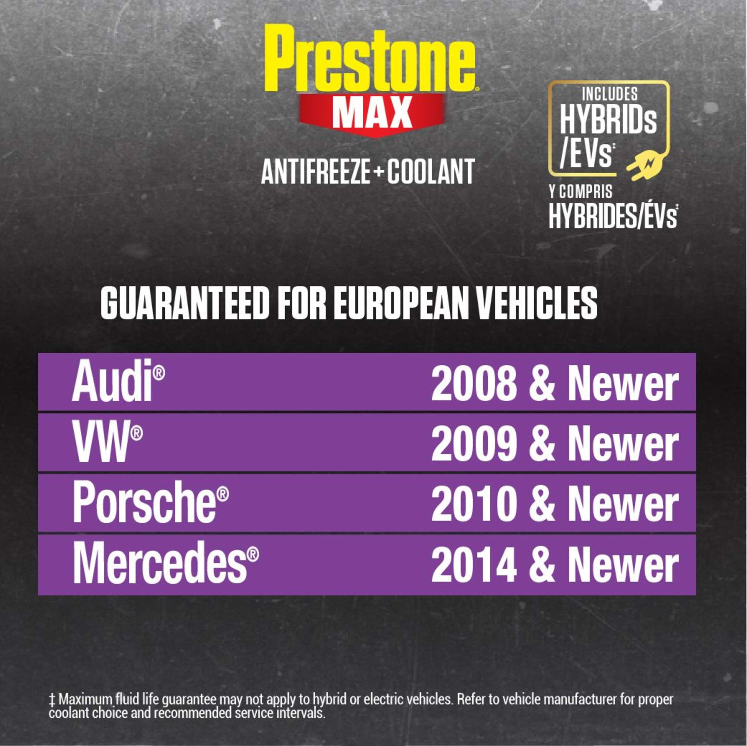 Prestone® MAX Antifreeze + Coolant makes use of advanced OE technology to provide maximum engine protection for European vehicles. Prestone's advanced technology formula delivers high-performance temperature protection, industry-leading prevention of rust and corrosion, and long-lasting overall protection for your vehicle.