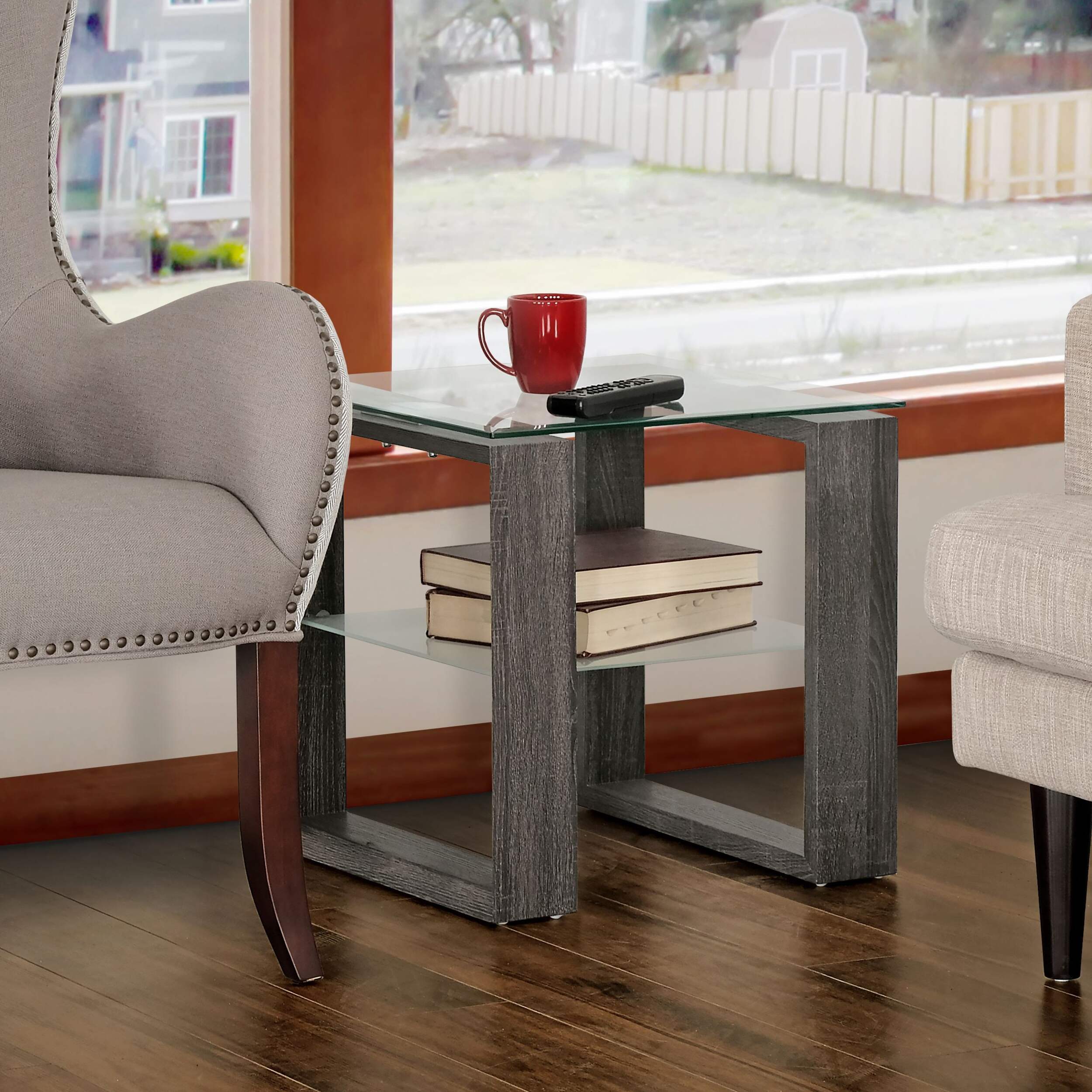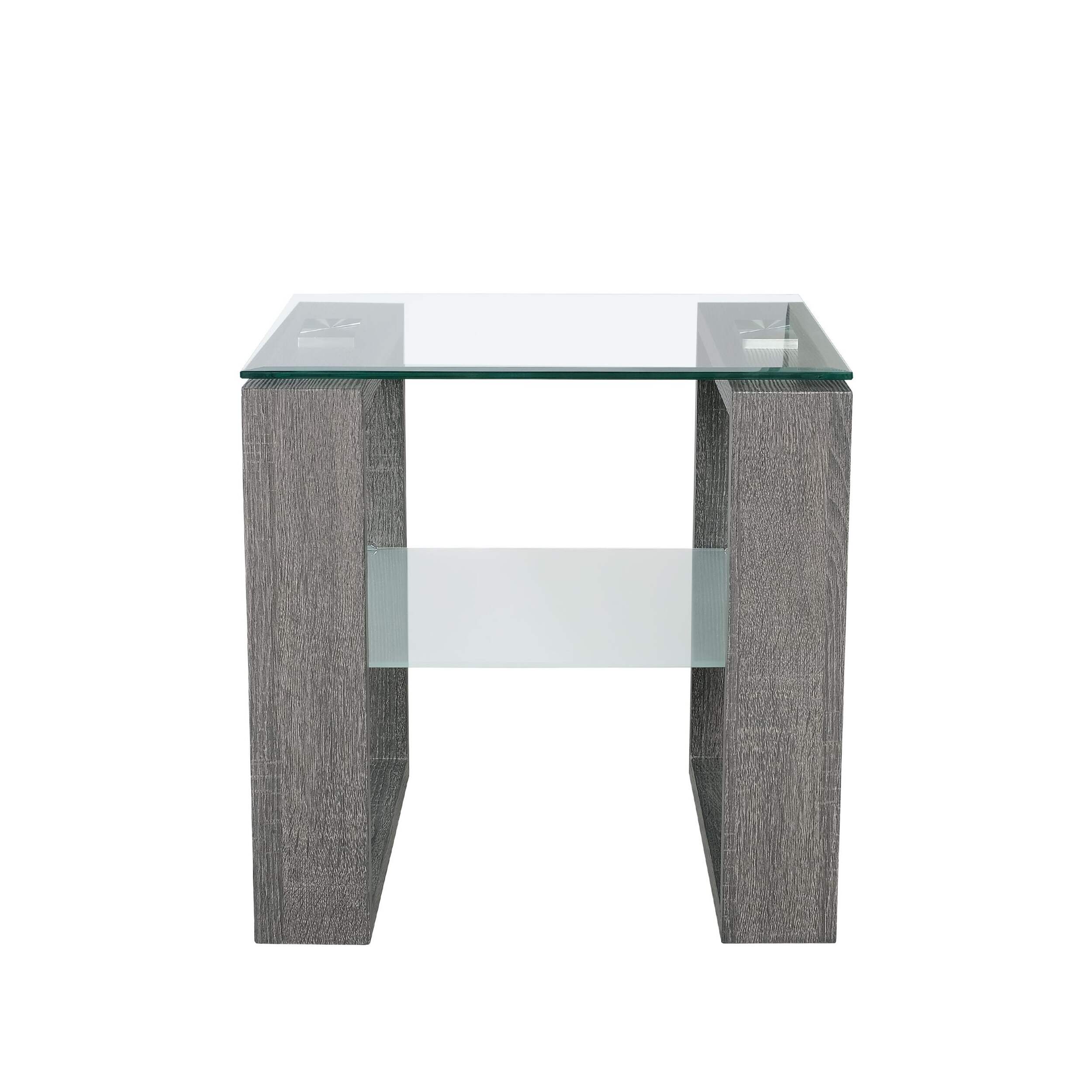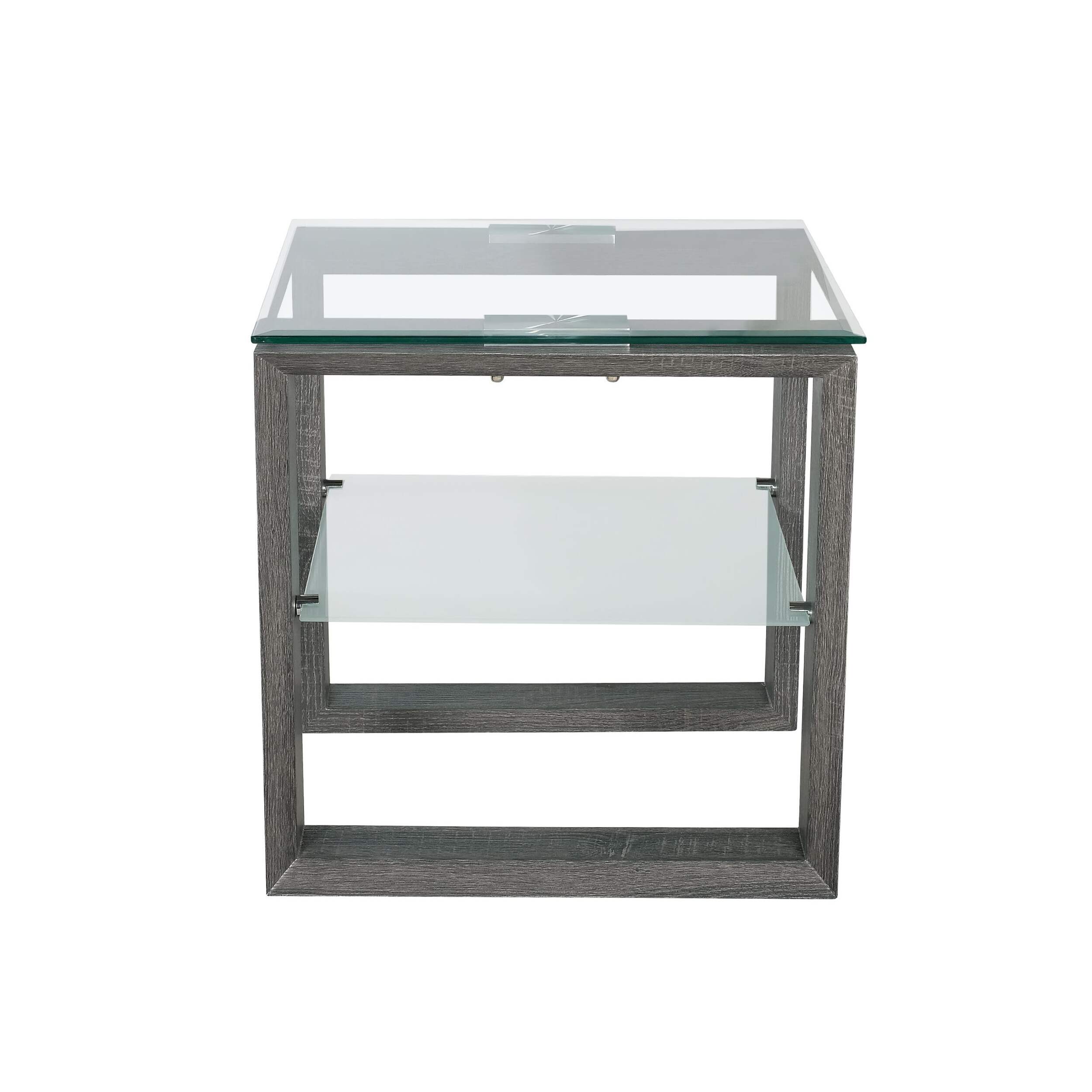 Tired of cluttered coffee tables and a lack of stylish storage? Meet the Primo Caleb Square End Table with Shelf - the perfect blend of modern design and handy functionality. The clear glass tabletop offers a refined perch for drinks or accent pieces, while the frosted lower shelf keeps remotes, magazines and essentials neatly stashed yet easily accessible. Crisp grey oak finished legs culminate in a square, contemporary silhouette that complements any living or dining space. No more bulky side tables - Caleb's streamlined profile brings an elegant storage solution and decor accent to your home in one sophisticated package.