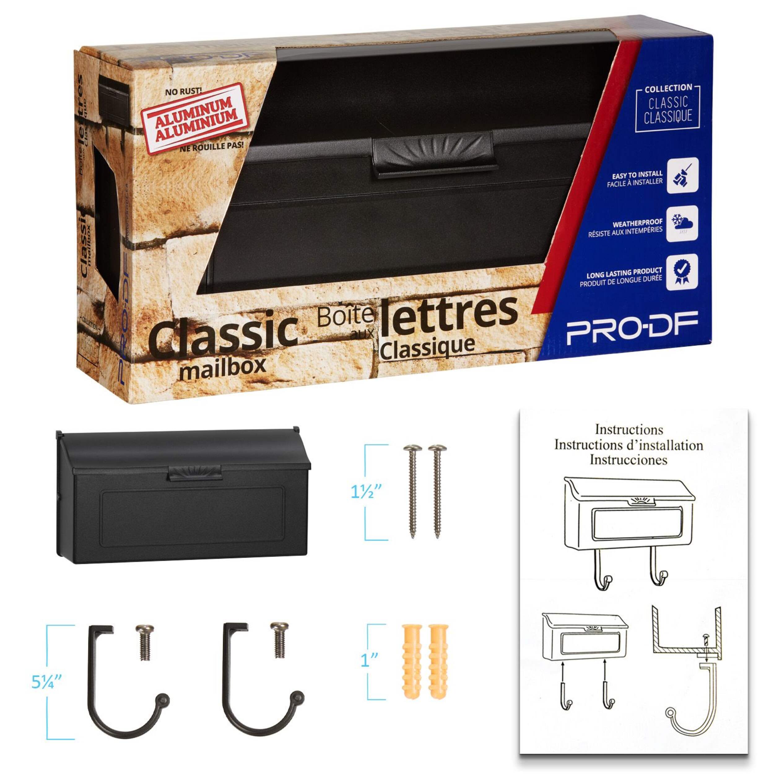 The classic cast aluminum mailbox by PRO-DF offers a stylish design and an exceptional durability. Made of high-quality cast aluminum to ensure a long-lasting and rustproof construction. The powder coated paint will preserve its finish year after years and will not rust even under the harshest weather conditions. This mailbox is built to last. The classic design will add character to your curb appeal. This medium size mailbox is perfect for your daily mail needs, it can store many envelopes and magazines. The hooks are very sturdy and useful to receive the weekly flyers and newspapers. Newspaper hooks (2) and mounting hardware are included. Very easy to mount on the wall.