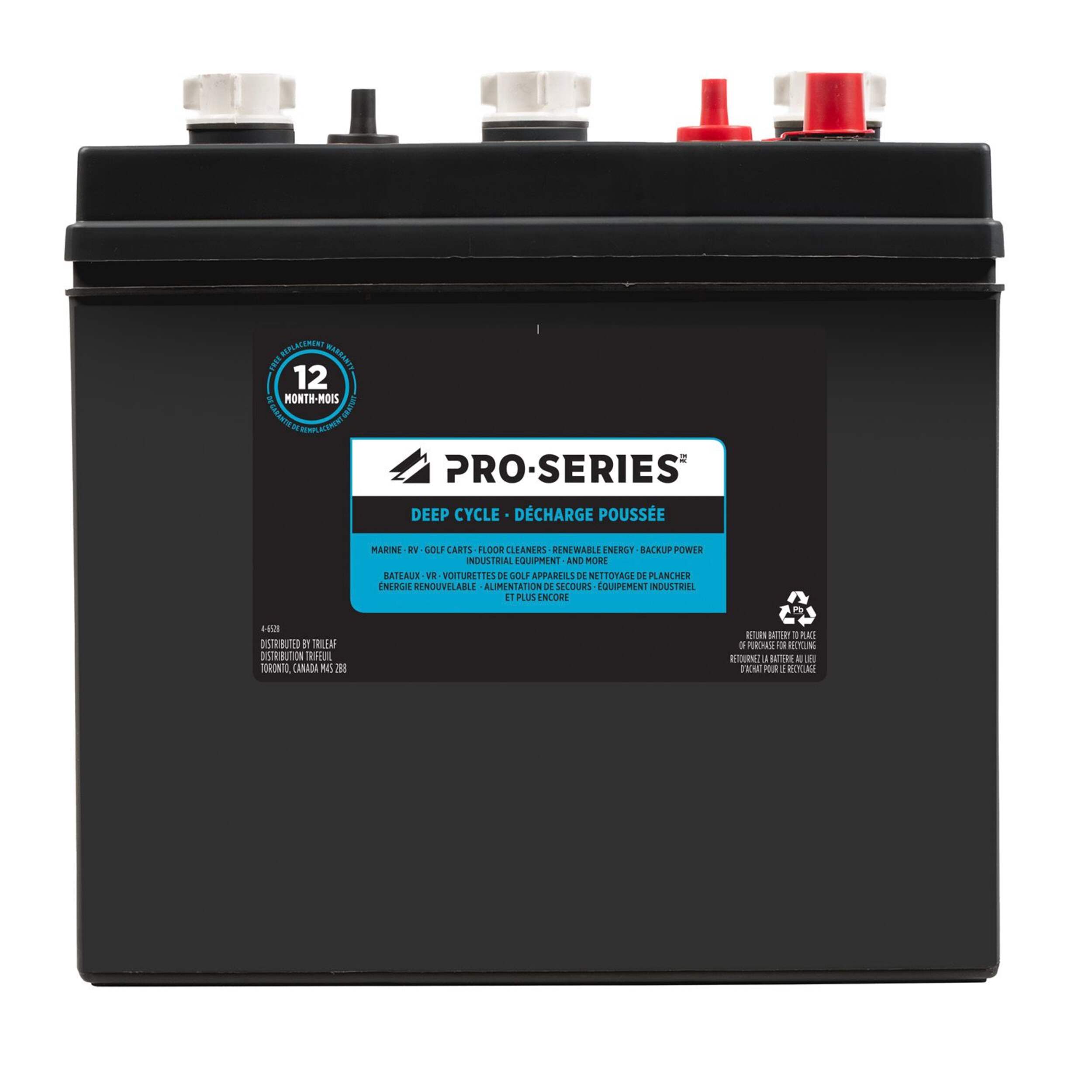 The PRO-SERIES Group 901 6-Volt Deep Cycle Battery is a robust 6-volt battery boasting a 250 amp-hour capacity ideal for floor scrubbers, sweepers and more. The battery features a right-hand positive polarity.When it's time for a replacement, don't forget to return your used lead-acid battery to Canadian Tire for recycling, as this helps contribute to the production of new batteries.