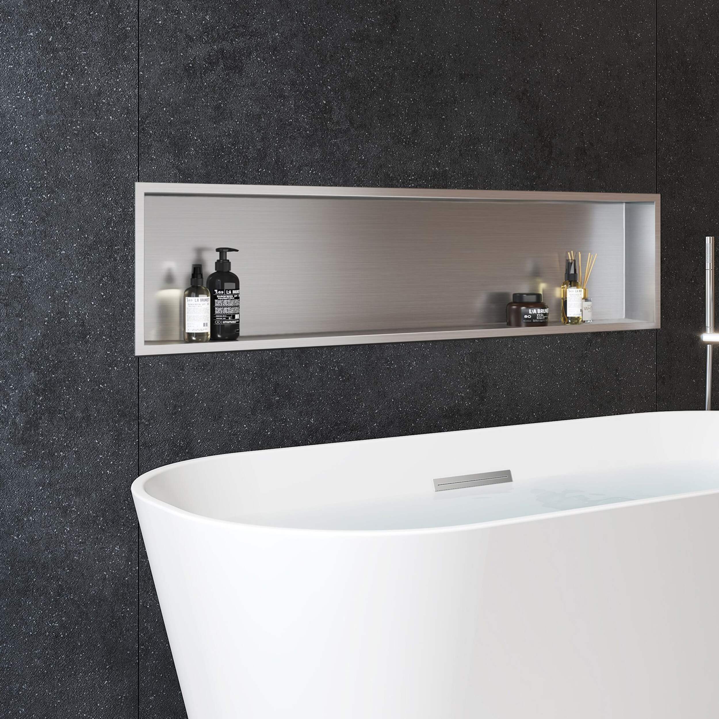 The Pulse ShowerSpas Niche NI-1248 is a premium recessed shelf designed to bring both elegance and practicality to your bathroom. Made from high-quality 304 stainless steel, it features a sleek 1/2" ultra-thin rectangular frame that delivers a clean, modern aesthetic. Its waterproof, weld-free construction ensures durability and easy installation, whether mounted vertically or horizontally. With generous dimensions of 48½" x 13" x 4", the NI-1248 offers ample space for storing shower essentials.