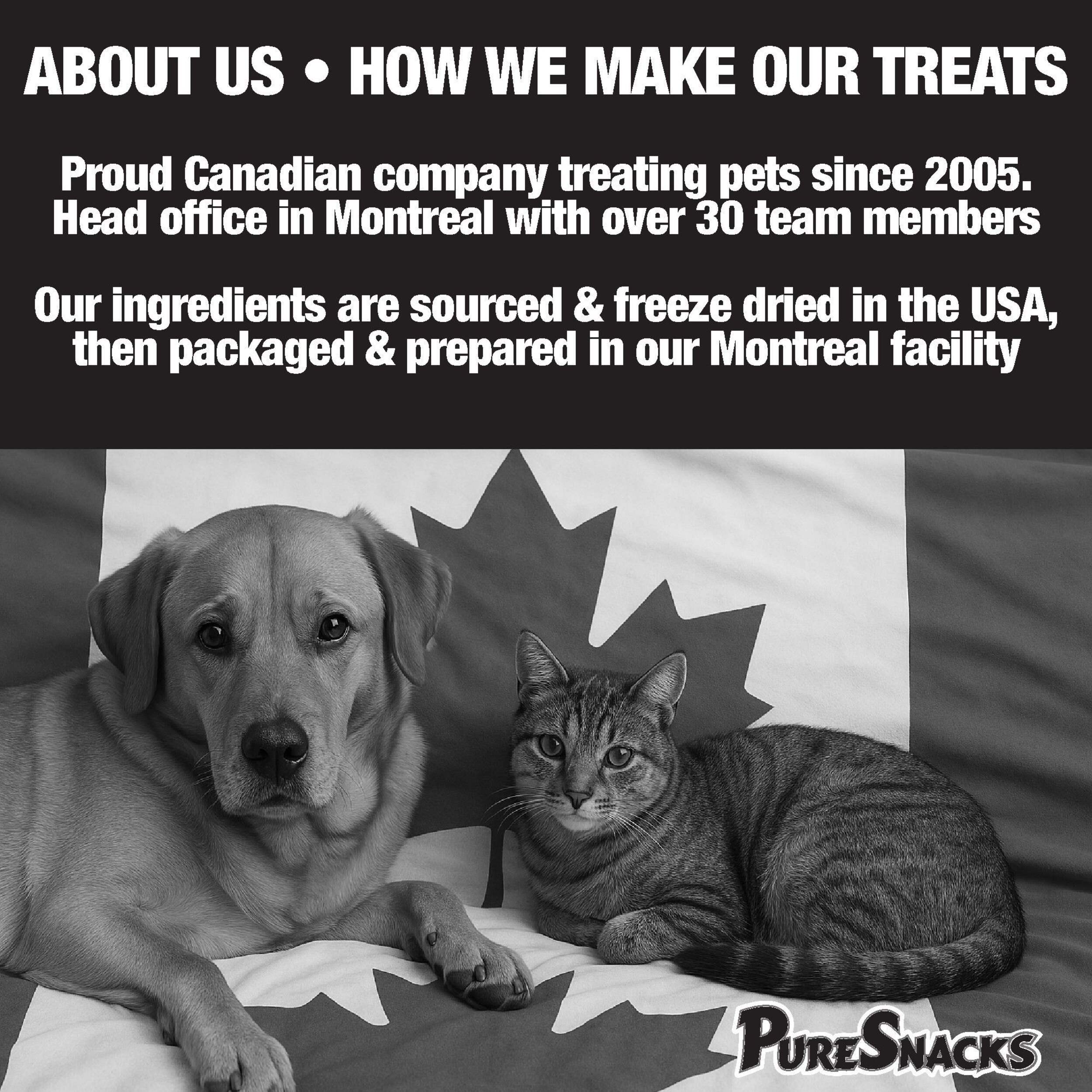 Looking for a “pure snack” for your dog? Our freeze-dried salmon treats are made with just a single ingredient: sockeye salmon. We've got nothing to hide: sourced and freeze dried RAW in the USA, then packaged for you right here in Quebec, Canada with no fillers, no grains, no glycerin, no sweeteners, no nonsense