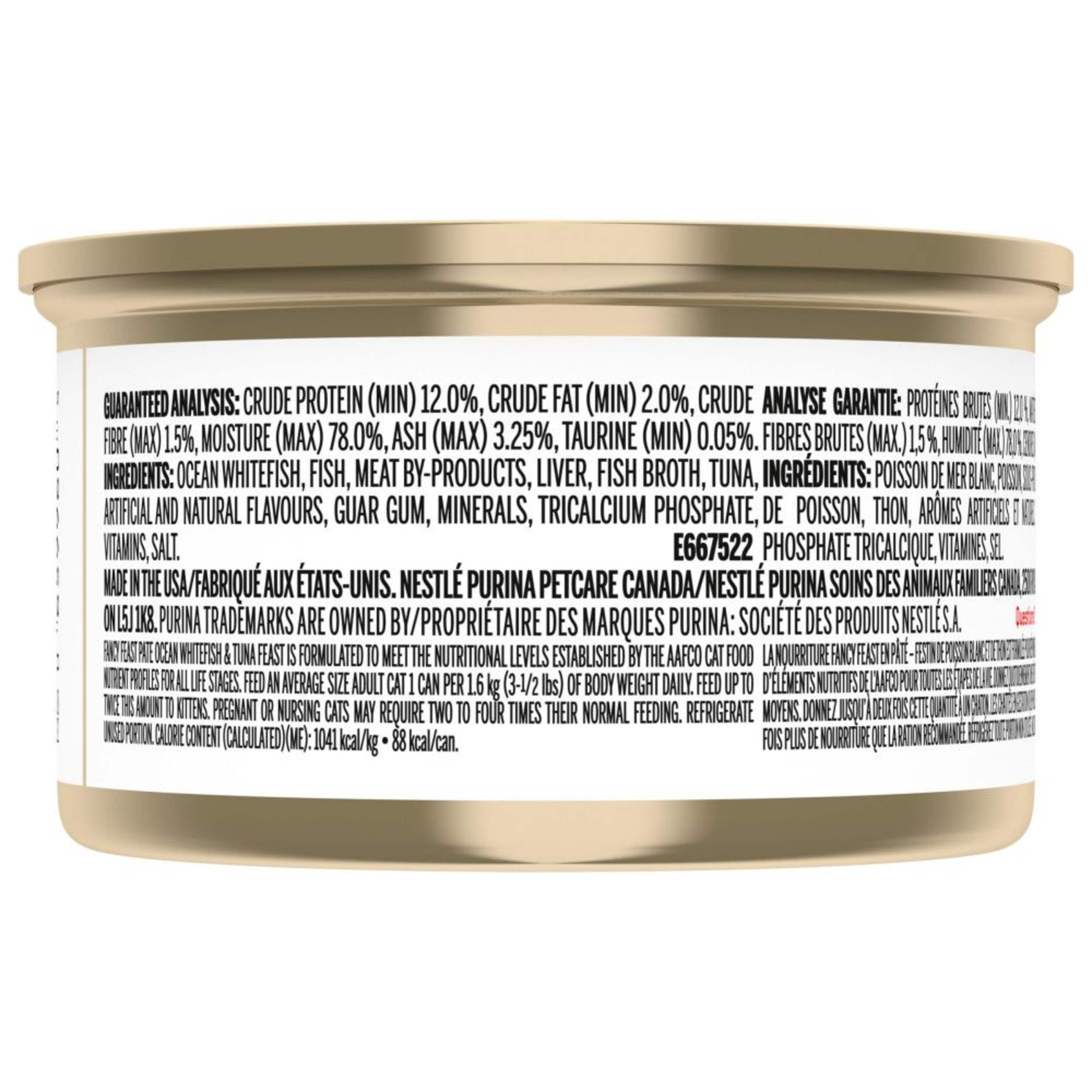 Purina® Fancy Feast® Cat Food, Ocean Whitefish & Tuna variant, caters to the nutritional needs of cats of all ages and sizes. Fancy Feast provides a diverse range of entrées, adding variety to your cat's diet and ensuring their wellness.