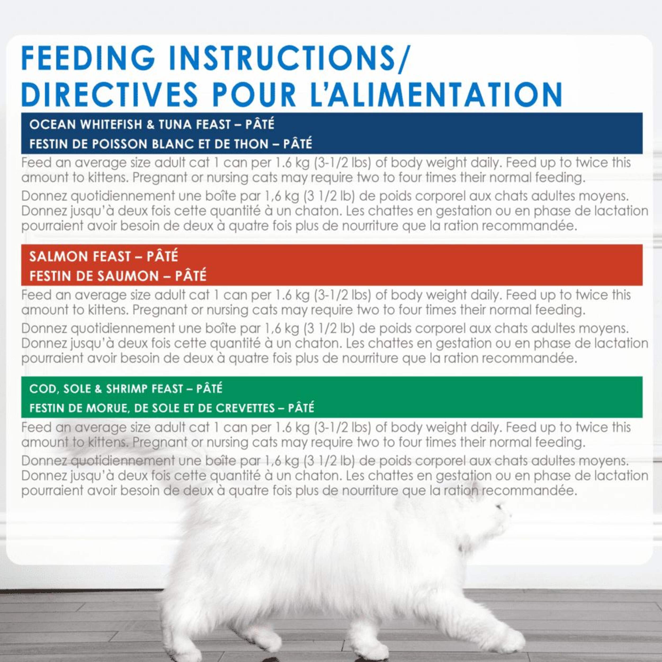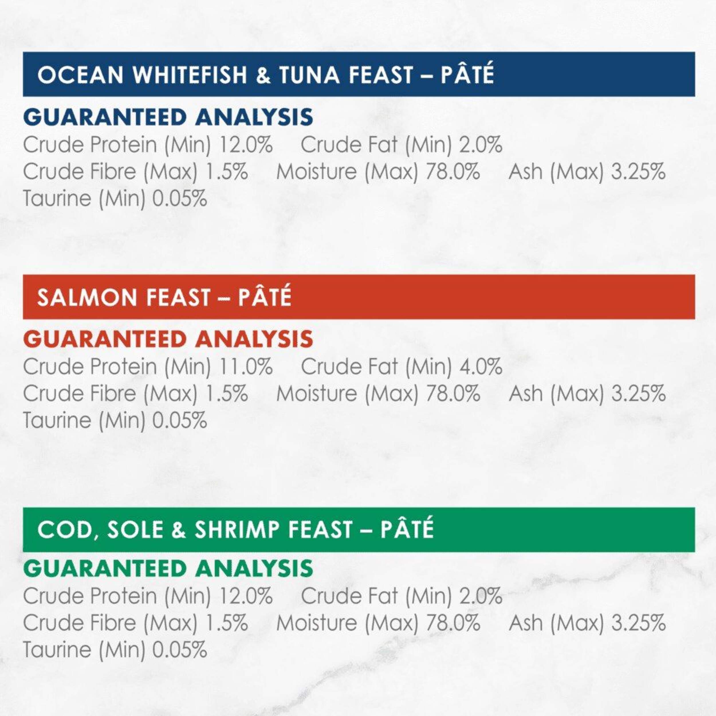 Includes 12 cans: 4 cod, sole and shrimp feast, 4 ocean whitefish and tuna feast and 4 salmon feast