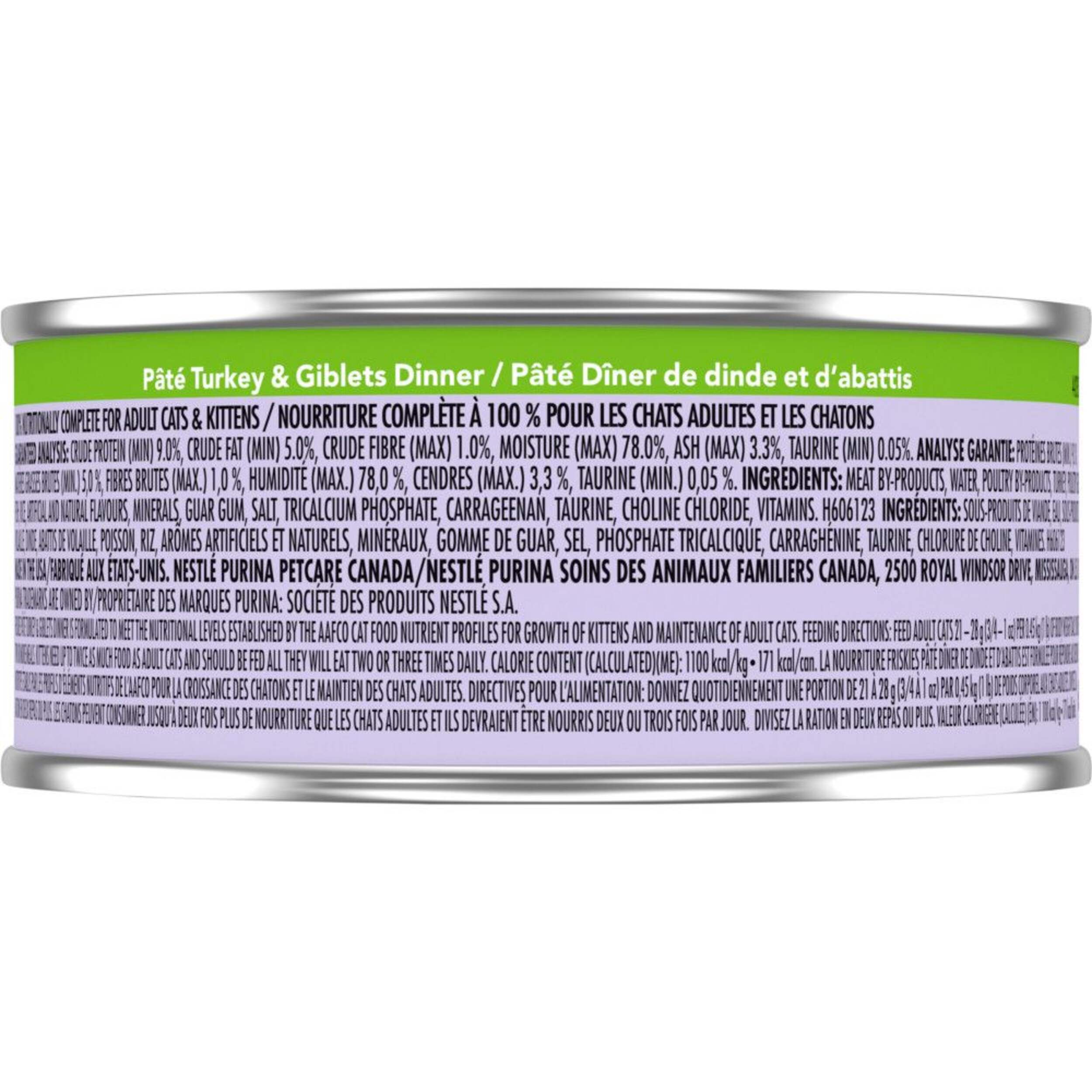 Purina Friskies® Pate Turkey & Giblets Dinner Wet Cat Food tastes great and gets your cat excited for mealtime everyday. It offers a balanced snack or meal that ensures your cat's health and wellbeing, while also being convenient to open whenever needed.