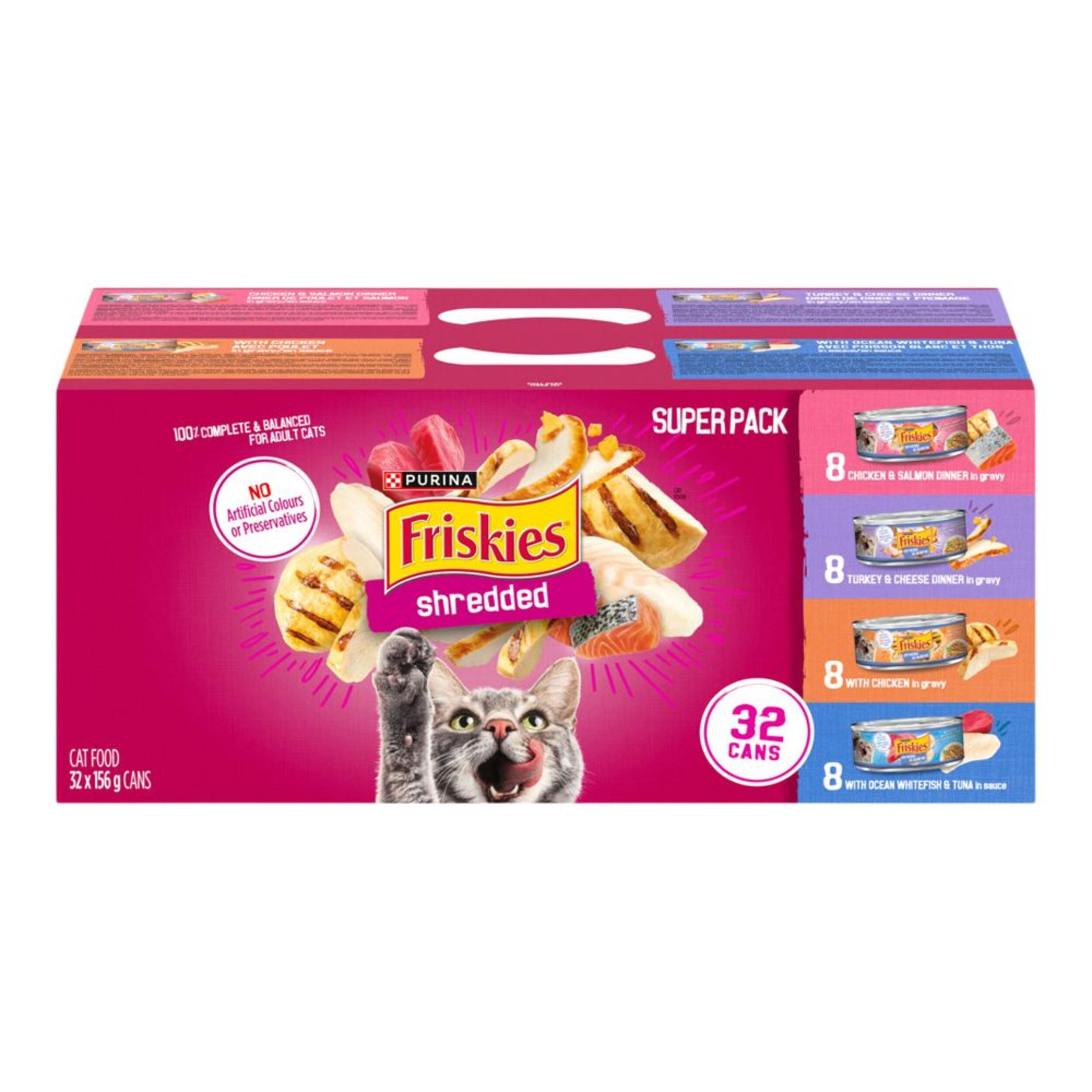 Even the pickiest cat will love the delicious taste of this Purina Friskies Shredded Variety Super Pack Adult Wet Cat Food. This pack includes four unique flavours of shredded meat in a savoury sauce to satisfy even the fussiest feline's taste buds, and lets you offer a new flavour to keep them interested. These small portable cans are perfectly sized to give your cat a nutritious and satisfying meal to keep them happy and healthy.