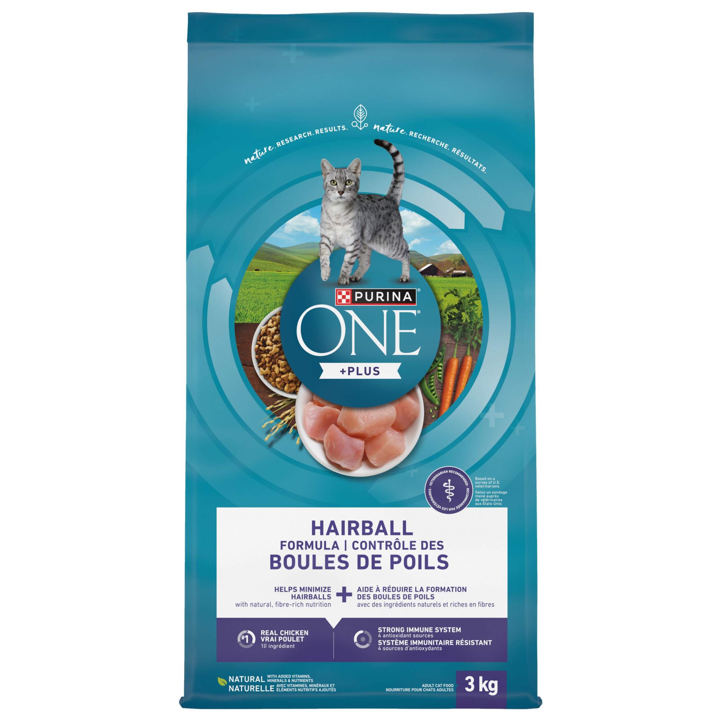 Purina ONE +Plus Hairball Formula combines nature and research for results you can see in your cat. That includes a SmartBlend® of high-quality ingredients, plus a natural fibre blend to help minimize hairballs. See the results Purina ONE can make in your cat. Purina ONE Cat +Plus Tailored Formulas build on an already solid foundation, creating tailored pet food options that support specific needs like ideal weight, healthy aging, hairballs and more. From energy and immune health to strong muscles, including a healthy heart, these high-quality formulas combine nature and research for results you can see in your cat. Try dry food options from veterinarian recommended Purina ONE today.