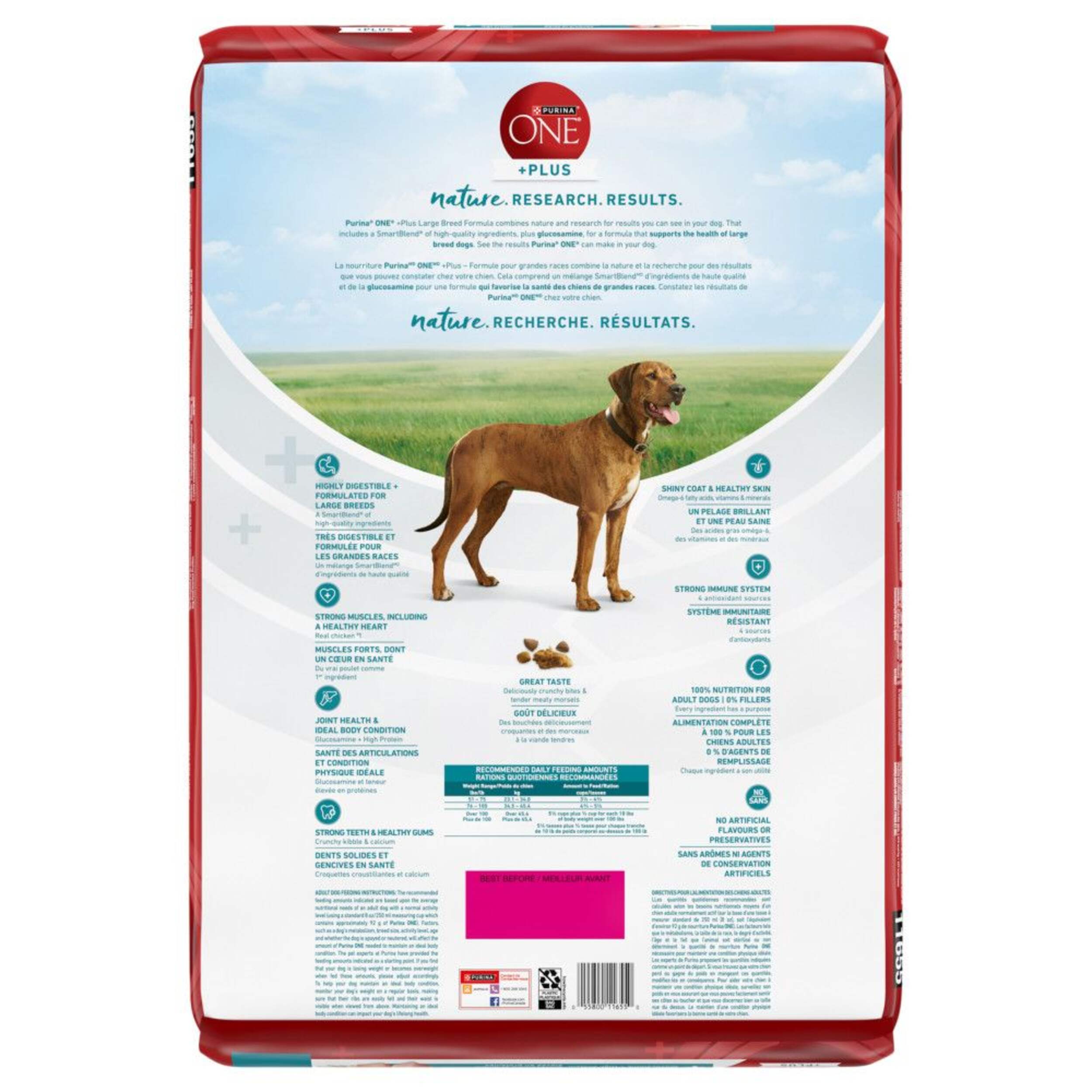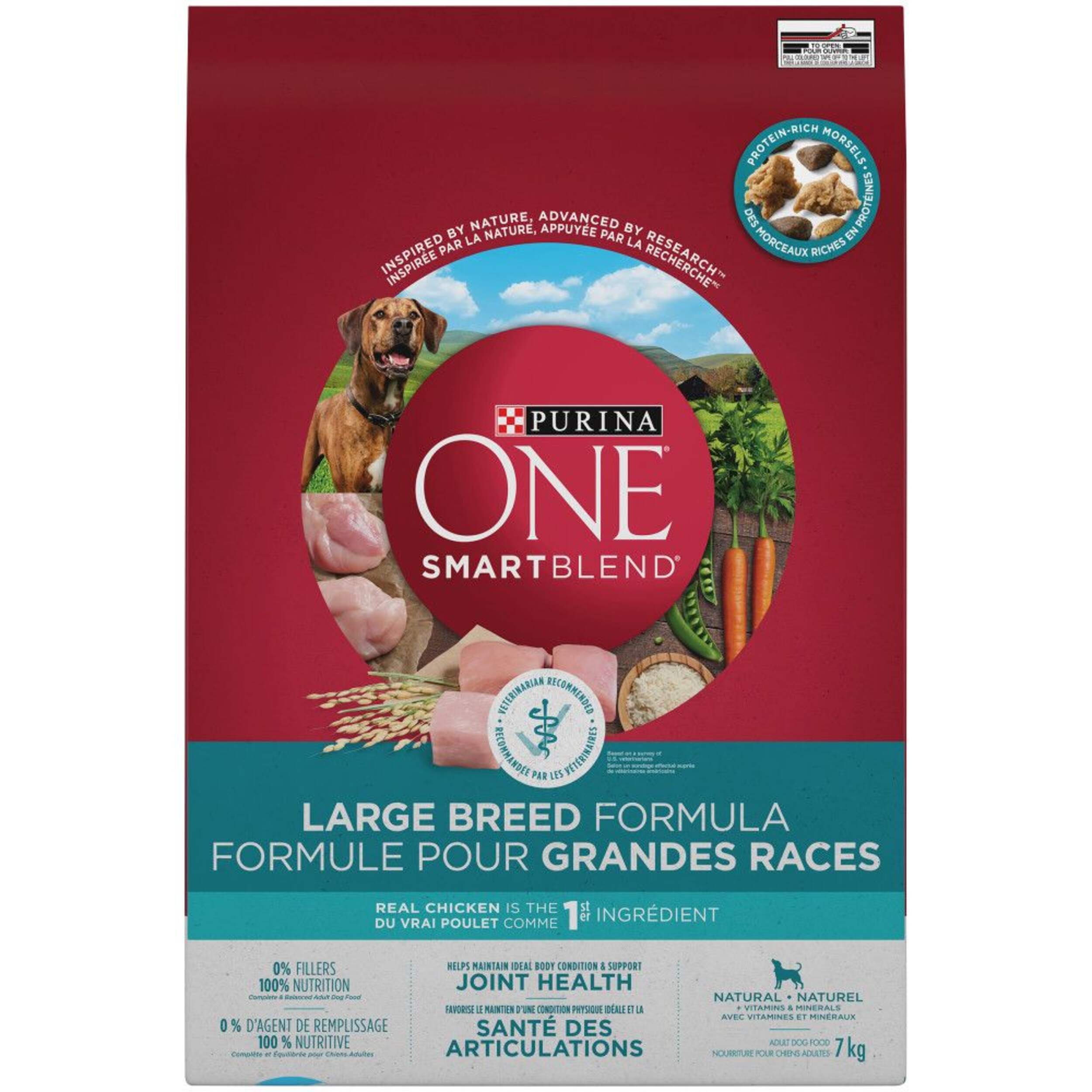 Purina ONE SmartBlend Large Breed Formula Chicken Adult Dry Dog Food is specially formulated to support the health and well-being of large breed dogs. Made with real chicken as the #1 ingredient, this high-quality formula helps your pet maintain strong muscles, including a healthy heart. It features highly digestible natural ingredients, plus added vitamins, minerals, and nutrients for complete and balanced nutrition. Enriched with glucosamine, it supports joint health and mobility, essential for active large breed dogs. This dry dog food provides the tailored nutrition your pet needs for lifelong vitality.