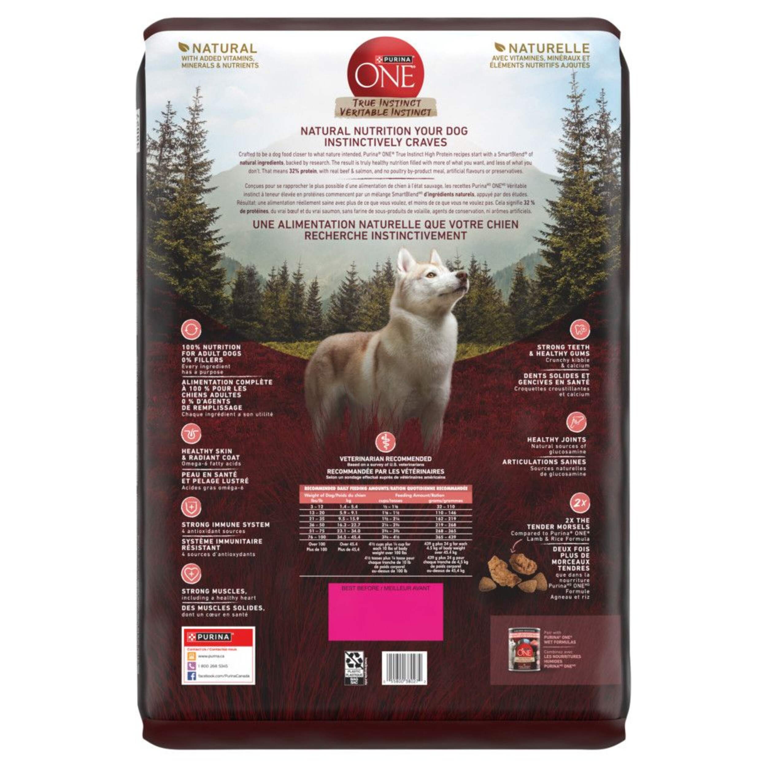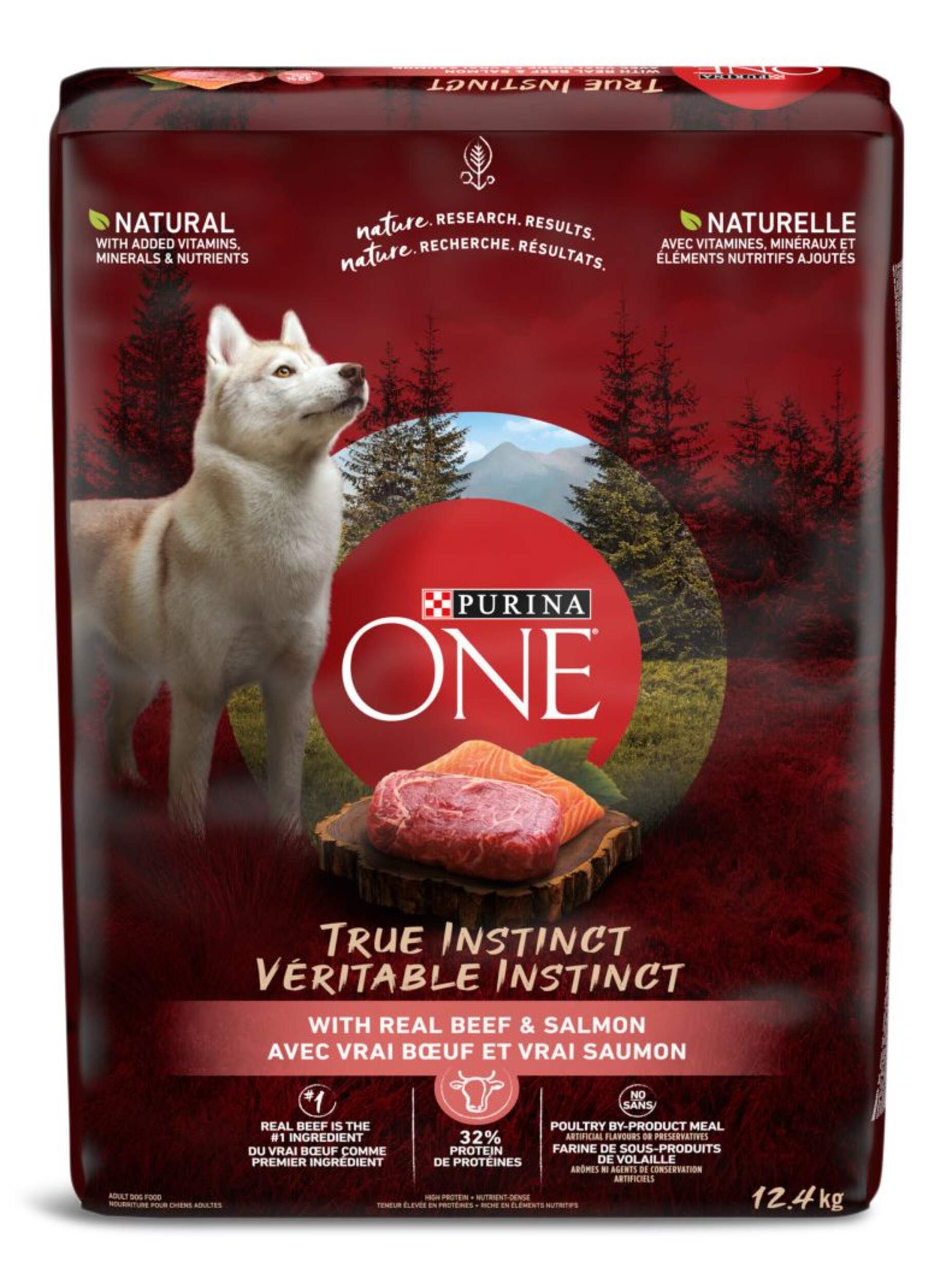 Nature. Research. Results. No matter how far science advances us, we always look to nature to inspire us. Crafted to be a dog food closer to what nature intended, Purina ONE True Instinct recipes start with a SmartBlend® of natural ingredients, backed by research. The result is truly healthy nutrition filled with more of what you want, and less of what you don’t. That means 32% protein, with beef and salmon and no poultry by-product meal, artificial flavours or preservatives. Feed your dog’s instinct to choose nutrient-dense food with Purina ONE True Instinct with Real Beef & Salmon – natural nutrition your dog instinctively craves.