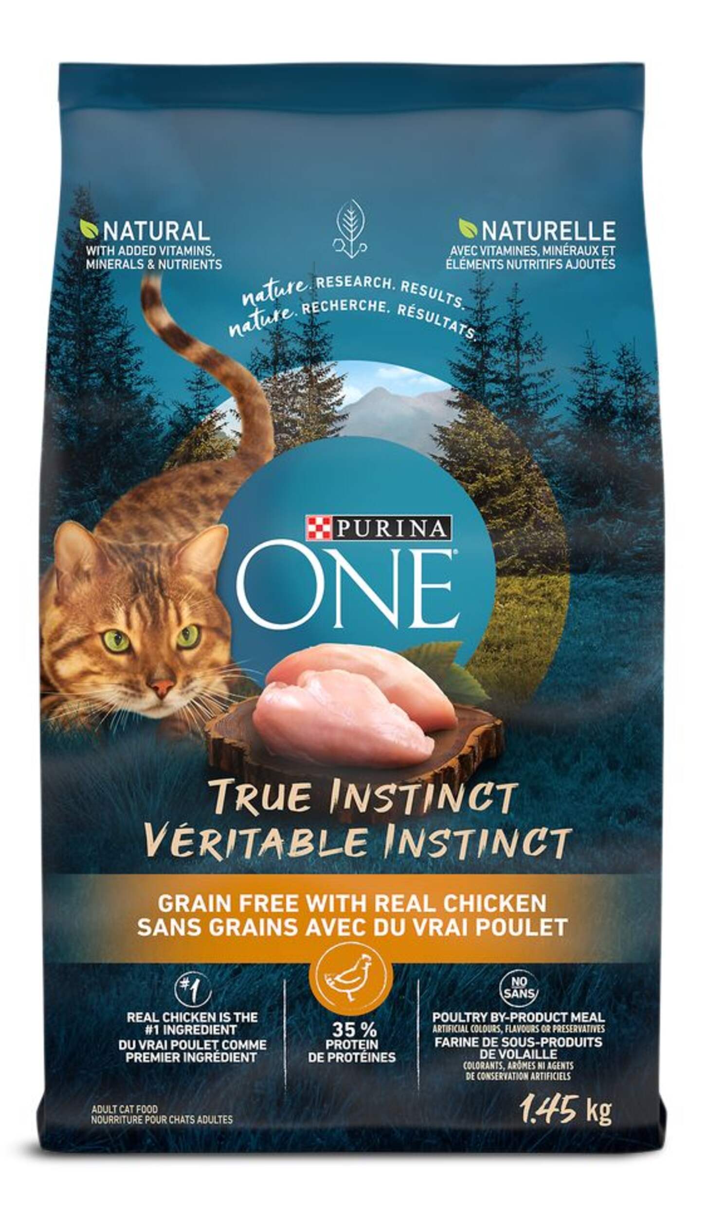 Nature. Research. Results.No matter how far science advances us, we always look to nature to inspire us. Crafted to be a cat food closer to what nature intended, Purina ONE True Instinct recipes start with a SmartBlend® of natural ingredients, backed by research. The result is truly healthy nutrition filled with more of what you want and less of what you don't. That means a grain-free formula with 35% protein, with real chicken as the #1 ingredient and no poultry by product meal, artificial flavours or preservatives. Feed your cat’s instinct to choose protein-rich food with Purina ONE True Instinct Grain Free With Real Chicken – natural nutrition your cat instinctively craves.