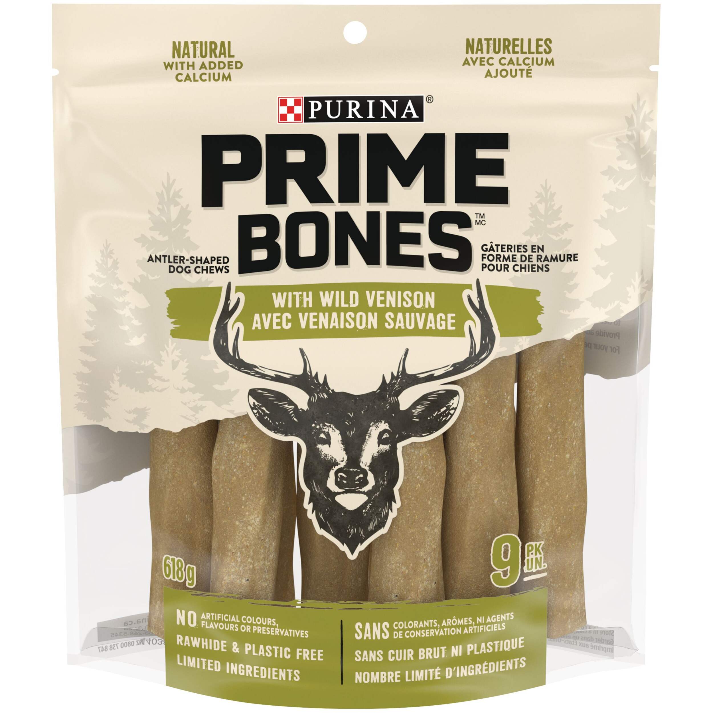 Satisfy your dog's instinctual love of chewing with Purina Prime Bones Dog Chews With Wild Venison. These extra-long-lasting, natural dog chews with added calcium are rawhide free and provide a safe and naturally edible treat that your dog is sure to love. Each of these limited ingredient dog treats provides extra-long-lasting enjoyment with an antler-shaped chew to keep him entertained and thinking about his next big adventure in the wild. Give him big, untamed flavour, in a natural dog treat that helps clean his teeth, too.