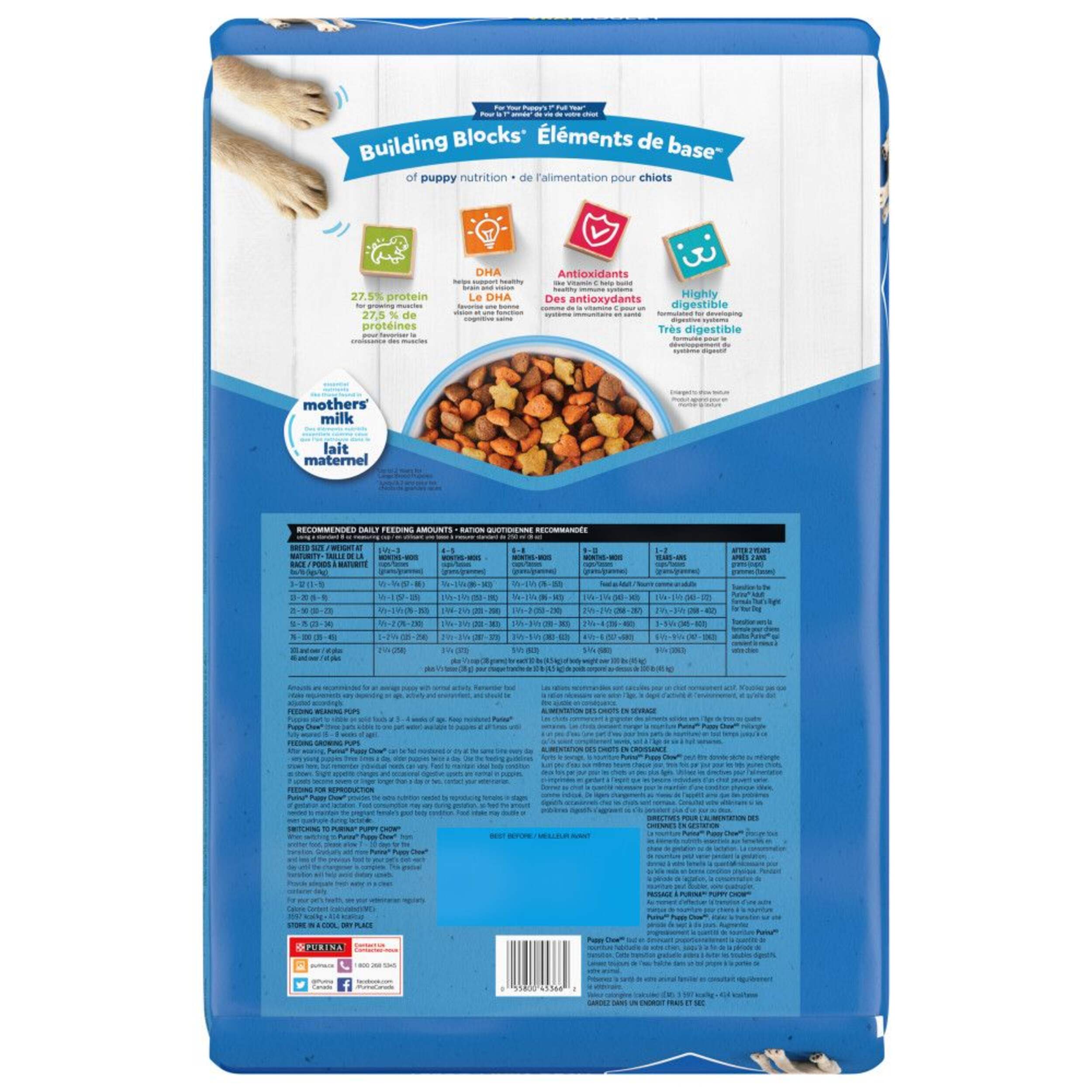 Provide the nutrition your puppy needs to get a great start in life with Purina Puppy Chow With Real Chicken, dry puppy food. Every serving of this puppy food contains 100 percent of the essential nutrients puppies require to grow big and strong, and the delicious taste gives them a reason to clean their bowl at every feeding. Tend to your growing pup's nutritional needs through the vital early stages of their development with this dry puppy food and take comfort in knowing they’re getting a highly digestible formula your puppy will look forward to eating every day. This recipe supports your puppy’s growing muscles, so they can keep up with their adventurous canine pursuits.