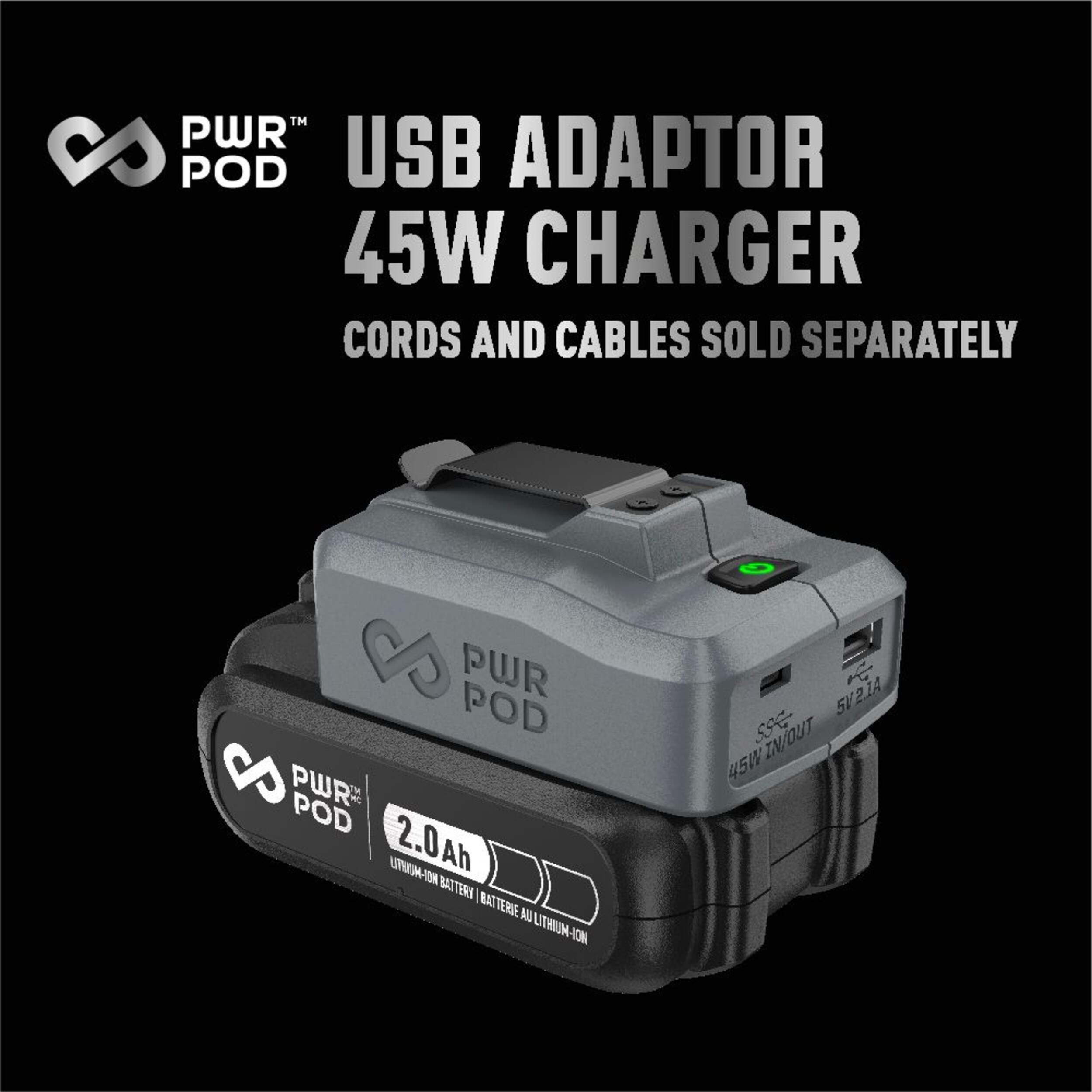 Charges all PWR POD 20V Max batteries via USB-C port with additional cable and charging head (sold separately) as quickly as a 45W battery charger