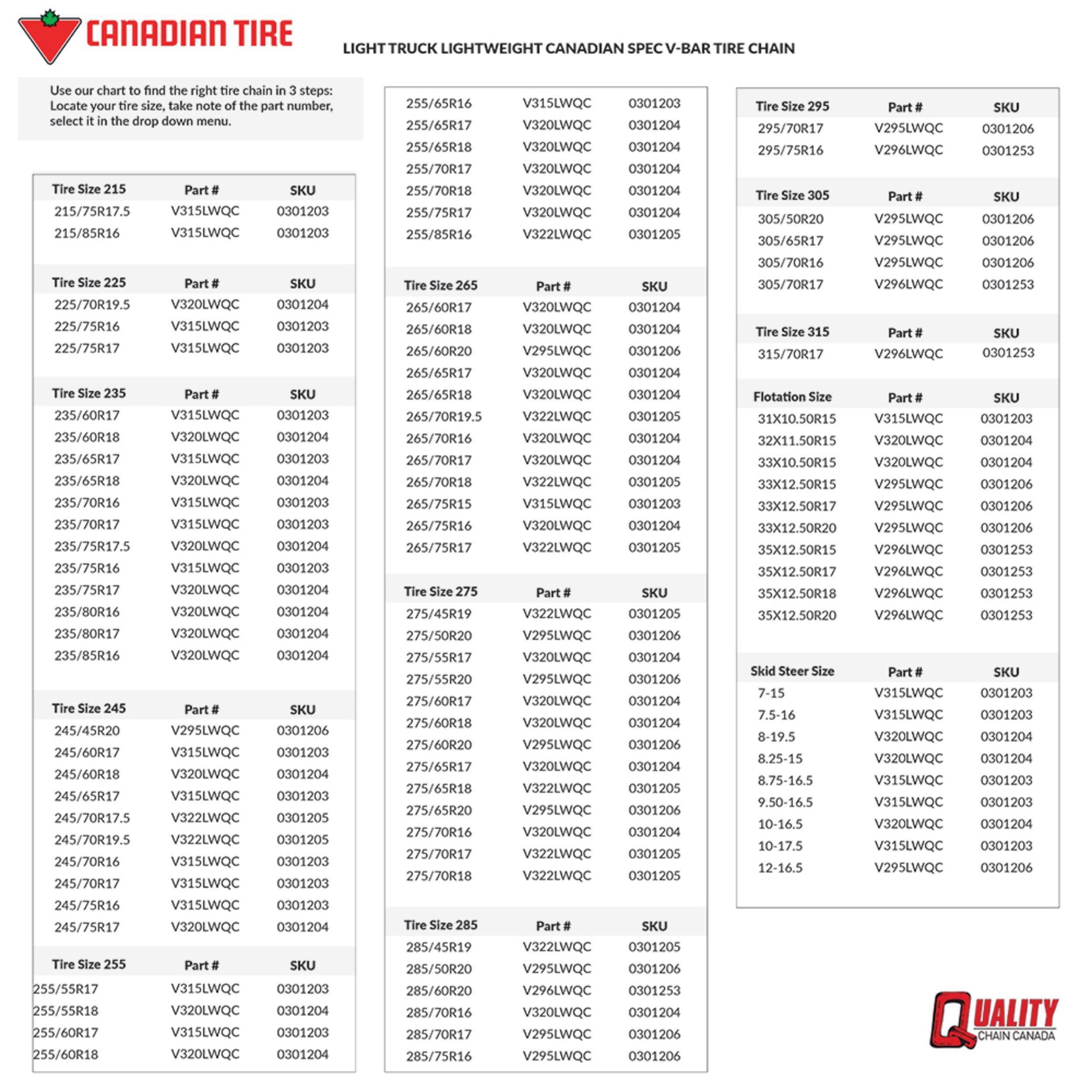 Keep your ride safe in winter weather with the Quality Chain Light Truck V-Bar Tire Chain. Featuring a cross chain design, these tire chains dig into the driving surface, providing excellent forward, backward and lateral traction on icy and snowy roads. The built-in cam side chain tensioning system and included T-bar cam tool make these tire chains easy to install and tighten as needed for no-fuss use.