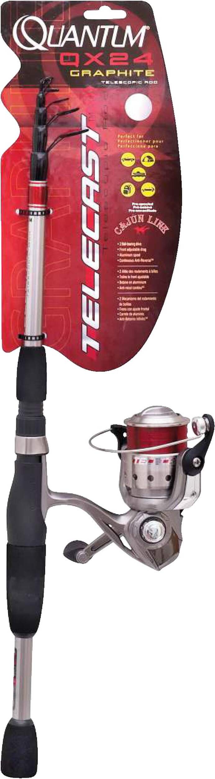 When you're packing light and moving quickly the Quantum QX24 spinning rod and reel is a space-saving essential for the committed angler. A lightweight yet powerful fishing combo, the medium-light action Telecast graphite rod blank extends from 18.5 to 78-inches (47-188 cm) while the size 30 aluminum anodized reel comes pre-spooled with 10 lb line for smooth casting and cranking. Ideal for backpacking and canoe tripping, the compact telescoping design is practical and convenient.