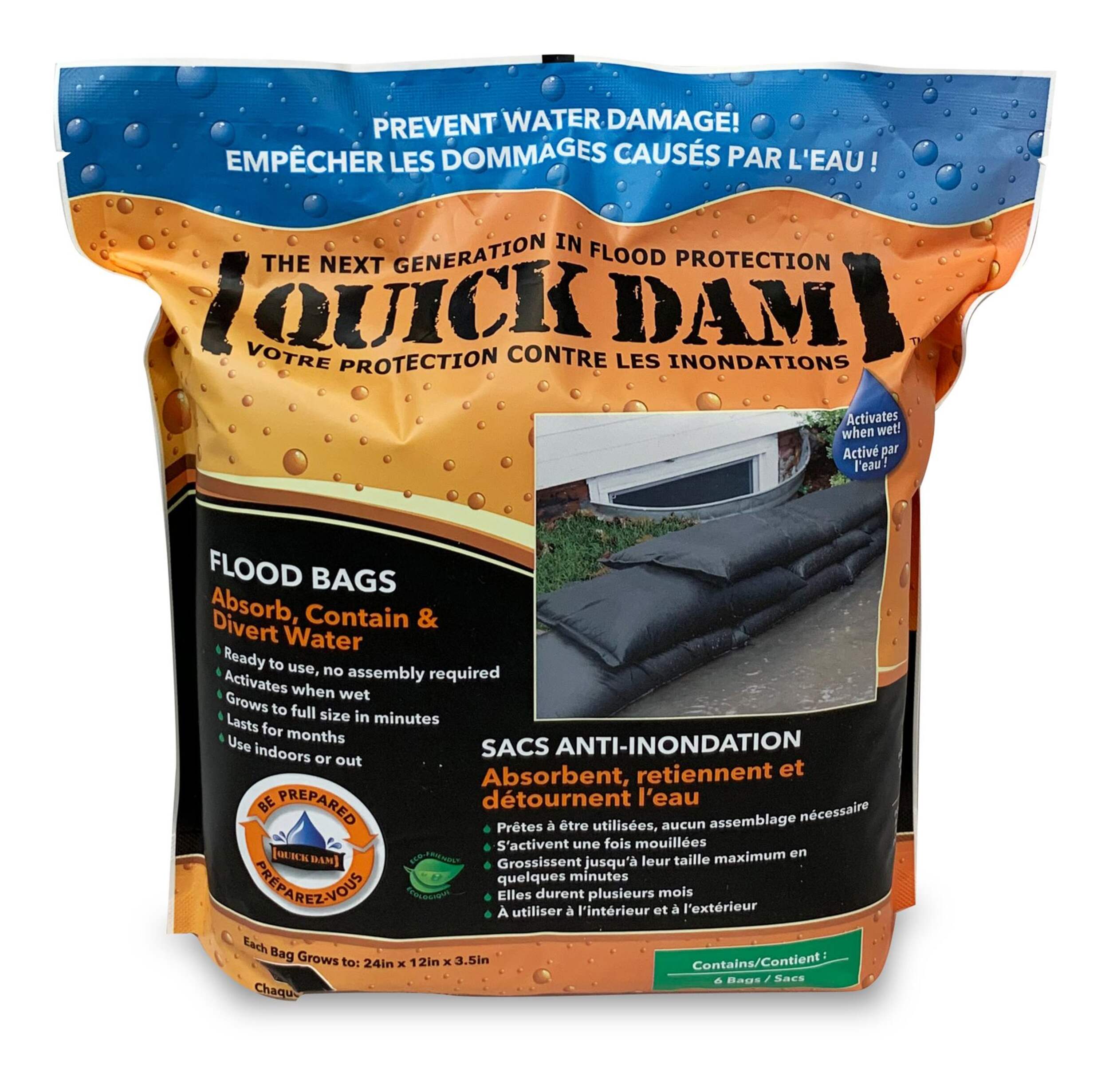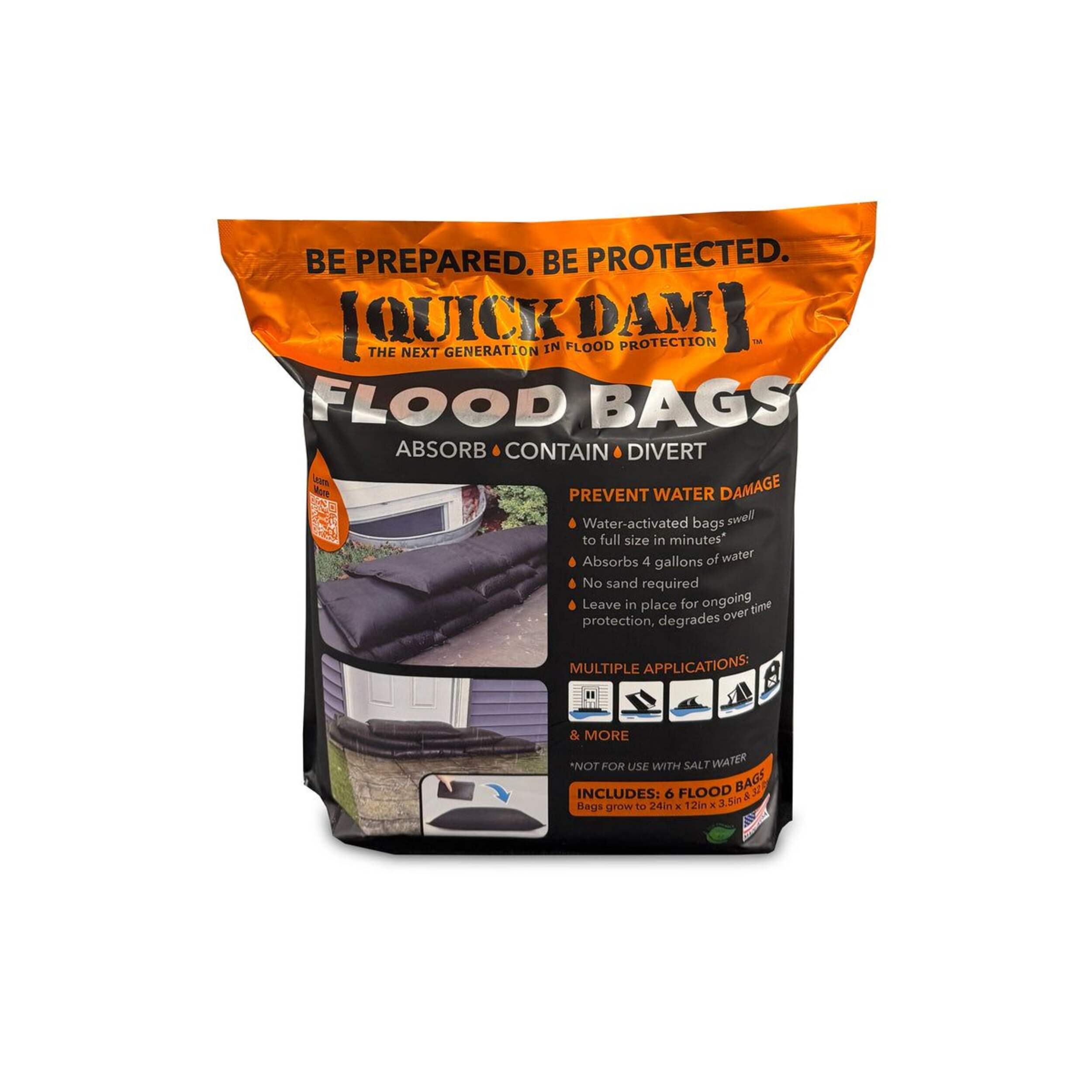 Quick Dam Flood Bags/Sandless Sandbags absorb, contain and divert problem flood water. Flood Bags absorb, swell and gel oncoming water on contact to create a durable barrier. They are compact, lightweight and easy to set up, perfect to keep stored away until needed. Ready to use with no assembly required, the flood bags help you keep your home and property protected from the dangers of flooding. They are available in a convenient pack of six.
