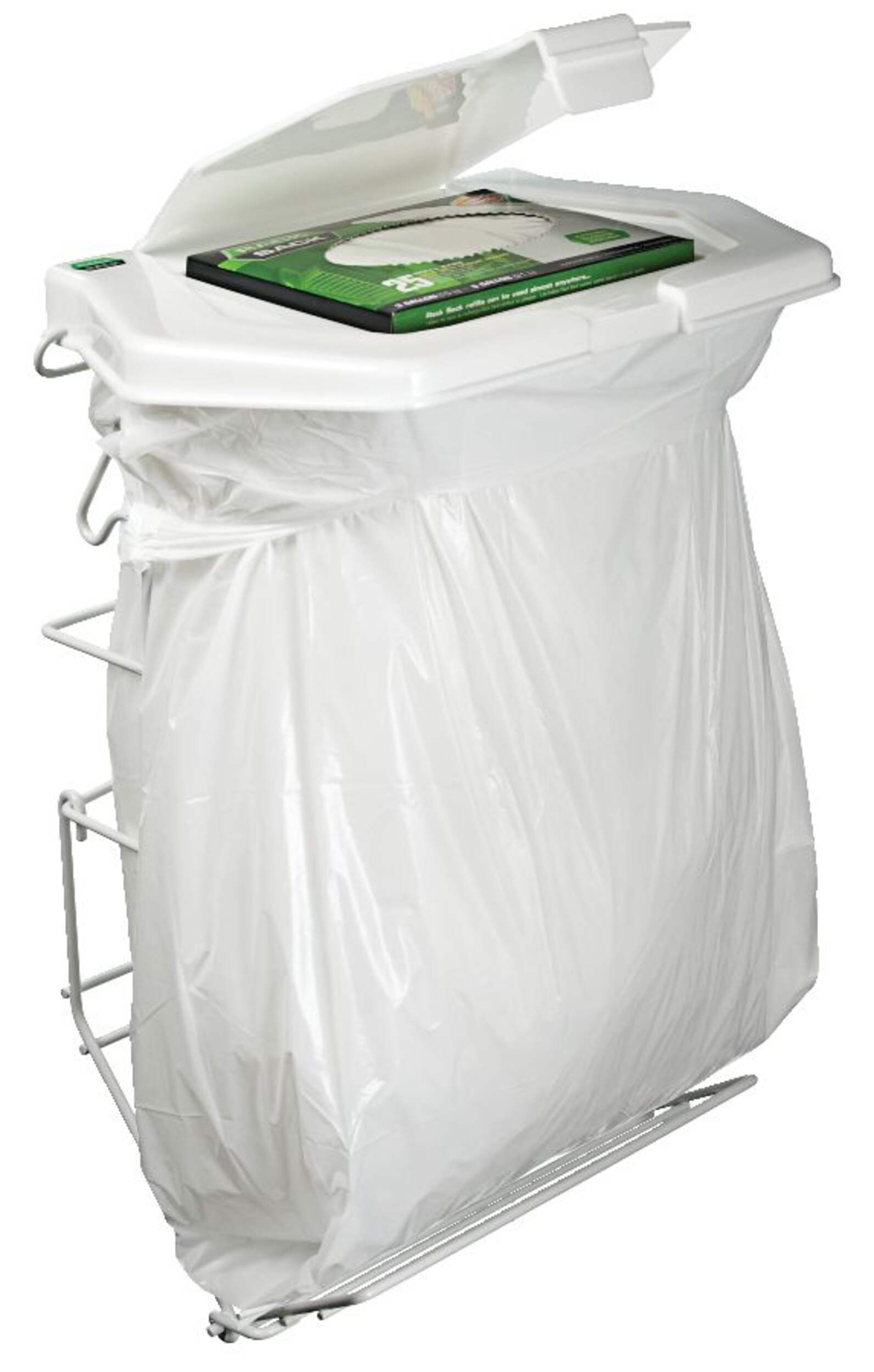 The Rack Sack Expandable Kitchen Garbage Bag Holder makes it easier to handle household clean-ups. Its adjustable steel frame fits both 15-L and 21-L bags, while the recessed lid conveniently stores a 25-bag refill pack. Made of durable, powder-coated steel, this freestanding holder is designed for indoor use, offering a simple and effective way to keep your kitchen clean and organized. Holder comes with five bags.