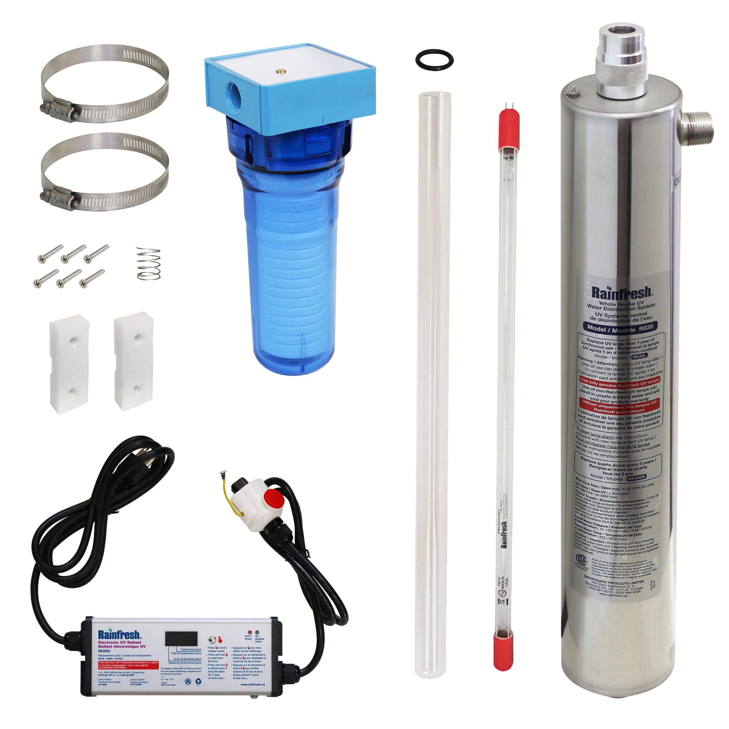 Includes whole house pre-filter with fine pore 5 micron (nominal) sediment cartridge (62-1037, 2pk) to reduce sediment, dirt, rust, algae, loose scale. Also includes UV lamp (62-1008) (does not include pipe or fittings)
