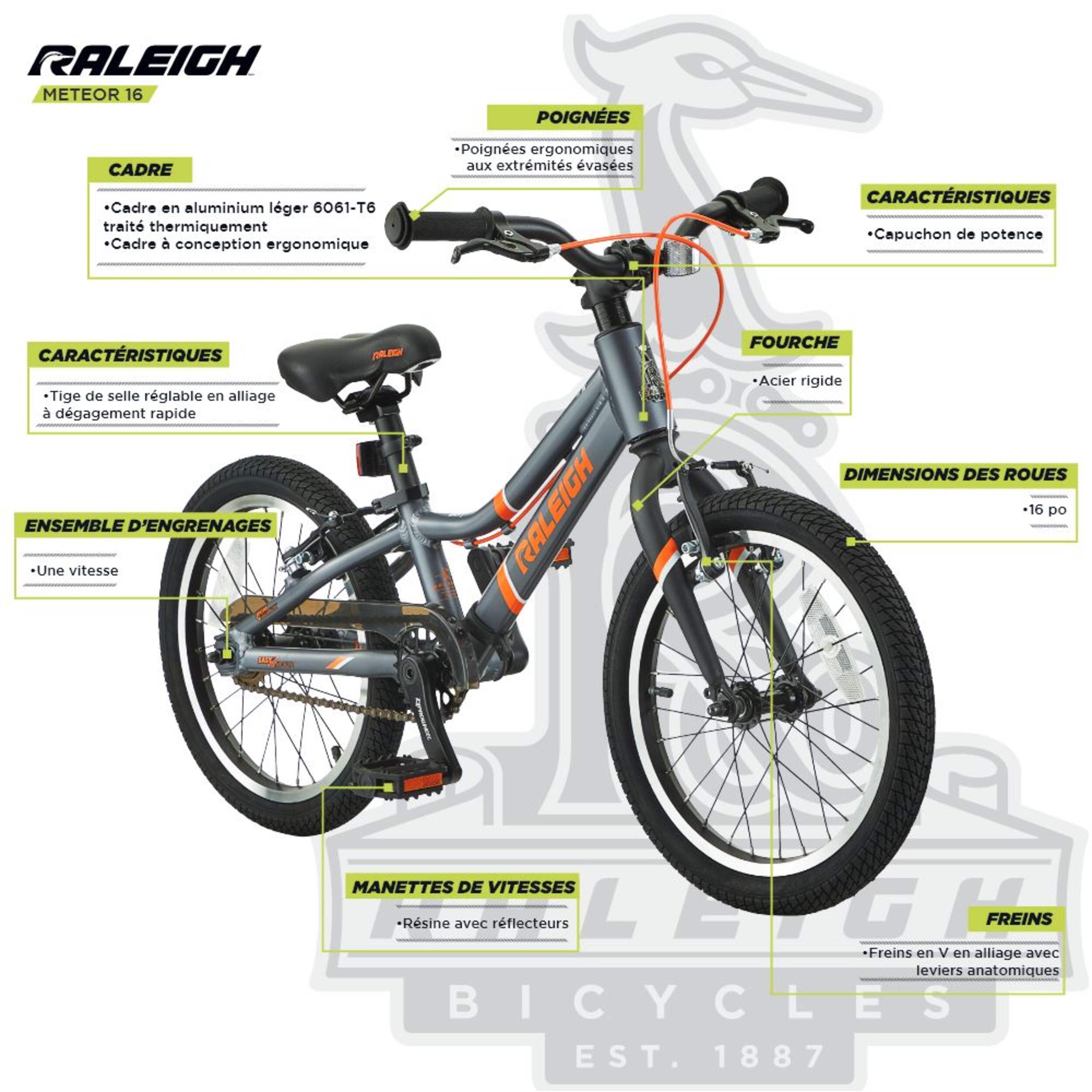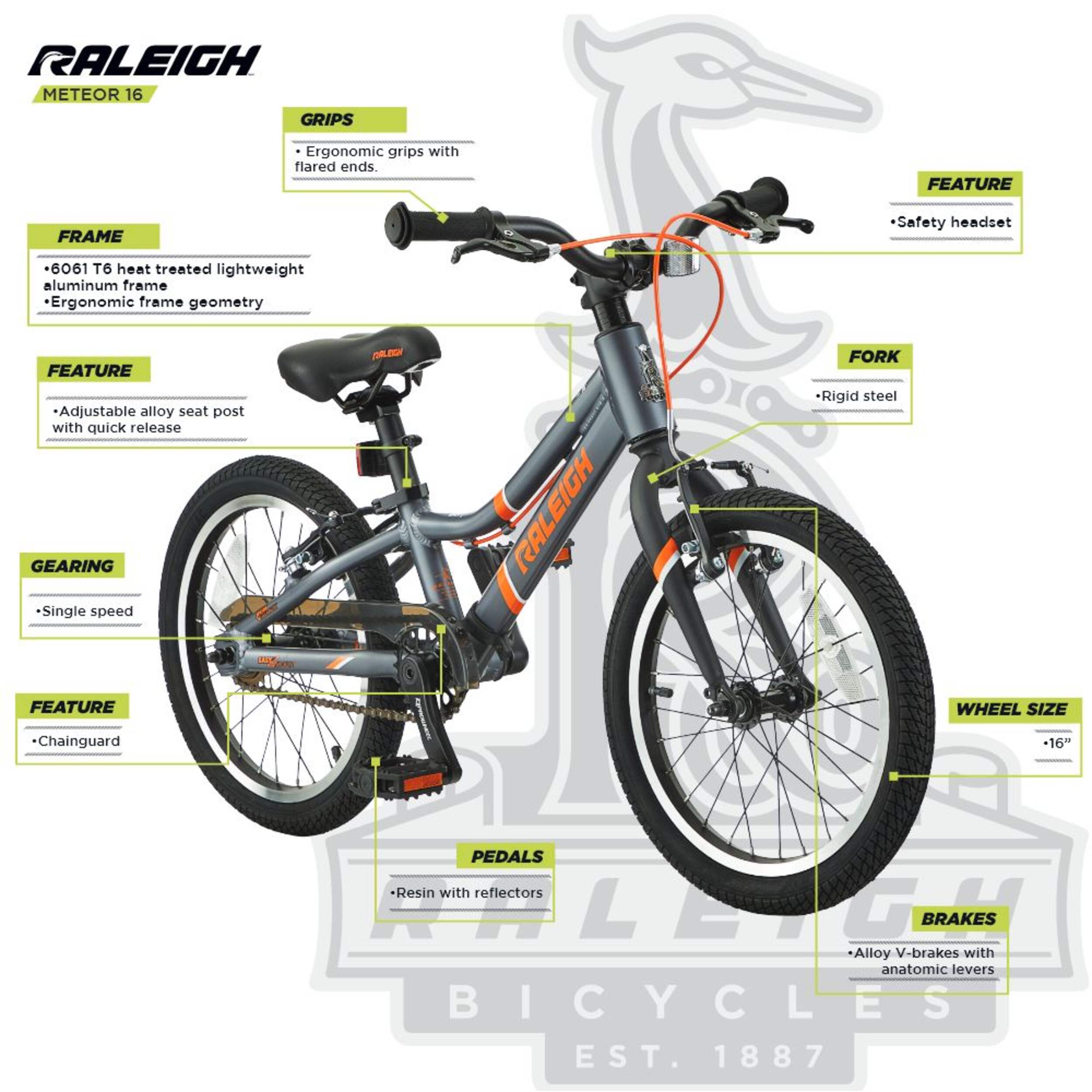 With its safety-focused build and modern alloy components, the Raleigh Meteor Kids Bike is a reliable and easy-riding bike for urban and suburban riders. It’s designed for comfort and control. This bike features front and rear alloy V-brakes with ergo levers for responsive stopping power. The anatomically designed grips and levers provide a natural feel, while the alloy seat post with its integrated clamp can provide a more customized fit.