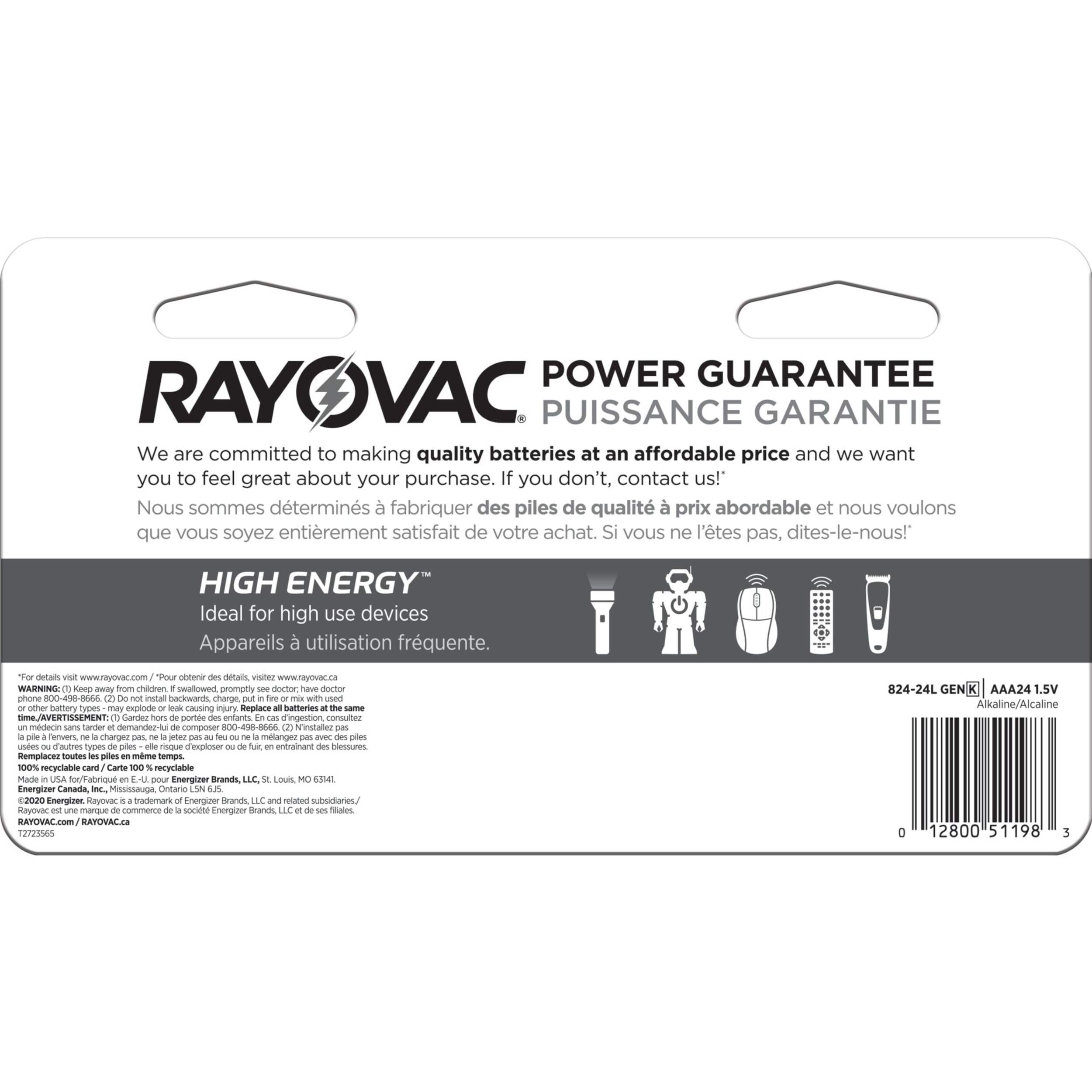 Keep your household powered with Rayovac HIGH ENERGY™ AAA Alkaline Batteries. Designed for exceptional, long-lasting performance, these batteries are perfect for high-use devices throughout your home. Rayovac rigorously tests each battery to ensure reliable performance, delivering exactly what you need. These Alkaline AAA batteries can last up to a decade in storage, making them ideal for emergencies. For dependable energy in the devices you use every day, trust Rayovac AAA batteries to keep everything running smoothly.