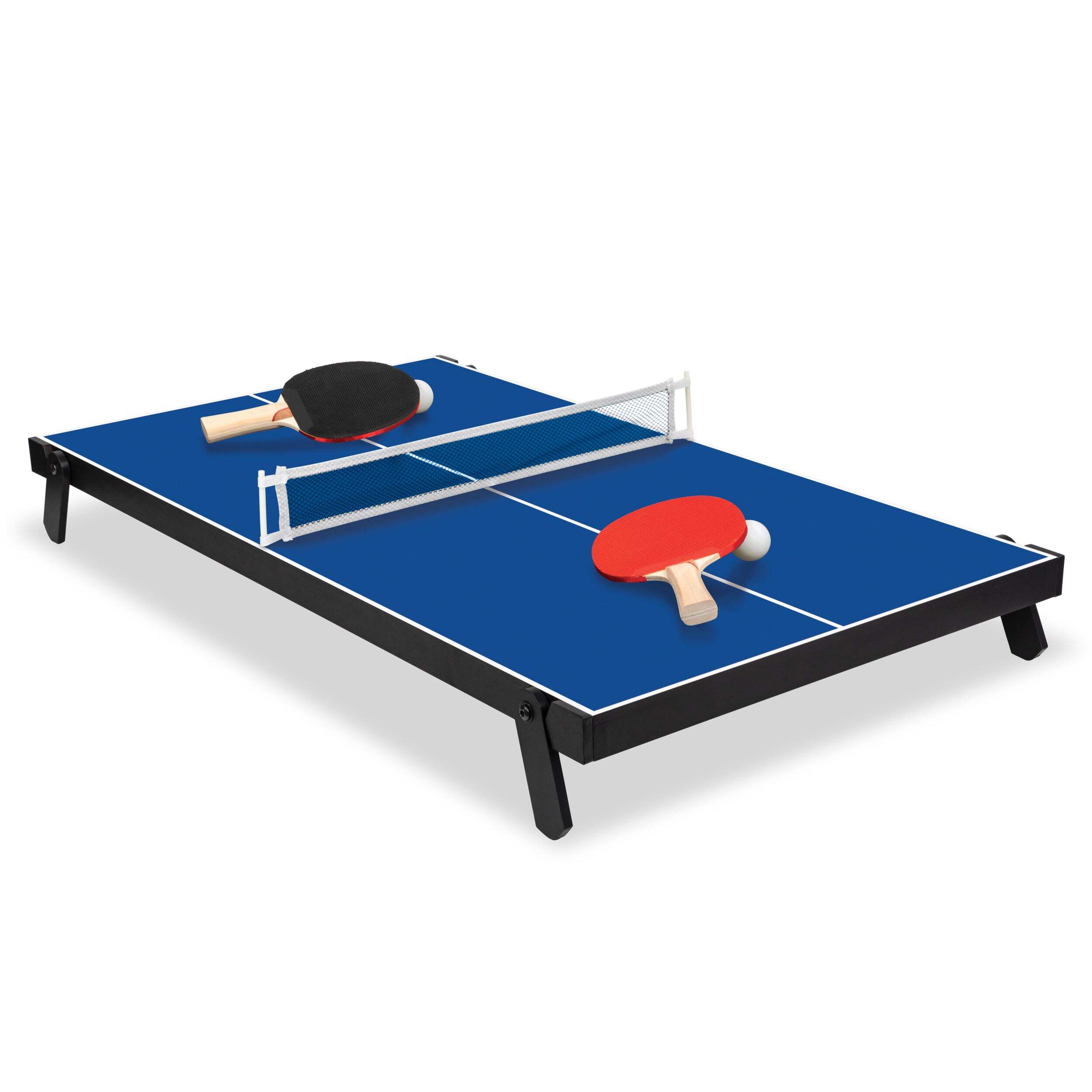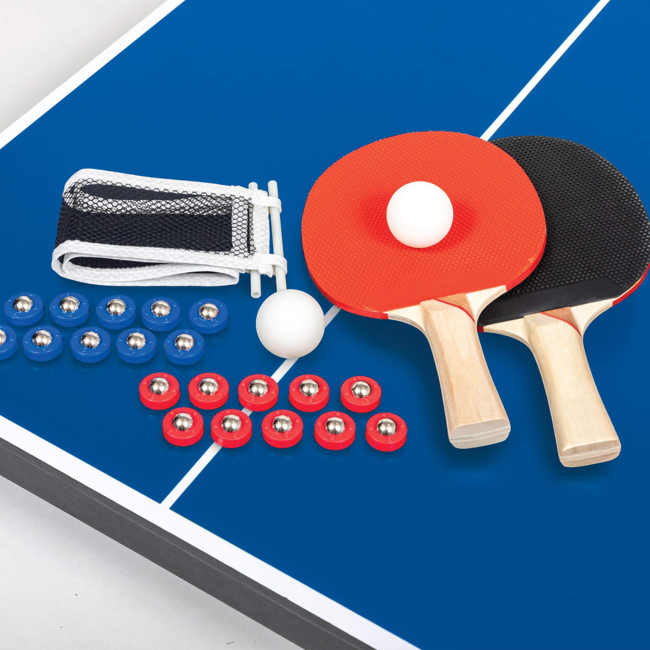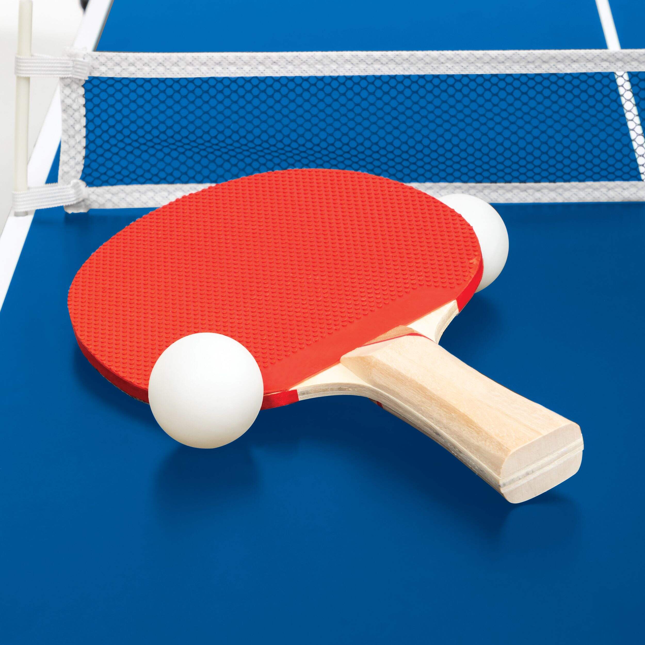 Includes 2 pips-out paddles, 2 table tennis balls, 1 net and post set, and 20 ball bearing sliders in 2 team colours