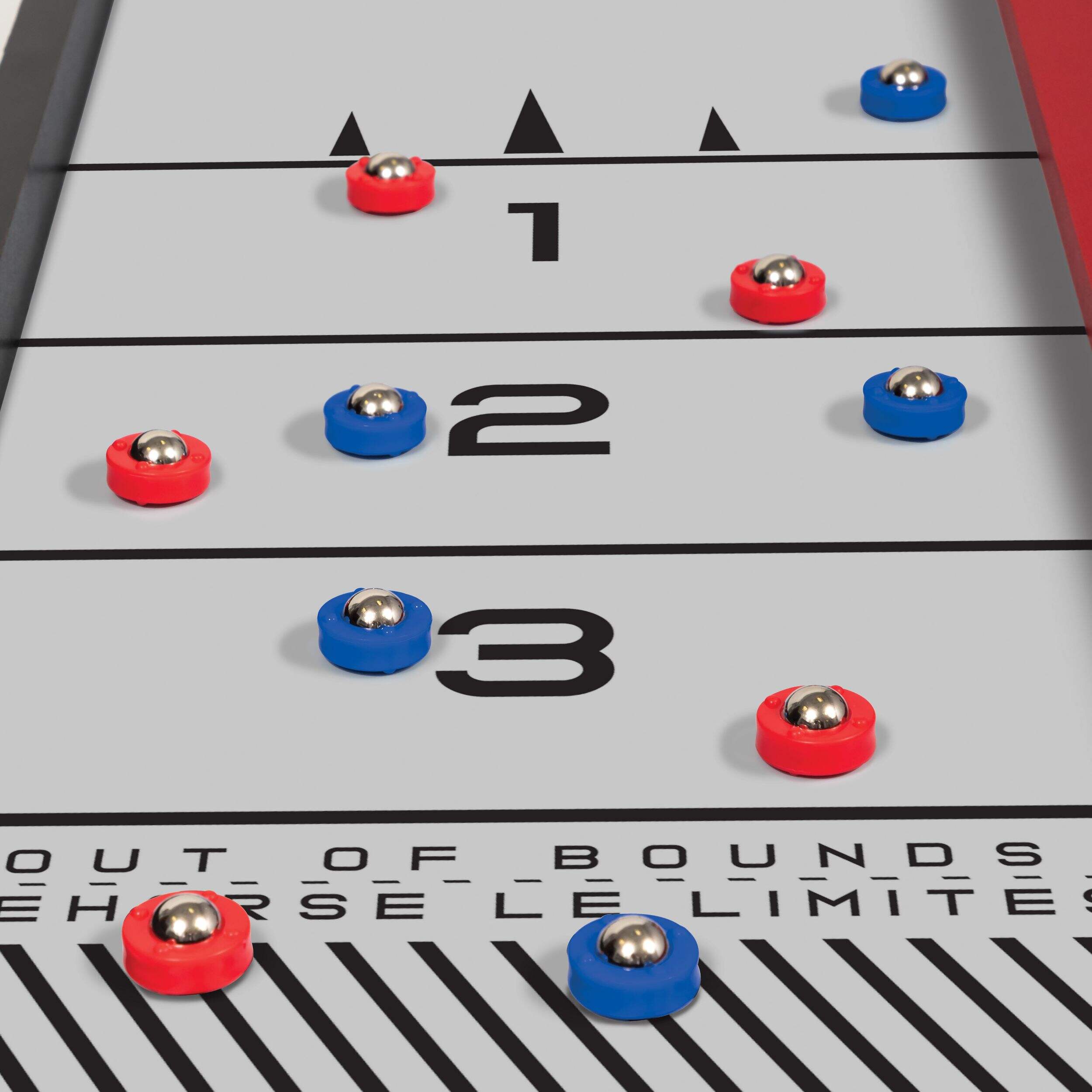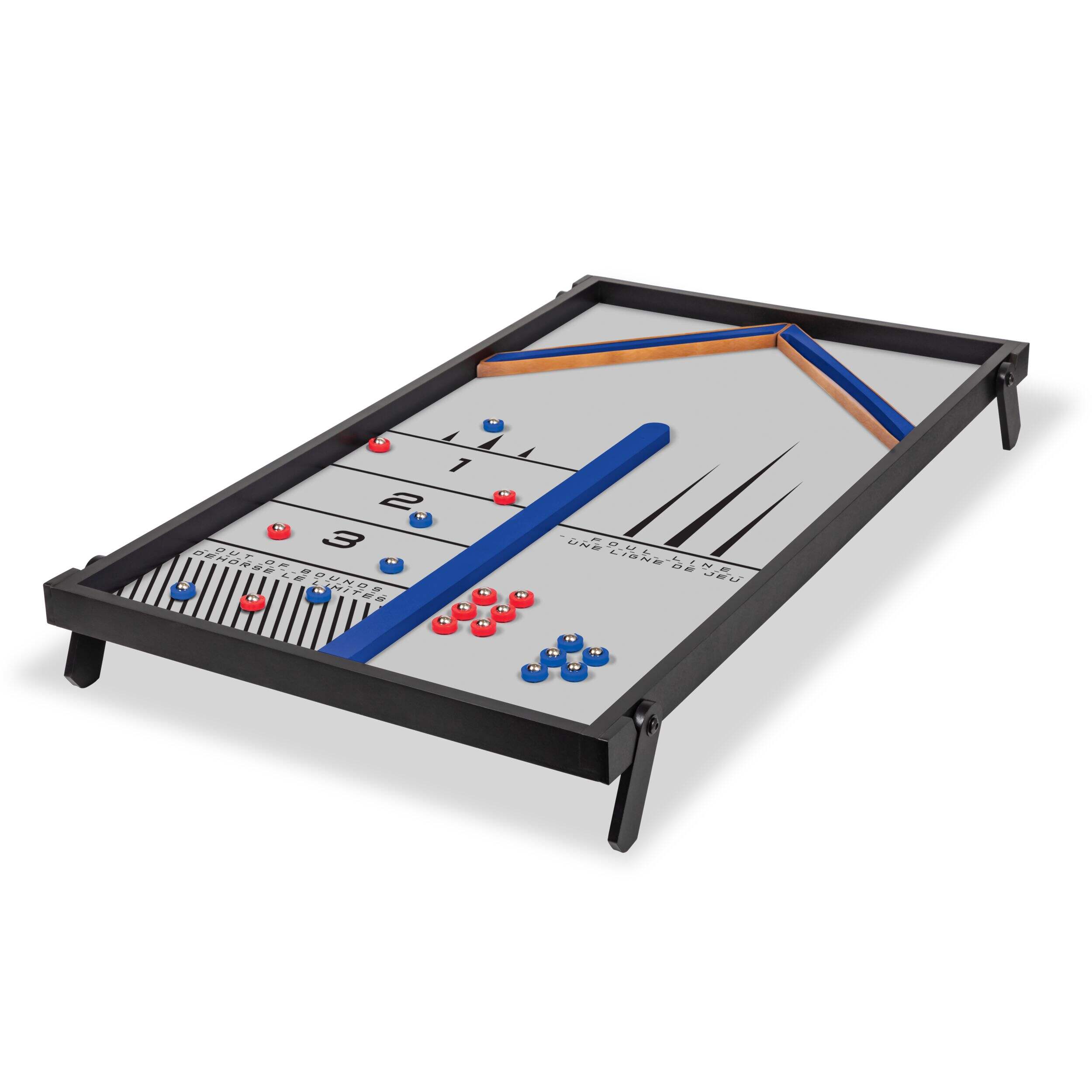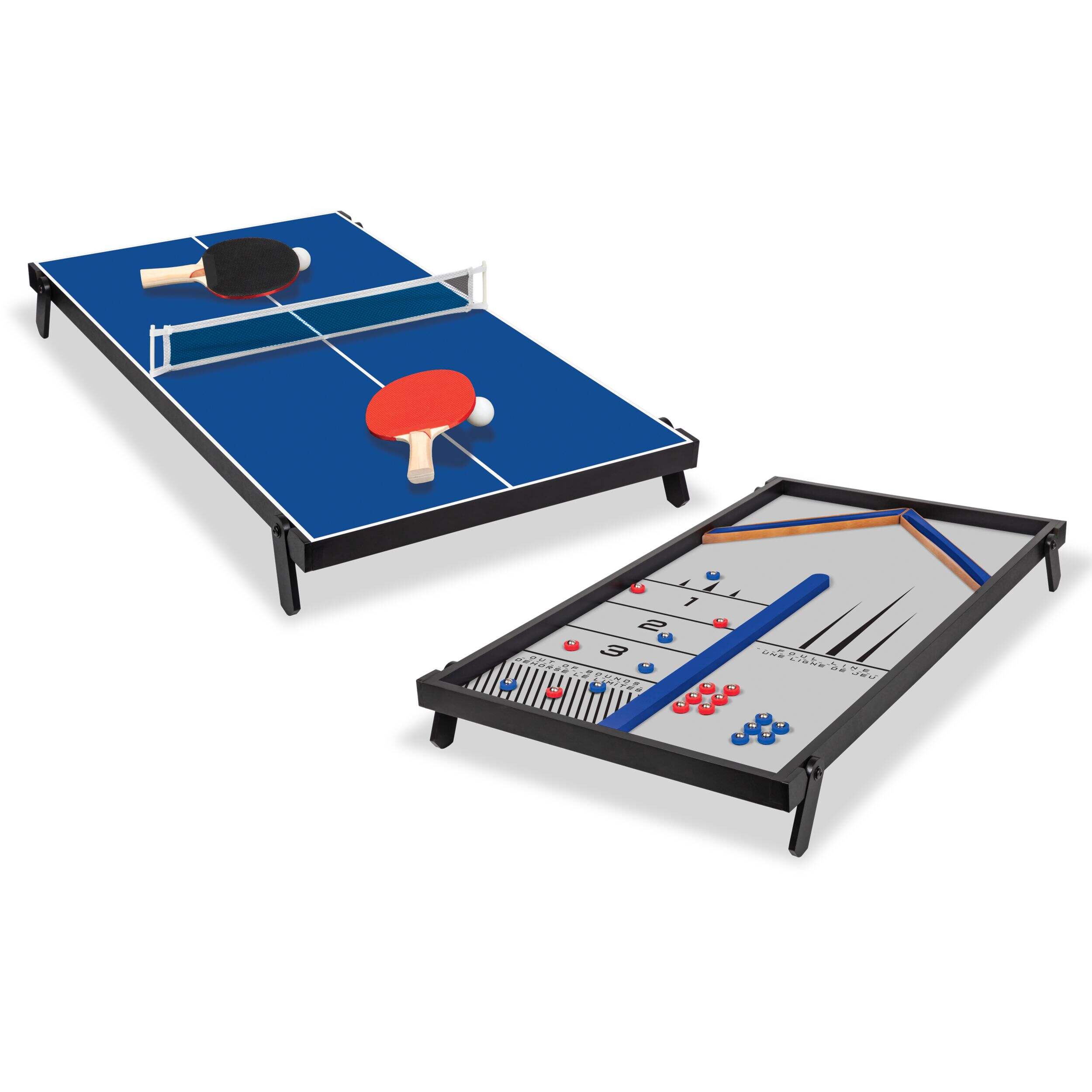 The Rec-Tek 2-in-1 Mini Table Tennis/Ping Pong & Shuffleboard Game Table Set is your gateway to versatile gaming fun. With its easy setup and storage design, it's ideal for impromptu matches on an existing tabletop or any flat surface. The innovative flip leg system allows you to switch effortlessly between table tennis and shuffleboard, ensuring hours of entertainment. This set comes complete with everything you need, including paddles, table tennis balls, a net and post set, and ball-bearing sliders in two team colors. Its compact dimensions of 40" x 20" x 2" (101.6 x 50.8 x 5 cm) make it a perfect addition to your home for family gatherings and friendly competitions, providing endless gaming excitement for all ages.