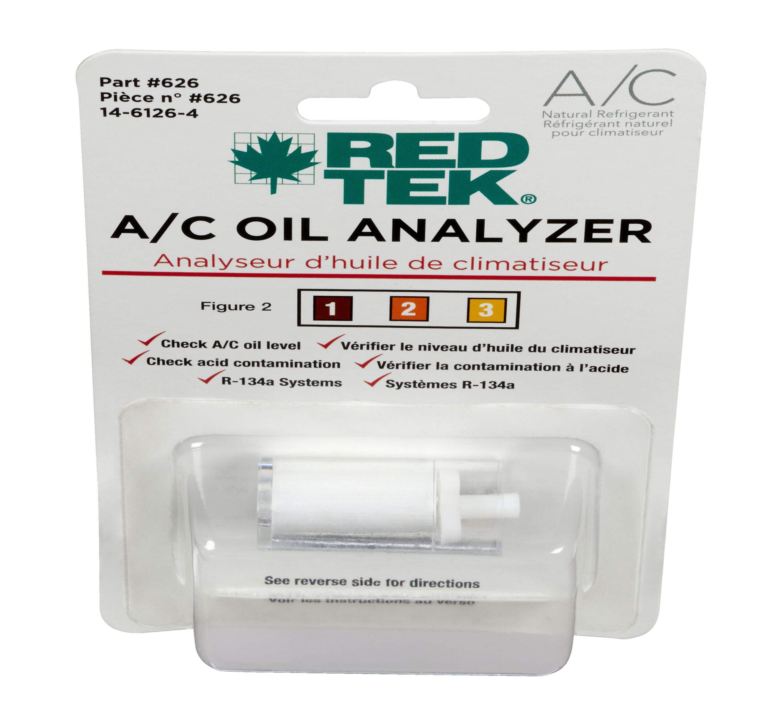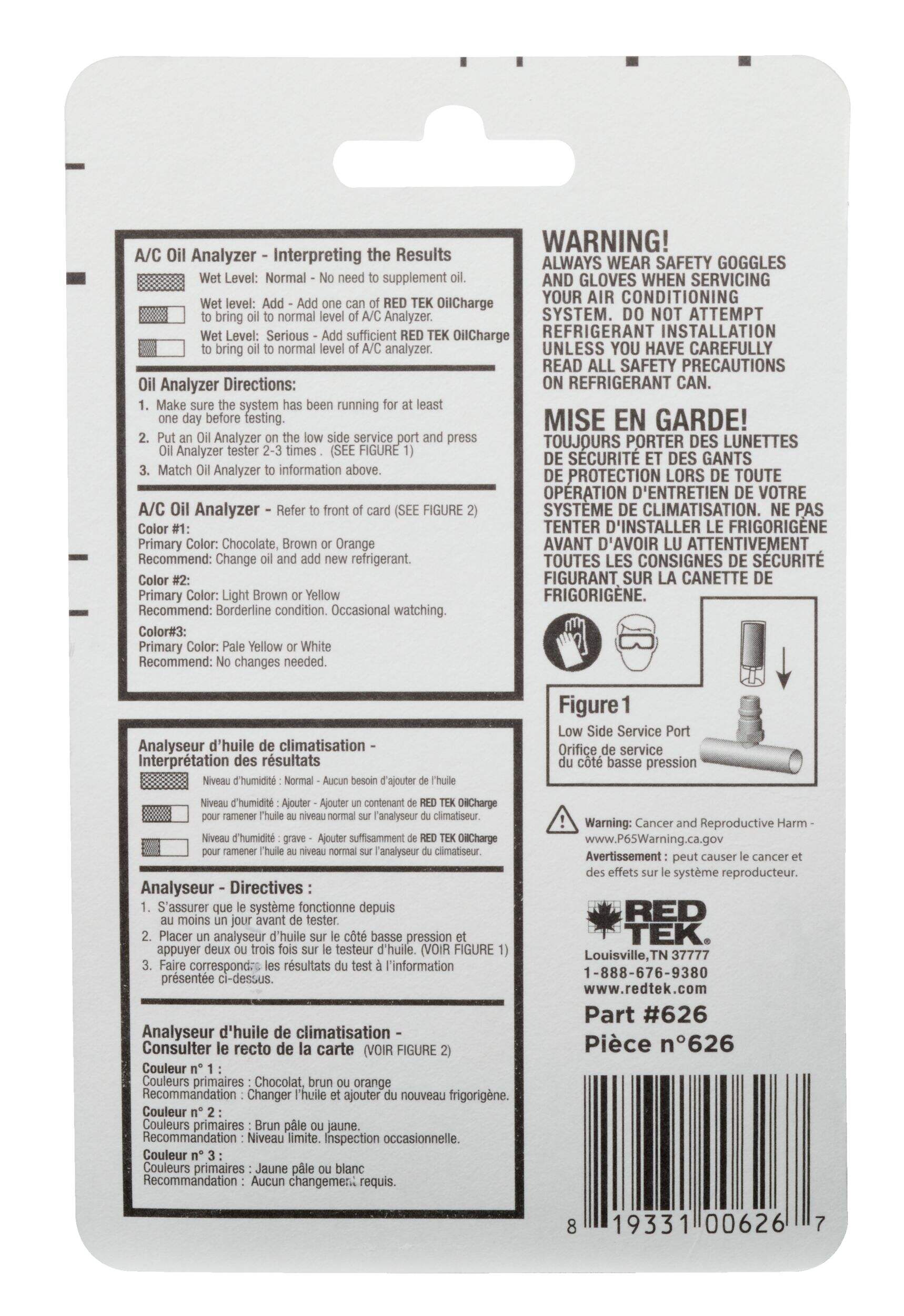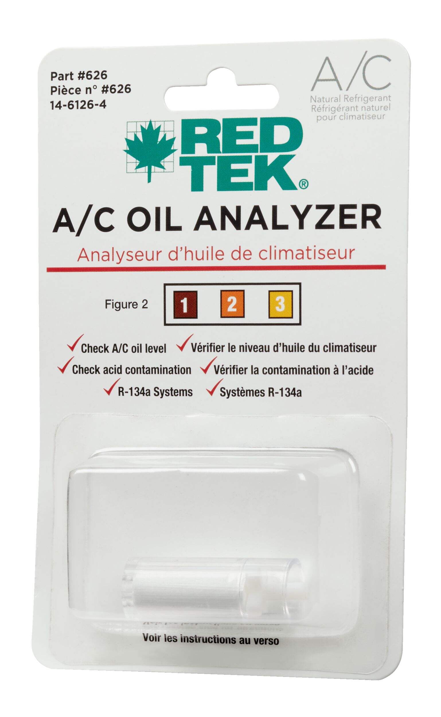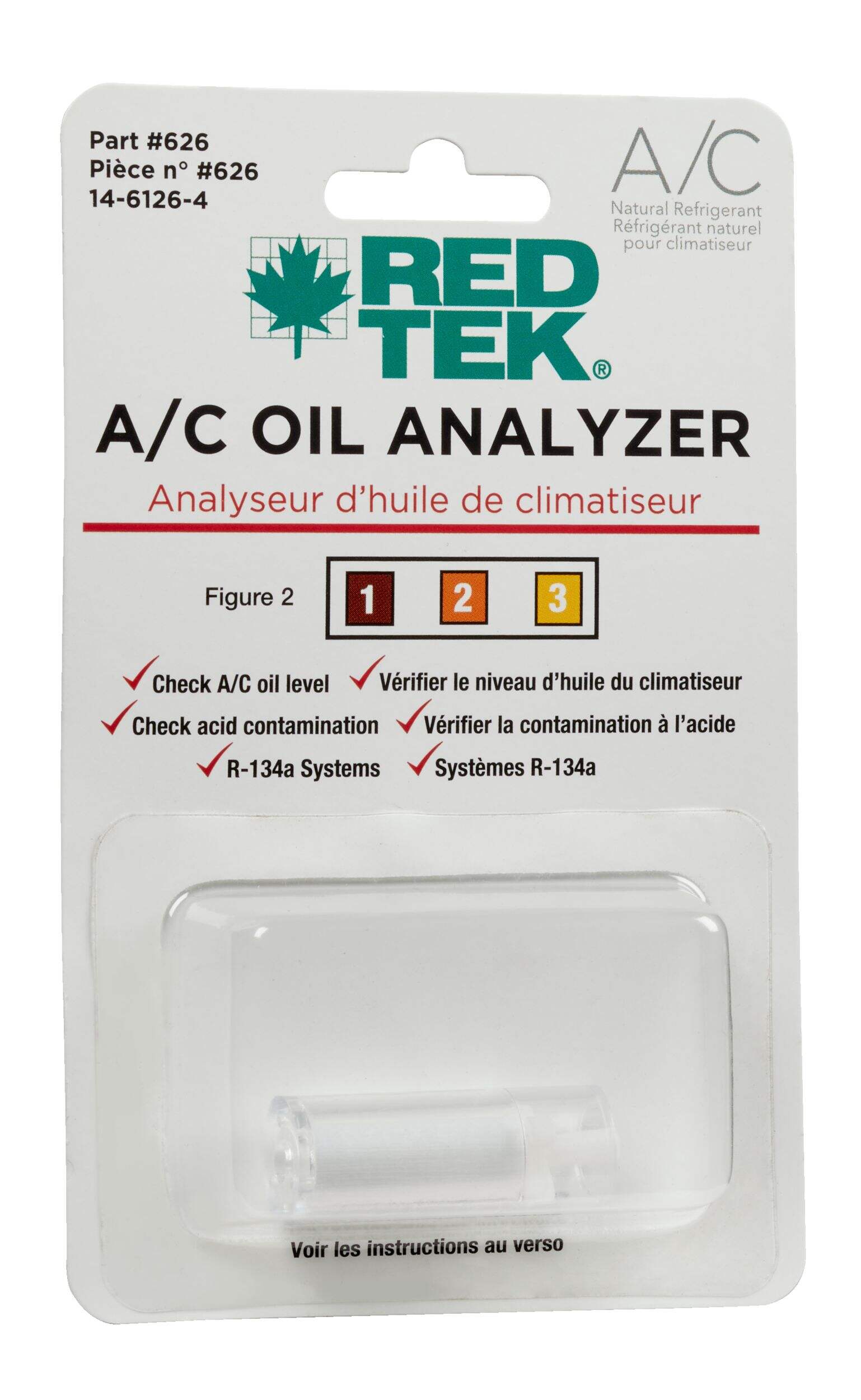 RED TEK R134a A/C Oil Analyzer is designed to quickly check A/C oil level and acid contamination. Simply depress oil analyzer over the low side service port and use chart on reverse of packaging to determine results. Use to determine if RED TEK Oil Charge A/C Lubricant is required.