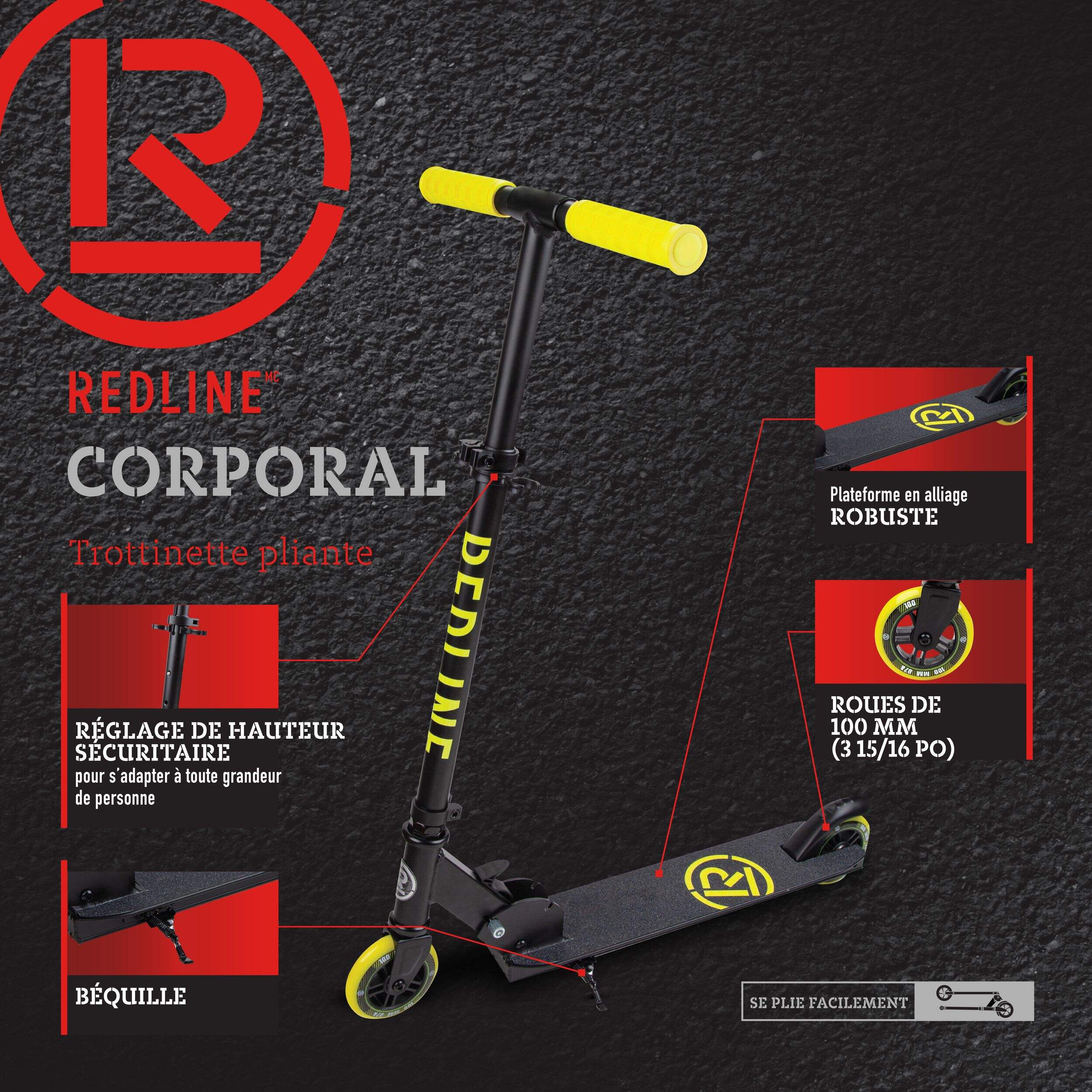 The Redline Corporal Adjustable Kick Scooter offers a smooth and reliable ride for riders of all ages. Equipped with 4-inch wheels, this scooter ensures stability and control on a variety of surfaces. The adjustable handlebars allow for a customized fit, making it suitable for both kids and adults. With a durable frame and sleek black design, the Redline Corporal Scooter combines style with functionality. Its lightweight build and foldable design make it easy to carry and store, making it ideal for commuting, outdoor fun, or casual rides.