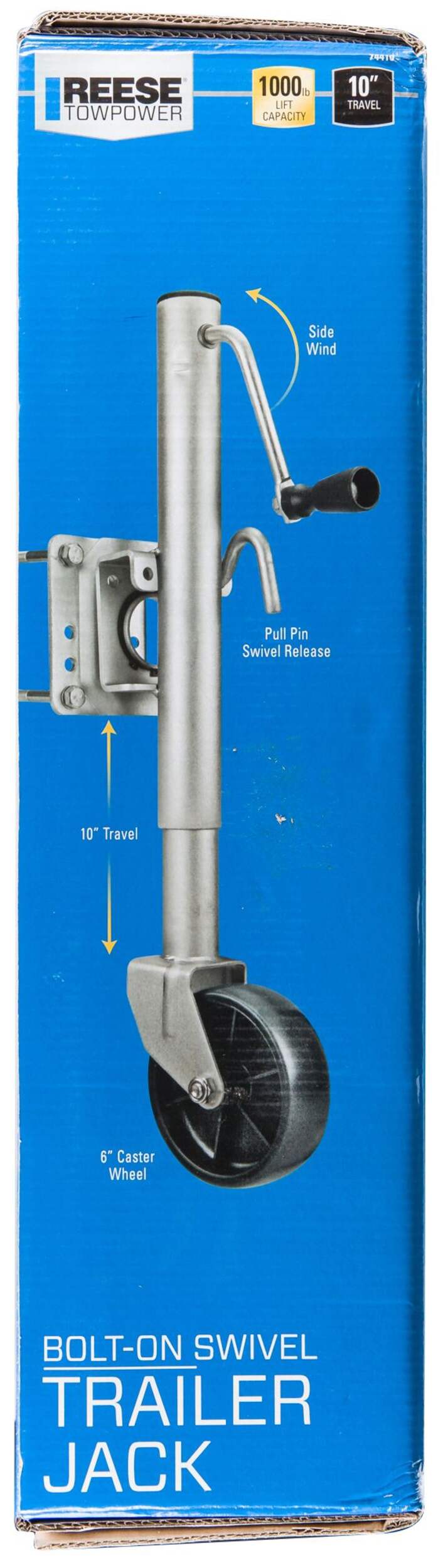 REESE Towpower trailer jack features a heavy-duty swivel mechanism that makes it easy to use and store. It operates in seconds with the pull-pin swivel release, and wire-grip knob handle allows for smooth jack operation.