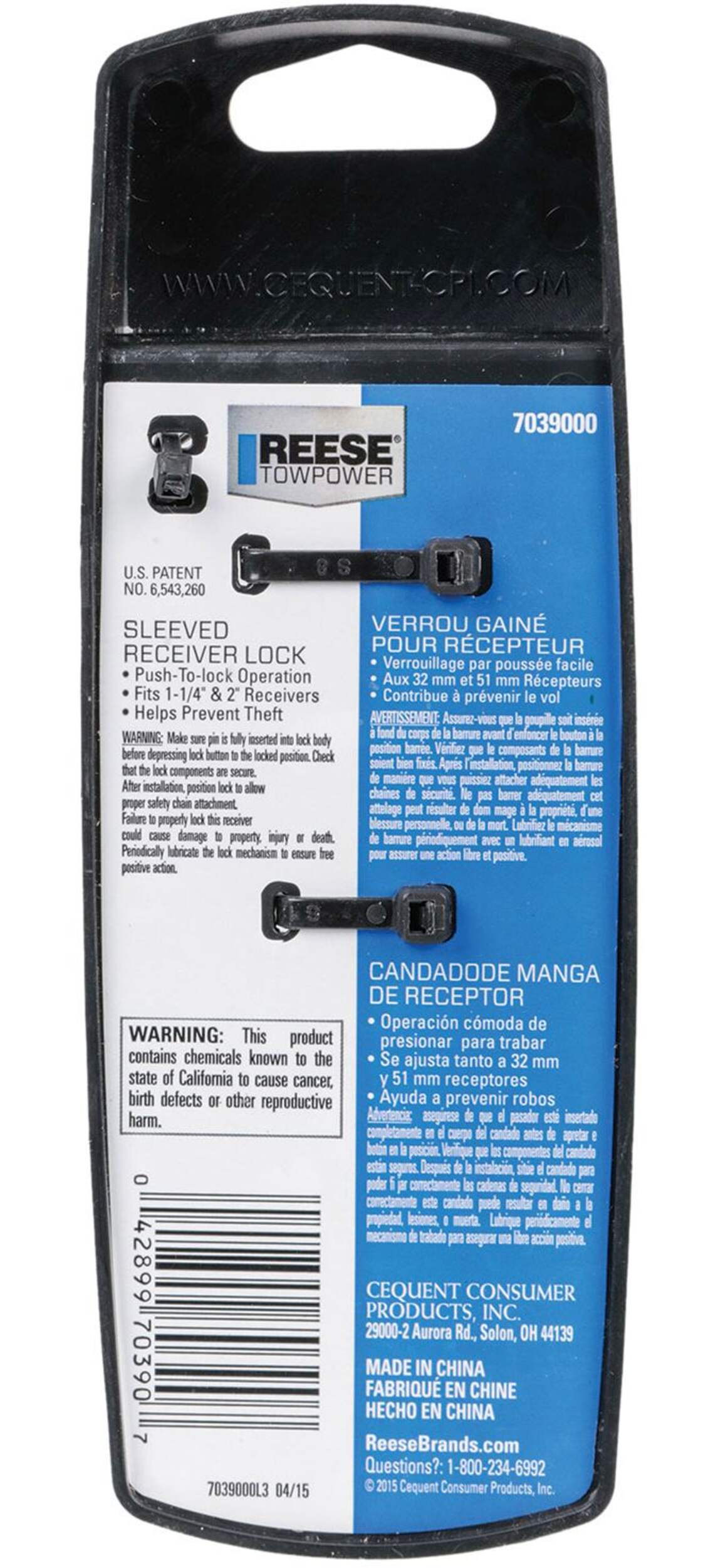 The REESE Towpower Class I-IV Black Nickel Receiver Lock offers reliable security for your trailer and hitch, ensuring peace of mind while you're away. Its versatile design accommodates 1-1/4" and 2" receivers, making it ideal for a variety of towing setups. The black nickel finish enhances durability and corrosion resistance, while the push-button lock mechanism allows for quick and effortless use.